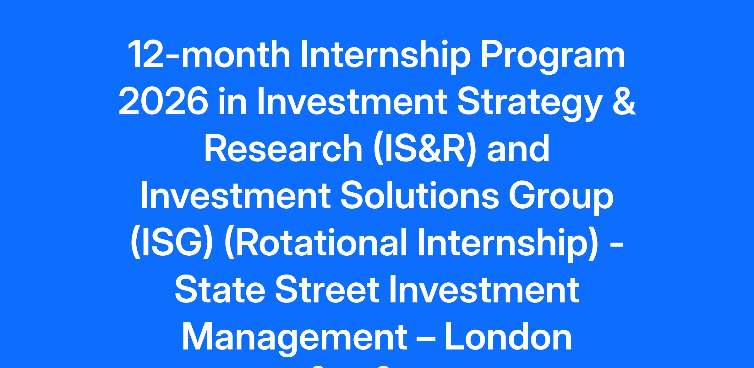 What we can offer you: Investment Strategy & Research (IS&R): Be a part of a team dedicated to developing, producing, and delivering State Street IM’s Investment Strategy across all our products and for all our clients in Europe. Learn about markets and investments with a view to providing solutions to our clients. You will also work with teams across State Street Bank. Investment Solutions Group (ISG): The Investment Solutions group manages 421.74 billion USD as of June 2024 and is a strategic partner for State Street IM’s clients that provides integrated multi-asset capabilities, total portfolio solutions, global resources and expertise. Who we are looking for: Our 12-month Internship Program is designed for high potential students like you, placing you in our most impactful roles and preparing you for future success. From day one, you will experience a collaborative and dynamic company culture. Primary Responsibilities IS&R: Assisting in the execution and delivery of investment research for bespoke client projects. Assisting in the development and publication of Thought Leadership on key investment topics of interest to State Street IM’s clients worldwide. Updating and keeping current State Street IM’s Global Market Outlook (GMO) – Our flagship Thought Leadership publication. ISG: Work with Portfolio Management in London and the broader EMEA team on specific projects to help the PM team on day to day and week to week portfolio management and monitoring activity. Assist the investment team in designing specific portfolio dashboards as required. Review research produced by sell side, third party research providers and academic world. Program dates: 22nd June 2026 – 21st June 2027 You must be available to participate in the program in person in the United Kingdom, starting from day one and for its full duration. Additionally, you are required to work from the office 4 days a week. This Program includes: A structured learning and development plan, specific job-related training, professional development, and soft skills training. A buddy who can offer you their experience, knowledge, and guidance throughout your internship. Dedicated networking events. Leadership and business-related sessions with Senior Management. The possibility to grow your professional network by joining our Employee Networks like the Professional Women’s Network, Pride, The Disability & Inclusion Network, Environmental Sustainability Network, StreetSmart Network, NextGen Network. Skills: These skills will help you succeed in this role. A genuine interest in global financial markets. A pre-existing knowledge of broad financial concepts and instruments Strong analytical skills including advanced Excel data analysis, Python & VBA (preferable) programming and some familiarity with data sources such as Bloomberg, FactSet, Eikon DataStream etc. Confidence with written and verbal communication in English and preparing presentations in MS PowerPoint. Ability to work successfully in a self-motivated environment and collaborate closely across teams, regions and time zones. A strong work ethics and a desire to learn. Education: Third year students enrolled in full time undergraduate education currently in the penultimate year of their degree, in one of the following areas: Business, Accounting, Finance, Economics, Mathematics, Econometrics, Databases or related field. What happens next? Our recruitment team in India will review your application. Applicants selected to move forward will have a phone screening with the recruitment team. candidates who successfully pass the phone screen will be invited for a final round interview at our offices. About State Street Across the globe, institutional investors rely on us to help them manage risk, respond to challenges, and drive performance and profitability. We keep our clients at the heart of everything we do, and smart, engaged employees are essential to our continued success. We are committed to fostering an environment where every employee feels valued and empowered to reach their full potential. As an essential partner in our shared success, you’ll benefit from inclusive development opportunities, flexible work-life support, paid volunteer days, and vibrant employee networks that keep you connected to what matters most. Join us in shaping the future. As an Equal Opportunity Employer, we consider all qualified applicants for all positions without regard to race, creed, color, religion, national origin, ancestry, ethnicity, age, disability, genetic information, sex, sexual orientation, gender identity or expression, citizenship, marital status, domestic partnership or civil union status, familial status, military and veteran status, and other characteristics protected by applicable law. Discover more information on jobs at StateStreet.com/careers Read our CEO Statement About State Street Across the globe, institutional investors rely on us to help them manage risk, respond to challenges, and drive performance and profitability. We keep our clients at the heart of everything we do, and smart, engaged employees are essential to our continued success. We are committed to fostering an environment where every employee feels valued and empowered to reach their full potential. As an essential partner in our shared success, you’ll benefit from inclusive development opportunities, flexible work-life support, paid volunteer days, and vibrant employee networks that keep you connected to what matters most. Join us in shaping the future. As an Equal Opportunity Employer, we consider all qualified applicants for all positions without regard to race, creed, color, religion, national origin, ancestry, ethnicity, age, disability, genetic information, sex, sexual orientation, gender identity or expression, citizenship, marital status, domestic partnership or civil union status, familial status, military and veteran status, and other characteristics protected by applicable law. Disc