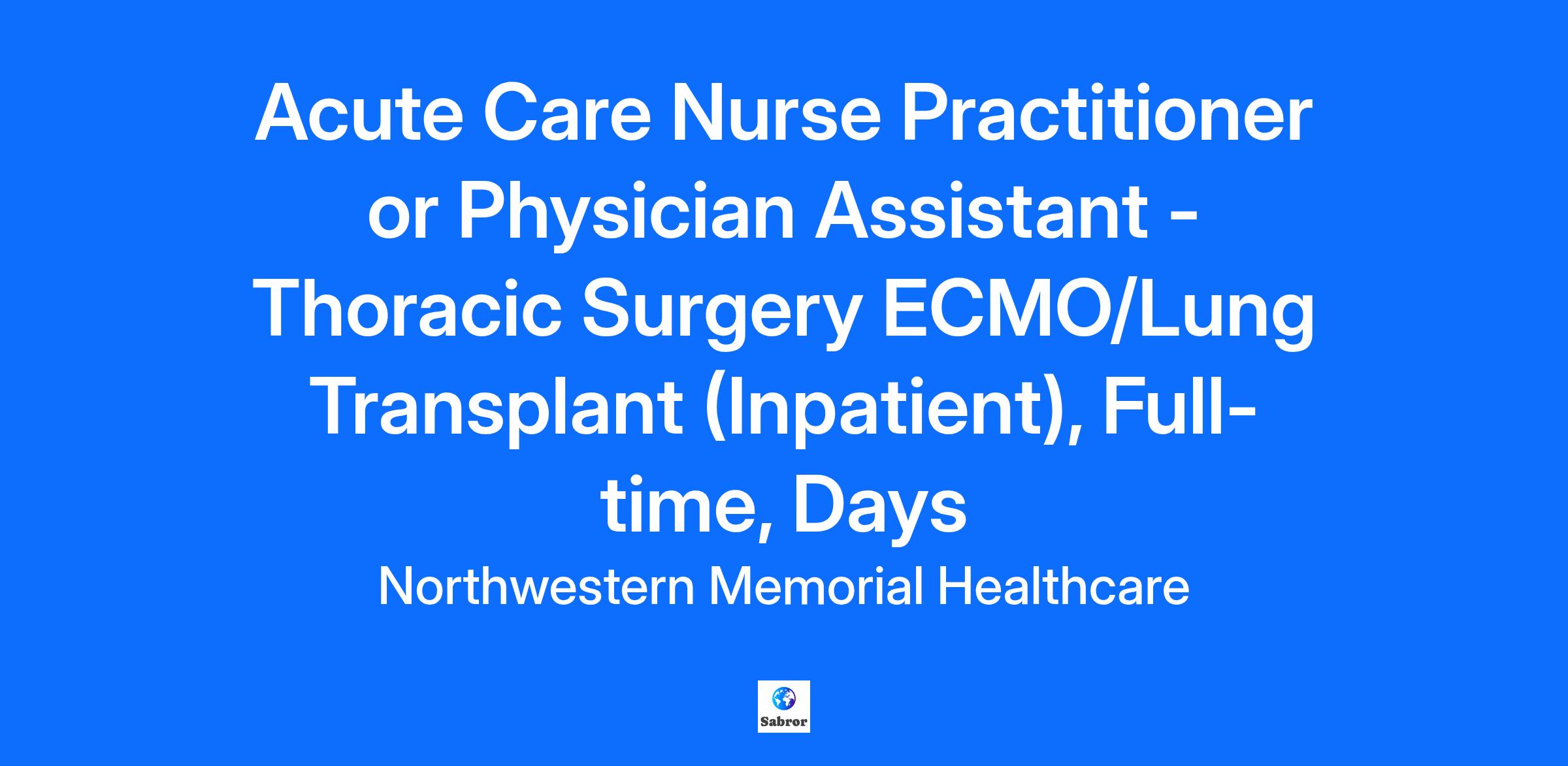 Northwestern Medicine has an exciting opportunity for either a Nurse Practitioner or Physician Assistant to join The Canning Thoracic Institute (CTI) as part of our Thoracic Surgery Team. CTI operates collaboratively across the Northwestern Medicine health system to advance our mission to deliver the highest quality care for patients with diseases of the chest, promote clinical innovation and discovery, and improve lung health in the Greater Chicago Community. This role is for an APP to join our Thoracic Surgery Team with focus on Advanced Lung Failure patients, primarily Lung Transplant and ECMO. The Thoracic Surgery Team works collaboratively with our Lung Transplant Team to support our rapidly growing Lung Transplant Program. The APP will provide critical care management in the CTICU pre and post-transplant as well as on the surgical floor to provide patient continuity. Some role responsibilities include ventilator and ECMO management as well as bronchoscopies and chest tube placement. OR assist for Lung Transplant and related procedures possible.