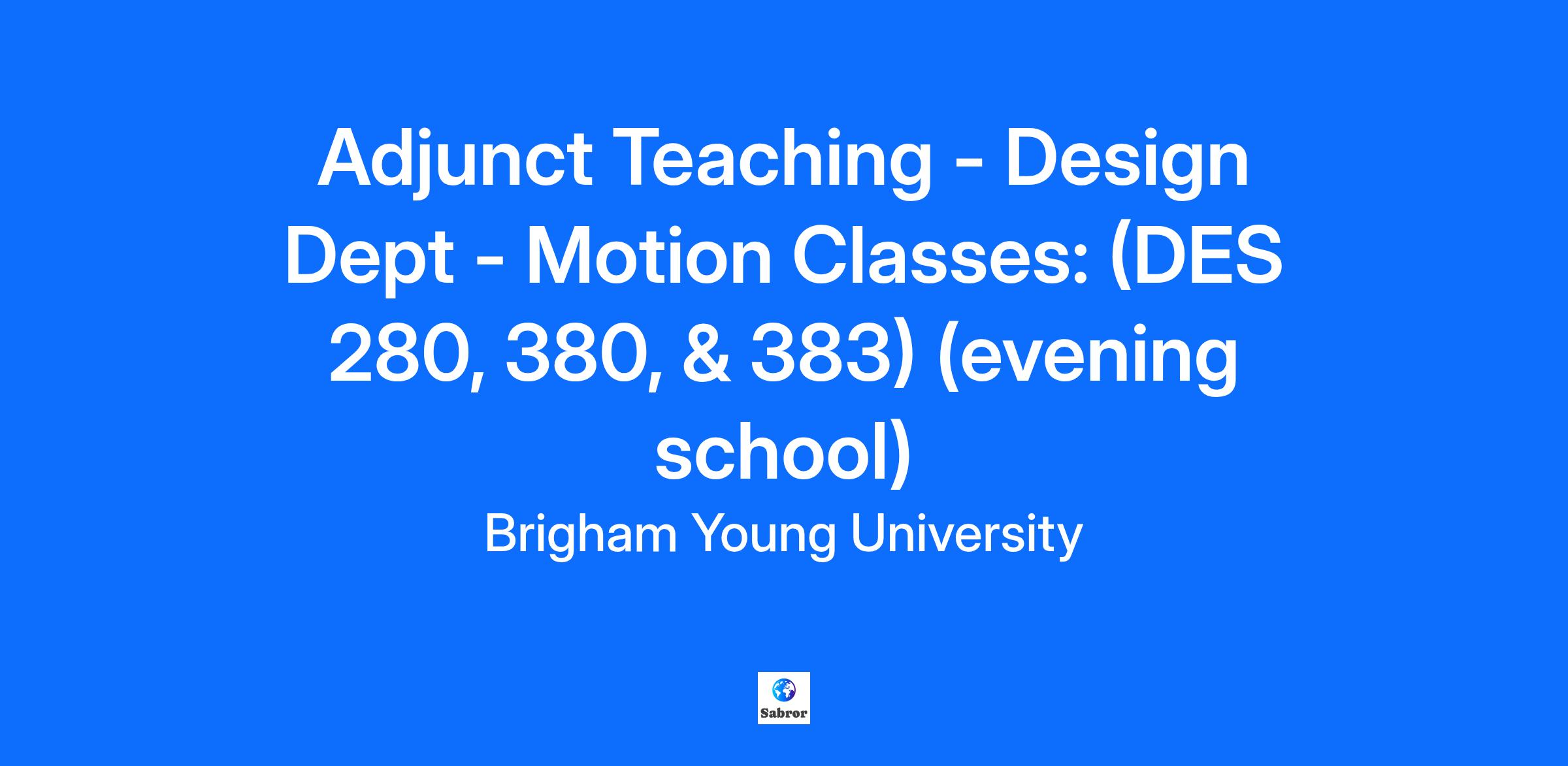 Job Title: Adjunct Teaching - Design Dept - Motion Classes: (DES 280, 380, & 383) (evening school) Posting End Date: December 3, 2025 *NOTE: Last day to apply is Tuesday, December 2, 2025, at 11:59pm (MST) Position Start Date: January 5, 2026 Required Degree: BFA required; MFA in Graphic Design preferred. The required degree must be completed by the start date. Preferred Experience: Experience with communication with college-level students and collaboration with colleagues in a collegial manner. Teaching technical concepts requires an efficient thinker with a unique and enthusiastic approach to helping students. Duties/Expectations: Teach undergraduate courses on a part-time basis using department-approved curriculum. Courses include DES 280: Motion Concepts, DESGD 380 Motion Design, and DES 383 Analog Motion or Interdisciplinary Motion courses. The position will require lecturing, creating assignments, grading, critiques, communicating/responding to student emails. Part-time faculty are not required to hold office hours, attend staff meetings, serve on committees, or mentor students. Documents Required at the Time of Application: Please attach your updated curriculum vitae and cover letter to the faculty application. Include a portfolio link on your cover letter. Note: Failure to attach the required documents may result in your application not being considered. This position requires the successful candidate to relocate and/or reside in Utah for the duration of their employment. BYU Mission Alignment BYU is committed to hiring faculty members who enthusiastically embrace and energetically advance its unique mission. It is anticipated that BYU faculty members will: (1) live a life of loyalty to Jesus Christ and His restored Church and align yourself with doctrines and teachings declared by living prophets, seers, and revelators; (2) demonstrate intentionality in building faith in Jesus Christ and testimony of His restored gospel among students and others in the BYU community; and (3) teach your subject matter with the Spirit of God and strive to keep it "bathed in the light and color of the restored gospel" (Spencer W. Kimball). Employment Requirements All new employees who are members of The Church of Jesus Christ of Latter-day Saints will be required to hold and be worthy to hold a current temple recommend. All employees are required to abide by the university's Honor Code and Dress & Grooming Standards. Preference is given to qualified candidates who are members in good standing of the affiliated church, The Church of Jesus Christ of Latter-day Saints. Successful candidates are expected to support and contribute to the academic and religious missions of the university within the context of the principles and doctrines of the affiliated church. Equal Opportunity Brigham Young University is an equal opportunity employer, including disability and protected veteran status. The mission of Brigham Young University — founded, supported, and guided by The Church of Jesus Christ of Latter-day Saints — is to assist individuals in their quest for perfection and eternal life. BYU employees must possess a commitment to the Mission of Brigham Young University and the Aims of a BYU Education. That commitment is demonstrated through the following behaviors, attitudes, and expressions: intentionality in building faith in Jesus Christ and testimony of His restored gospel among members of the BYU community commitment to seek and be led by the Holy Ghost in all aspects of university assignments student-centeredness above all other professional pursuits excellence in teaching, scholarship, mentoring, and citizenship commitment to a campus culture of unity, love, and belonging a pattern of exemplary conduct that combines spiritual values and personal integrity in conducting work in a professional manner consistent with the values espoused by the university and The Church of Jesus Christ of Latter-day Saints a pattern of public expression that faithfully promotes the mission and doctrines of the Church; is devoid of contradicting or opposing Church doctrines, policies, and general leaders; and refrains from expressions and behaviors that are dishonest, unchaste, profane, or disrespectful of others BYU is an equal opportunity employer, including disability and protected veteran status. faculty_relations@byu.edu 1-801-422-7017