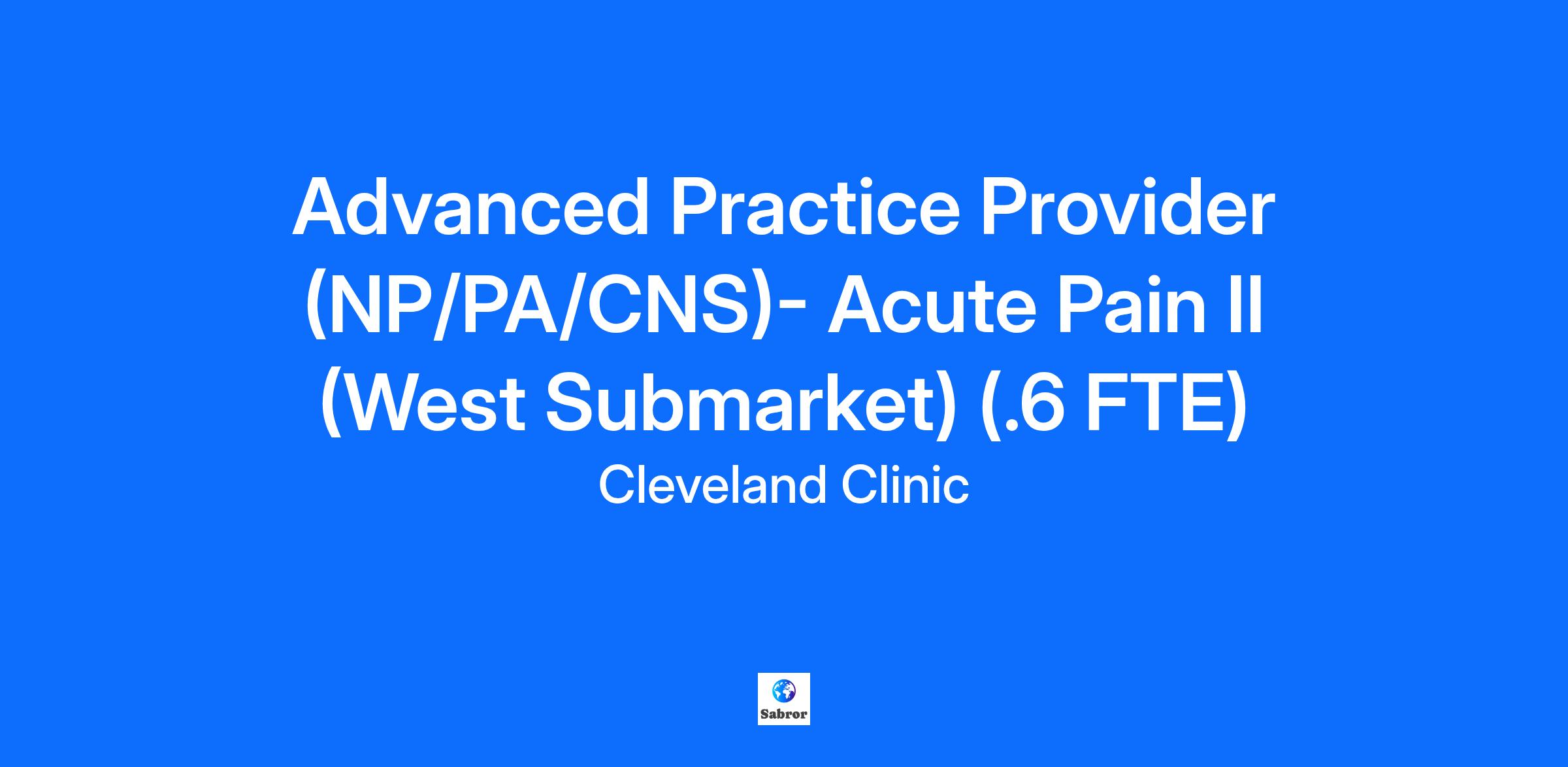 At Cleveland Clinic Health System, we believe in a better future for healthcare. And each of us is responsible for honoring our commitment to excellence, pushing the boundaries and transforming the patient experience, every day. We all have the power to help, heal and change lives — beginning with our own. That’s the power of the Cleveland Clinic Health System team, and The Power of Every One. Job Title Advanced Practice Provider (NP/PA/CNS)- Acute Pain II (West Submarket) (.6 FTE) Location Cleveland Facility Lutheran Hospital Department Clinicians-Lutheran Hospital Job Code T98104 Shift Days Schedule 7:00am-3:30pm/8:00am-4:30pm Job Summary Job Details Cleveland Clinic’s Integrated Hospital Care Institute is currently seeking a Physician Assistant or Nurse Practitioner (Adult, Family or Acute certified) for a part time (.6 FTE) Inpatient position in Acute Pain at Lutheran Hospital (with cross coverage at Fairview/Avon Hospitals). This provider will manage the acute pain needs of patients on the hospital units with a focus on regional anesthesia and complex regimen management for the peri-operative population. The ideal candidate will be eager to learn, self-motivated, team oriented and have sound clinical skills as well as a desire to educate others. The schedule for this position includes days with an even share of weekend coverage. The ideal candidate would work 5 four-hour shifts per week, but the department is willing to be flexible on the schedule. Candidates with previous pain management experience are preferred, however new graduates will be considered. Nationally certified Advanced Practice Provider who provides primary and/or specialty care in a variety of healthcare settings. Functions in collaboration with the health care team in accordance with certification and licensure. Practice emphasizes health promotion, disease prevention and the diagnosis and treatment of acute and chronic health problems. Responsible for dissemination of knowledge through instructing, leading and developing educational programs. Responsibilities: Conducts thorough medical histories, performs complete physical examinations (where indicated), initiates appropriate lab, radiology tests or other special tests required for evaluation of illness, and scrutinizes lab data to establish a record of the patient's current health status and to develop a working diagnosis and treatment plan. Works in collaboration with the health care team. Performs and interprets common laboratory, radiologic, cardiographic and other routine diagnostic procedures used to identify pathophysiologic processes as credentialed and privileged by the Medical Executive Committee and the Governing Body of the applicable hospitals. Performs routine and specialized procedures as credentialed and privileged by the Medical Executive Committee and the Governing Body of the applicable hospitals. May prescribe and monitor medications as allowed by license through applicable state board and Cleveland Clinic policies. Educates patients and answers questions regarding their disease, treatments, related drug and treatment side effects and hazards. Participates in medical team rounds; collaborates with nursing, medical and other healthcare team members regularly to ensure quality patient care. Refers patients to specialists as appropriate for consultation or for specialized health resources and treatment. Ensures continuity of care by serving as a liaison between patient and other members of the multi-disciplinary care team or with other specialty areas as necessary. Participates in quality monitoring thru the review of records and treatment plans for patient outcomes on a periodic basis to assure quality care. Facilitates appropriate length of stay, discharge planning and compliance with regulatory standards for inpatient management. Supports professional development of the health care team. Promotes translation of evidence-based practices, guidelines, and research. May conduct research studies. May assists in data collection and analysis. May serve as clinical preceptor for students. May onboard new caregivers. Other duties as assigned. Education: APRN Effective 05/01/2014: MSN required upon hire or within 3 years of hire for external hires and internal hires moving from a non-APRN licensed role to an APRN licensed role. Graduate of an accredited APRN program. If in neonatal care service area Master’s Degree is required upon hire. PA Graduate of an A.R.C. approved Physician Assistant Program. Master’s degree in Physician Assistant Studies and/or higher degree obtained from a program recognized by their practicing states Licensing Board. Languages: Oral and written communication in English Certifications: NP Currently licensed as a Nurse Practitioner in applicable state(s). Must be licensed as an RN in applicable state(s). National certification as a Nurse Practitioner by nationally accredited organization recognized by state Board of Nursing. Basic Life Support (BLS) through the American Heart Association (AHA) required. Advanced Cardiac Life Support (ACLS) or Pediatric Advanced Life Support (PALS) through the American Heart Association (AHA); or Neonatal Resuscitation Program (NRP) through the American Academy of Pediatrics (AAP) may be required based upon work setting. Must have arrangements with at least one physician in accordance with requirements set forth by the State Board of Nursing in applicable states. Must be credentialed and privileged by the Medical Executive Committee and the Governing Body of the applicable hospitals. PA Certification as a Physician Assistant through the NCCPA or successor organization recognized by their practicing states Licensing Board. License to practice and prescribe issued by their practicing states Licensing Board. Current DEA License or DEA designee as required by NCQA. Basic Life Support (BLS) through the American Heart Association (AHA) required. Advanced Cardiac Life Support (ACLS) or Pediatri