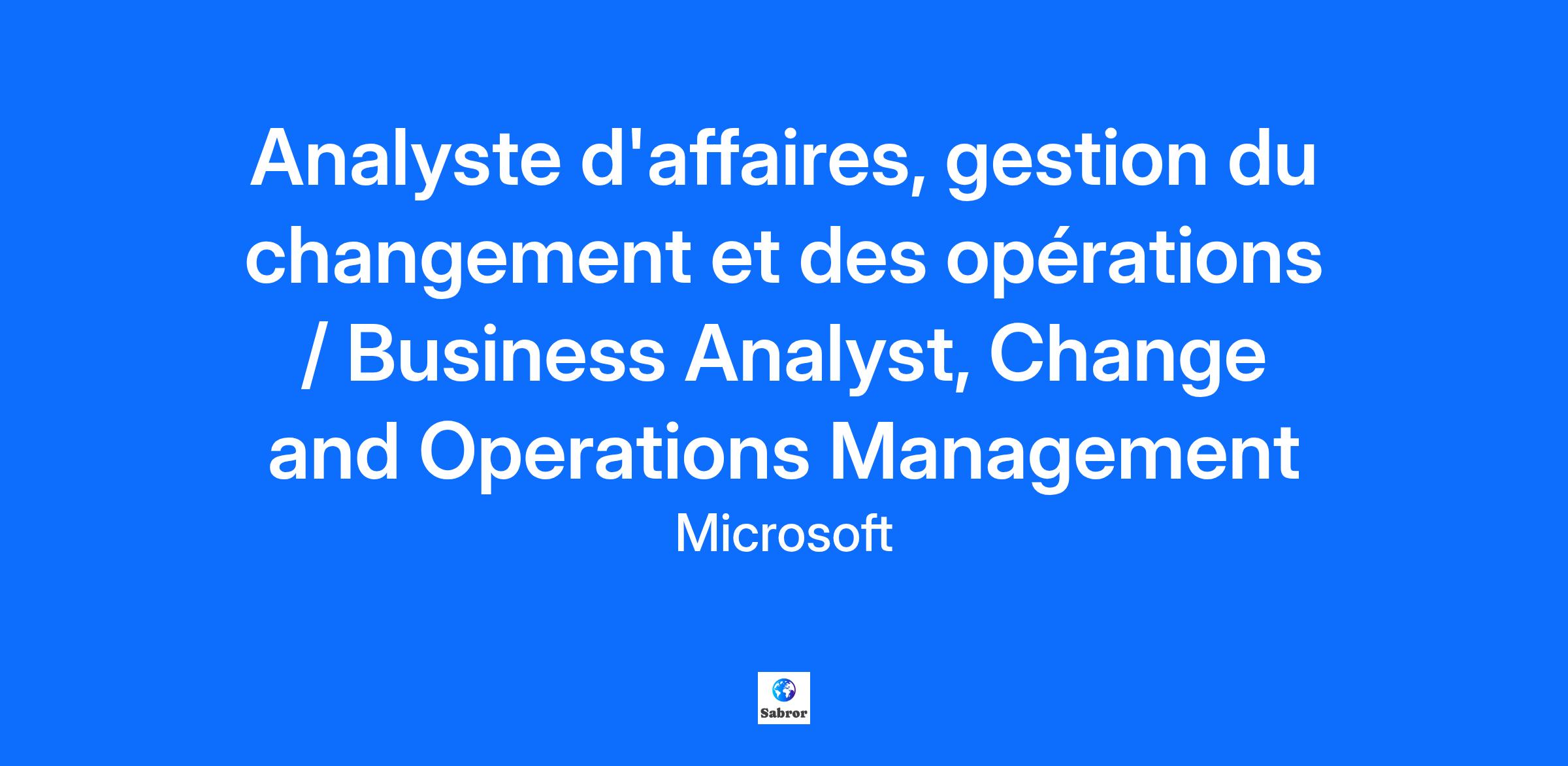 English Text follows French Avis: Avant de soumettre votre candidature, veuillez vous diriger en bas de la page et choisir le site que vous préférez English | FR – (au pied de page). Sélectionnez ‘English [https://careers.microsoft.com/v2/global/en/home.html]’ si vous souhaitez communiquer uniquement en anglais, ou FR – Canada [https://careers.microsoft.com/v2/ca/fr/accueil.html] si vous préférez recevoir des communications écrites en anglais et en français. En tant qu’analyste d’affaires chez Microsoft, spécialisé(e) en gestion du changement et des opérations, vous soutiendrez l’équipe de direction des opérations sur le terrain afin d’opérationnaliser de manière cohérente toutes les initiatives stratégiques à l’échelle métropolitaine. Vous veillerez à la planification financière et aux examens de performance conformément aux calendriers du rythme des affaires, et gérerez les conflits d’horaire avec les parties prenantes. Cloud Operations & Innovation (CO+I) de Microsoft est le moteur qui alimente nos services infonuagiques. Vous jouerez un rôle clé dans la prestation de l’infrastructure de base et des technologies fondamentales pour les services en ligne de Microsoft, notamment Bing, Office 365, Xbox, OneDrive et la plateforme Microsoft Azure. En tant que groupe, CO+I met l’accent sur le développement personnel et professionnel de tous les employés et offre des formations et des opportunités de croissance, y compris des programmes de rotation de carrière, des formations et événements sur la diversité et l’inclusion, ainsi que des certifications professionnelles. Notre infrastructure comprend un vaste portefeuille mondial de plus de 200 centres de données répartis dans 32 pays et des millions de serveurs. Notre fondation repose sur une équipe d’experts en la matière qui travaillent à soutenir les services pour plus d’un milliard de clients et 20 millions d’entreprises dans plus de 90 pays à travers le monde. Avec la durabilité environnementale et l’optimisation au cœur de la conception et des opérations de nos centres de données, nous continuons de croître et d’évoluer pour répondre aux exigences commerciales en constante évolution, consolidant ainsi la position de Microsoft en tant que fournisseur infonuagique de classe mondiale. La mission de Microsoft est de permettre à chaque personne et à chaque organisation sur la planète d’en accomplir davantage. En tant qu’employés, nous nous réunissons avec un état d’esprit axé sur la croissance, innovons pour autonomiser les autres et collaborons pour réaliser nos objectifs communs. Chaque jour, nous nous appuyons sur nos valeurs de respect, d’intégrité et de responsabilité pour créer une culture d’inclusion où chacun peut s’épanouir au travail et au-delà. -------------------------------------------------------------------------------- Notice: Before you submit your application, please scroll-down and select the site of your choice English | FR – Canada (in the footer). Select English [https://careers.microsoft.com/v2/global/en/home.html] to communicate with us only in English, FR – Canada [https://careers.microsoft.com/v2/ca/fr/accueil.html] if you prefer to receive written communication from us in both English and French. As a Microsoft Business Analyst, Change and Operations Management, you will support the field operations leadership team to operationalize all strategic initiatives consistently at metro level, ensure financial planning and performance reviews in accordance with rhythm of the business calendars and manage scheduling conflicts with stakeholders. Microsoft’s Cloud Operations & Innovation (CO+I) is the engine that powers our cloud services. You will perform a key role in delivering the core infrastructure and foundational technologies for Microsoft's online services including Bing, Office 365, Xbox, OneDrive, and the Microsoft Azure platform. As a group, CO+I is focused on the personal and professional development for all employees and offers trainings and growth opportunities including Career Rotation Programs, Diversity & Inclusion trainings and events, and professional certifications. Our infrastructure is comprised of a large global portfolio of more than 200 datacenters in 32 countries and millions of servers. Our foundation is built upon and managed by a team of subject matter experts working to support services for more than 1 billion customers and 20 million businesses in over 90 countries worldwide. With environmental sustainability and optimization at the forefront of our datacenter design and operations, we continue to grow and evolve as we meet the ever-changing business demands that hold Microsoft as a world-class cloud provider. Microsoft’s mission is to empower every person and every organization on the planet to achieve more. As employees we come together with a growth mindset, innovate to empower others, and collaborate to realize our shared goals. Each day we build on our values of respect, integrity, and accountability to create a culture of inclusion where everyone can thrive at work and beyond.