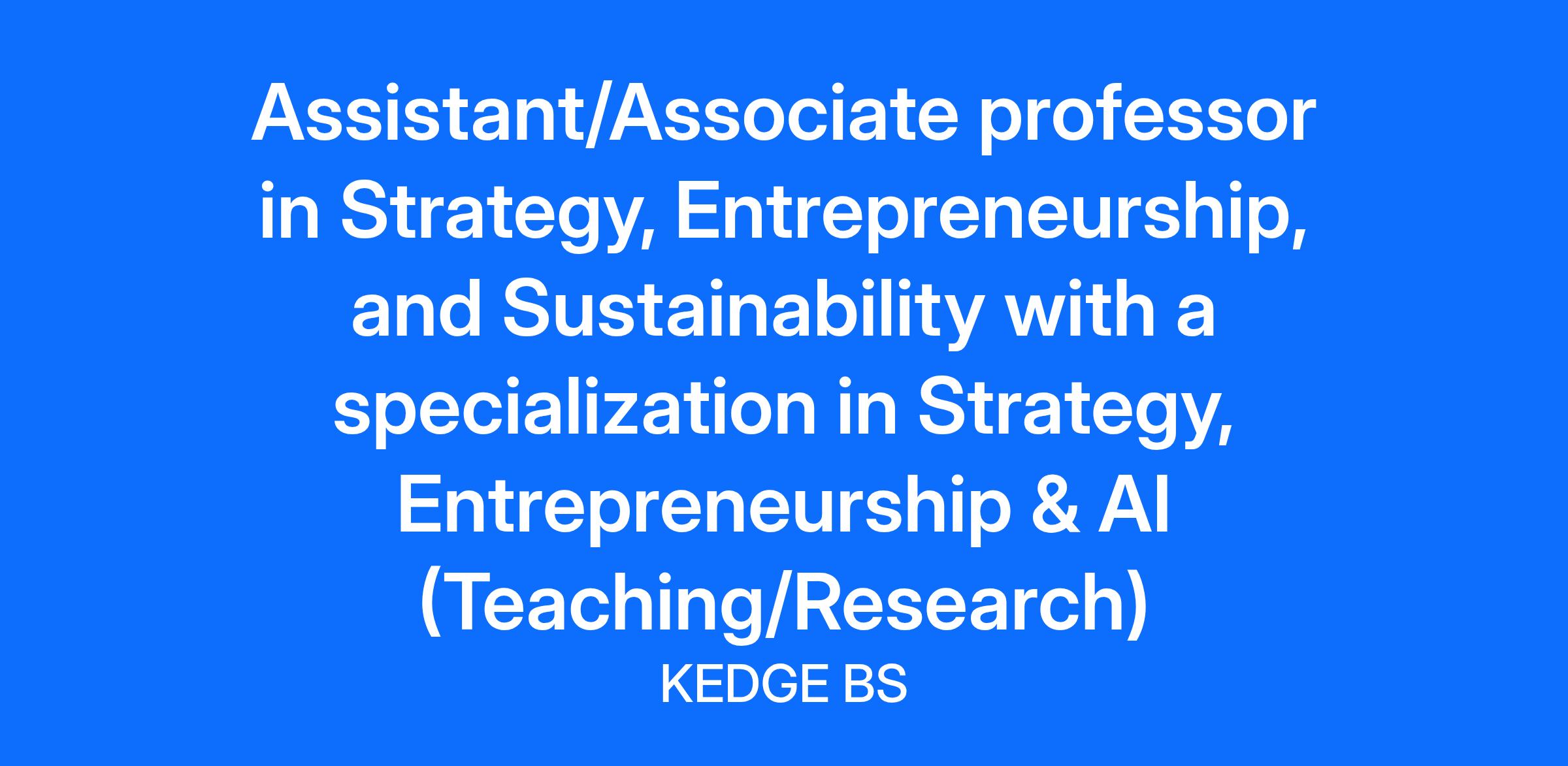 Assistant/Associate professor of Strategy, Entrepreneurship, or Sustainability (Campus of Bordeaux) Strategy, Sustainable Development and Entrepreneurship Department KEDGE Business School is a vibrant business school with 4 campuses in France (Paris, Bordeaux, Marseille and Toulon), 5 international campuses (2 in China, 2 in Africa, and 1 in India), as well as 4 associated campuses in France (Avignon, Bastia, Bayonne, and Mont-de-Marsan). KEDGE Business School offers an international environment, which includes 16,000 students (32% foreign students), 220 full-time faculty members (46% of whom are international) and close to 370 international academic partners. Ranked 34th amongst European Business Schools and 28th worldwide for the Executive MBA by the Financial Times, KEDGE Business School belongs to the elite 1% of business schools worldwide accredited by AACSB, EQUIS, and AMBA, and is a member of the French Conférence des Grandes Écoles. In the Strategy department, the professors teach various disciplines as part of the higher education and Executive Education programmes, while encouraging educational innovation and the development of online learning. In the Strategy department, the professors teach various disciplines as part of the higher education and Executive Education programs, while encouraging educational innovation and the development of online learning. They give classes in the main and traditional areas of management as well as in the specialized fields of social/sustainable entrepreneurship, business development and small business management, design thinking, eco-design, innovation and technology, responsible management, sustainability, new business models in the circular economy, industrial ecology paradigms, ethics and corruption, business & politics and health management. The faculty’s research topics reflect this, offering a state-of-the-art knowledge and expertise needed to enhance the different programs, from undergraduate level to doctorates as well as within the Executive Education. This translates into an academic recognition for the faculty and the creation of research chairs as well as the participation in international research programs and projects, conferences and research seminars, scientific publications in academic reviews. KEDGE Business school invites applications for following full-time Faculty position: Assistant/Associate professor in Strategy, Entrepreneurship and Sustainability with a specialization in Strategy, Entrepreneurship & AI (balanced profile teaching/research) Responsibilities : Teaching and educational development (undergraduate, graduate and post graduate level); Publication in academic and professional journals; Research Projects with companies or international institutions; Participation in national and international calls for projects; Student supervision and coaching. Profile and skills required : PhD or equivalent; Teaching experience related to Strategy, entrepreneurship, or sustainability Publication in the areas of Strategy, entrepreneurship, or sustainability Ability to teach generalist courses in Strategy, entrepreneurship, or sustainability Ability to teach courses in French and English Procedure of application Interested candidates should provide the following elements : a cover letter containing your motivation for the position an up-to-date curriculum vitae with a list of publications and most recent representative research papers a teaching statement (including course details and course evaluations) two references who can be contacted Compensations and benefits: Permanent contract/ Full time Status: Executive Salary: to be negotiated /over 13 months / Bonuses (research, executive education, extra hours, etc.) Paid leaves 35 days per year + 15 exemption days per year Others benefits: lunch vouchers + mobility bonus + complementary health insurance Support provided for you moving in France (accommodation search, school for the kids, visa procedures, administrative procedures, French lessons, etc.) Starting date: September 2026 If you have questions regarding the position, please contact: Dr Virginie VIAL Head of Strategy, Sustainable Development and Entrepreneurship Department virginie.vial@kedgebs.com All of the School's employees are aware of the issues of inclusiveness, whether it be disability, gender or equal opportunity. Our school attaches key importance to inclusiveness, which is embodied in two of our strategic pillars: sustainability and inclusiveness.