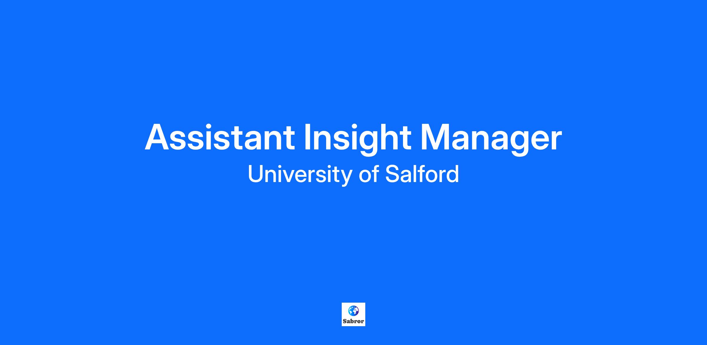 Do you have a passion for insight and using it to help businesses make evidence-based decisions? Do you want to help shape the experience for current and future Salford students? If the answer to these questions is ‘yes’, then we want to hear from you. The Assistant Insight Manager role will include, but not be limited to: Designing engaging and inclusive research activity that applicants and students from across the globe want to take part in Providing analysis of quantitative and qualitative activity Disseminating action-focused insights that resonate with stakeholders and keep the customer voice at the top of everyone’s agendas You should be comfortable with a wide range of market research techniques across quantitative and qualitative methodologies; prior experience of face-to-face moderation will be a significant advantage. Some flexibility of hours may be required to support with fieldwork. The role sits within the Market and Customer Insight Team, which is part of the wider Marketing, Recruitment and External Relations Directorate. We are focused on the journey students go on from first enquiry to arrival at Salford and transition into student life, and your work will have the power to really positively impact on the experience of future students. What’s in it for you? – the benefits Competitive salary - and excellent pension scheme (starting salary of £33,951) Generous annual leave - plus the option to buy additional holiday days Professional development - a comprehensive package of training and development opportunities to help you achieve your full potential Wellbeing support – dedicated services and facilities to support your mental and physical health, ranging from an Employee Assistance Programme and counselling, to sports and fitness facilities, including discounted gym memberships Flexible working is offered with an expectation that the post holder will spend at least two days a week on campus. Think this might be the role for you? Apply now, or email Naomi Stark (n.stark@salford.ac.uk) if you have any questions Please be aware that this role is not eligible for Visa Sponsorship. Job Description