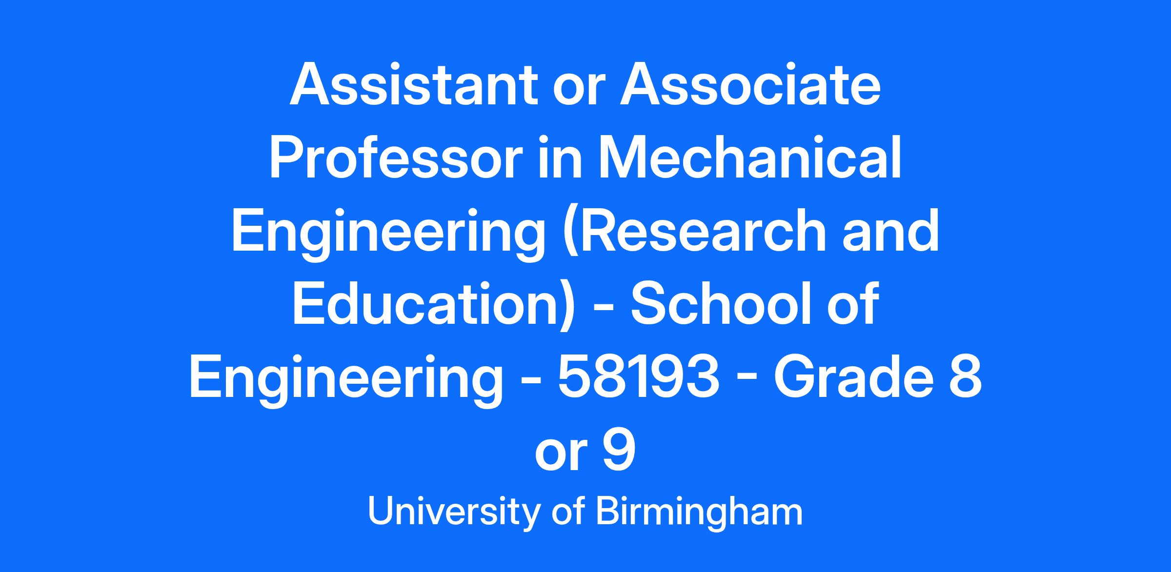 Position Details School of Engineering Location: University of Birmingham, Edgbaston, Birmingham UK Grade 8 Full time starting salary is normally in the range £47,389 to £56,535 with potential progression once in post to £63,606 Grade 9 Full time starting salary is normally in the range £58,225 to £67,468 with potential progression once in post to £87,974 Grade: 8 or 9 Full Time, Permanent Closing date: 1st December 2025 Background This is an exciting time to join the University of Birmingham and advance your academic career. Following the creation of the School of Engineering in 2016, which brought together the disciplines of Civil Engineering, Mechanical Engineering, and Electronic, Electrical & Systems Engineering, we are now entering Phase 2 of our renaissance. We are investing significantly in people and infrastructure, including our new £65m signature building, the world-leading £26M National Buried Infrastructure Facility, and the £28m UK Rail Research and Innovation Network (UKRRIN), all of which have opened in the past few years. These state-of-the-art facilities have not only enhanced our research capabilities but have also solidified our position as a leading research and education institution, enabling groundbreaking discoveries and providing an exceptional learning environment for our students. The school boasts a rich history of world-class research and takes pride in its robust and wide-reaching connections with industry. These partnerships ensure the rapid application of our pioneering research in practical settings. This fact is underscored by the 2021 Research Excellence Framework (REF), which ranked Engineering among the top 10 institutions in the UK. In line with our ongoing investments, we are seeking to appoint a driven and highly research active Mechanical Engineer to join our Department of Mechanical Engineering and help us create the future. The Department of Mechanical Engineering encompasses research in Advanced Manufacturing; Automation, Robotics and Control; Automotive Engineering; Biomedical Engineering; Clean Energy Engineering; and Sustainable Manufacturing. For this current recruitment we are particularly interested in applications from candidates who can demonstrate ambition, innovation, and leadership, and that are undertaking research and teaching in any of the areas of (Sustainable) Transportation Systems or Data Science and Artificial Intelligence. This could cover but is not limited to, research ranging in: Advancedpropulsion technologies such as hydrogen, ammonia, electrification and hybrid systems, addressing the drive to net-zero. Application of data science and AI to engineering challenges, such as robotic manufacturing, transportation, medical engineering, future mobility, and infrastructure. The successful candidate will be expected to create and disseminate knowledge through initiating and conducting original research, through publication and through developing and delivering undergraduate, postgraduate and CPD programmes, as appropriate to the disciplinary area. In addition, to contribute to the department/school through management/leadership, and enterprise activities, as appropriate. The School of Engineering is dedicated to upholding the principles of Equality, Diversity, and Inclusion (EDI) in all its endeavours, and we strongly encourage applications from individuals belonging to underrepresented groups. Role Summary The role holder will be based in Edgbaston. The key duties and responsibilities will include but not be limited to: giving lectures and seminars and supervising undergraduate / post-graduate students, course development and innovation, taking an active part in examinations, carrying out innovative research and writing papers on topics relevant to the specialist subject area (this will include journals, books and other material), and obtaining research grant funding. The successful applicant will have a PhD in a relevant specialist subject area, as well as postdoctoral experience. We are looking for candidates who will actively contribute to our portfolio and community, through pursuit of research that will bring new opportunities, synergies, and interdisciplinary collaboration. The successful candidate will also have a track record in teaching at a higher education institution. Appointments will be made at either an Assistant Professor or Associate Professor level please specify which role you are applying for in the application To download the full job description please click here: Grade 8 Grade 9 Informal enquiries to Dr Carl Anthony, email c.j.anthony@bham.ac.uk, Head of Department of Mechanical Engineering and Professor Karl D. Dearn, email: k.d.dearn@bham.ac.uk, Head of School of Engineering. We believe there is no such thing as a 'typical' member of University of Birmingham staff and that diversity in its many forms is a strength that underpins the exchange of ideas, innovation and debate at the heart of University life. We are committed to proactively addressing the barriers experienced by some groups in our community and are proud to hold Athena SWAN, Race Equality Charter and Disability Confident accreditations. We have an Equality Diversity and Inclusion Centre that focuses on continuously improving the University as a fair and inclusive place to work where everyone has the opportunity to succeed. We are also committed to sustainability, which is a key part of our strategy. You can find out more about our work to create a fairer university for everyone on our website.