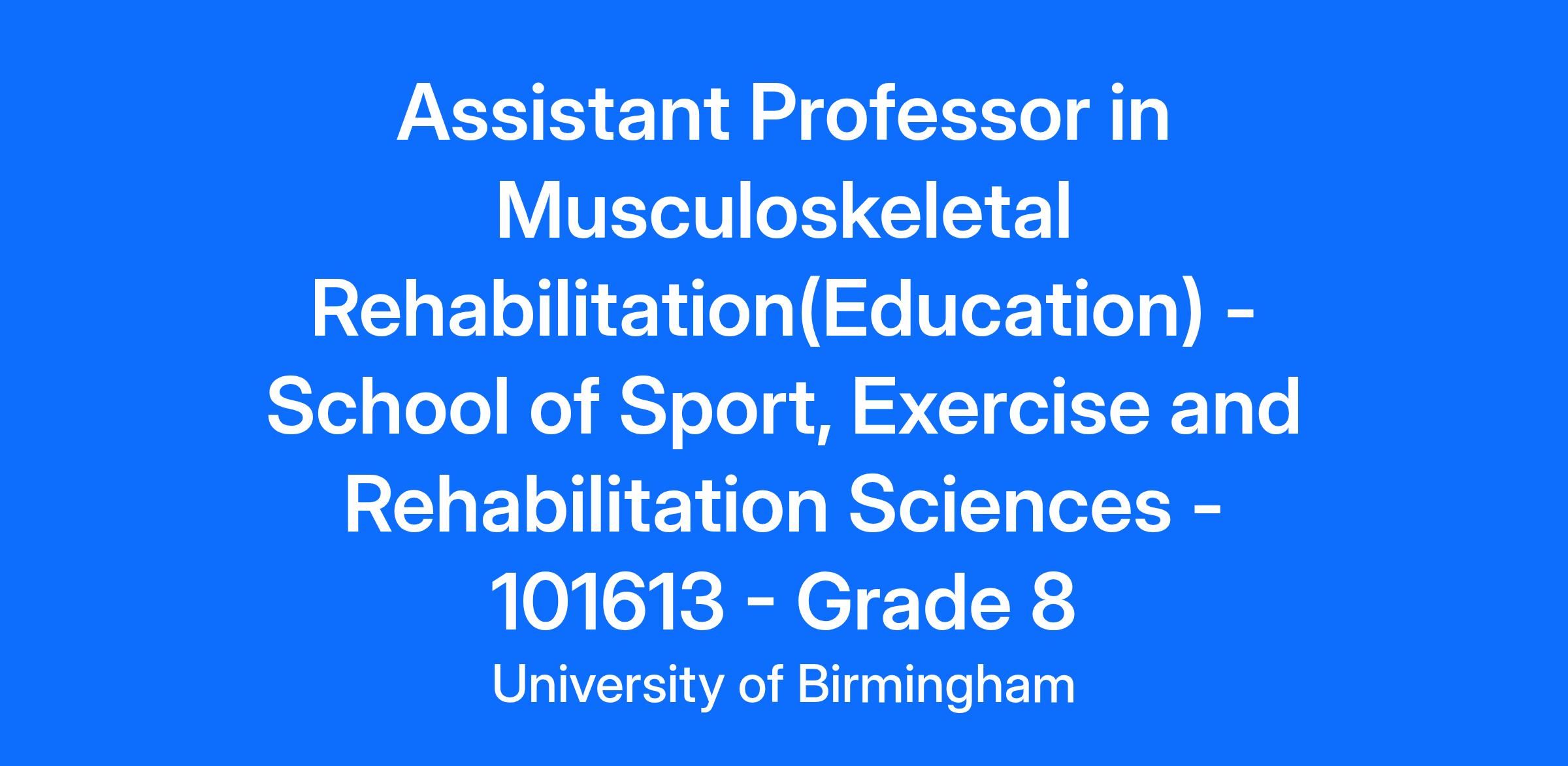 Position Details School of Sport, Exercise and Rehabilitation Sciences Location: University of Birmingham, Edgbaston, Birmingham UK Full time starting salary is normally in the range £47,389 to £56,535 with potential progression once in post to £63,606 Grade: 8 Full Time, Permanent Closing date: 18th January 2026 Interviews Scheduled: 30th January 2026 Role Summary About you The School of Sport, Exercise and Rehabilitation Sciences is seeking to grow our team by appointing a full-time Assistant Professor in Musculoskeletal Rehabilitation (teaching focused) who will contribute to a range of education-related and administration activities within the School across our pre and post registration physiotherapy programmes. As an assistant professor, you will be a passionate and inspiring educator, with significant experience in practice-based or classroom education who is capable of facilitating learning in students of all levels. You will have an in-depth understanding of the UK healthcare context and an extensive background in musculoskeletal physiotherapy practice with proven specialist clinical skills demonstrated across one or more of healthcare, community and sport and exercise settings. You will demonstrate a strong understanding of person-centred clinical reasoning and evidence-based management strategies in the contemporary musculoskeletal context that you are able to communicate and contextualise to support student learning. Your teaching will draw on your own clinical expertise and research evidence to deliver exceptional education and set our graduates up for future success throughout their career. You may already have experience working in physiotherapy education or be looking to move from a clinical setting into higher education to continue your own career development. We would consider job share options for excellent candidates who wish to retain a clinical post alongside a teaching role within the school. You will be looking to play a pivotal role in shaping the future of physiotherapy, leading and enhancing our programmes to ensure an outstanding educational journey for our students. Your enthusiasm for educating future physiotherapists will drive you to advance your own teaching and learning practices and develop those around you. You’ll be a cornerstone in healthcare education, providing unwavering academic and pastoral support to students, ensuring they receive an exceptional learning experience. In our vibrant and inclusive community, you’ll champion diversity and uphold values of integration and support for all, regardless of abilities, sexual orientation, ethnicity, race, faith, or gender. Your commitment to these principles will be evident in every aspect of your role. About the role Working within the physiotherapy programme teams, you will make a substantial contribution to the leadership and delivery of musculoskeletal physiotherapy education on the School’s qualifying physiotherapy degree programmes and our postgraduate musculoskeletal physiotherapy programmes on our Edgbaston and Dubai campuses. You will lead and contribute to module teams which plan, prepare and deliver excellent engaging and challenging teaching that inspires students and prepares them for current and future practice and a career in physiotherapy. You will seek out opportunities to develop the educational experience for our students which may include the identification and enhancement of placement education, integrating simulation into the curriculum and using new technology to support teaching, learning and assessment. In the realm of management and administration, you’ll be a leader and a collaborator, steering activities within the School and more widely across the University. Your contributions will be substantial, whether through curriculum development, public engagement, widening participation, or outreach initiatives. You’ll embody academic citizenship, fostering respectful and supportive relationships with staff and students alike, positively influencing their roles. About the school The School of Sport, Exercise and Rehabilitation Sciences is a world-leading School that performs cutting-edge and translational research in all aspects of Sport, Exercise and Rehabilitation sciences. This unique platform allows us to address societal challenges from a multidisciplinary perspective and enrich our curricula with a research intensity that ranks us at 8th place in global league tables. The university has a long tradition in pre-qualifying physiotherapy education and our school’s undergraduate physiotherapy programme is ranked number one in the UK in the Complete University Guide (2023, 2024 and 2025). In addition to our postgraduate Manipulative physiotherapy and Sport Exercise Medicine programmes in Edgbaston, we have recently launched these programmes in our Dubai campus, and the successful applicant will support teaching on physio programmes across Edgbaston and Dubai campuses as flying faculty. You will be joining a thriving community of physiotherapists, health psychologists, physiologists, and sports scientists with access to excellent research and teaching facilities. The school is based in a purpose-built building with a range of teaching spaces and practical labs including simulation capture system. We work closely with clinical centres of excellence and are excited to extend our research and impact for the communities we serve via a new state-of-the art Exercise and Rehabilitation Facility, The Centre for Movement and Wellbeing, which opened in March 2024 and includes a physiotherapy clinic. Future developments include a new Clinical Skills Building with simulation spaces for including ward, clinic and home environments. Having been awarded Athena SWAN Silver status, the school is committed to promoting equality, diversity, and inclusivity, and therefore welcomes applicants from diverse backgrounds to join our global community. The University of Birmingham holds Advance H