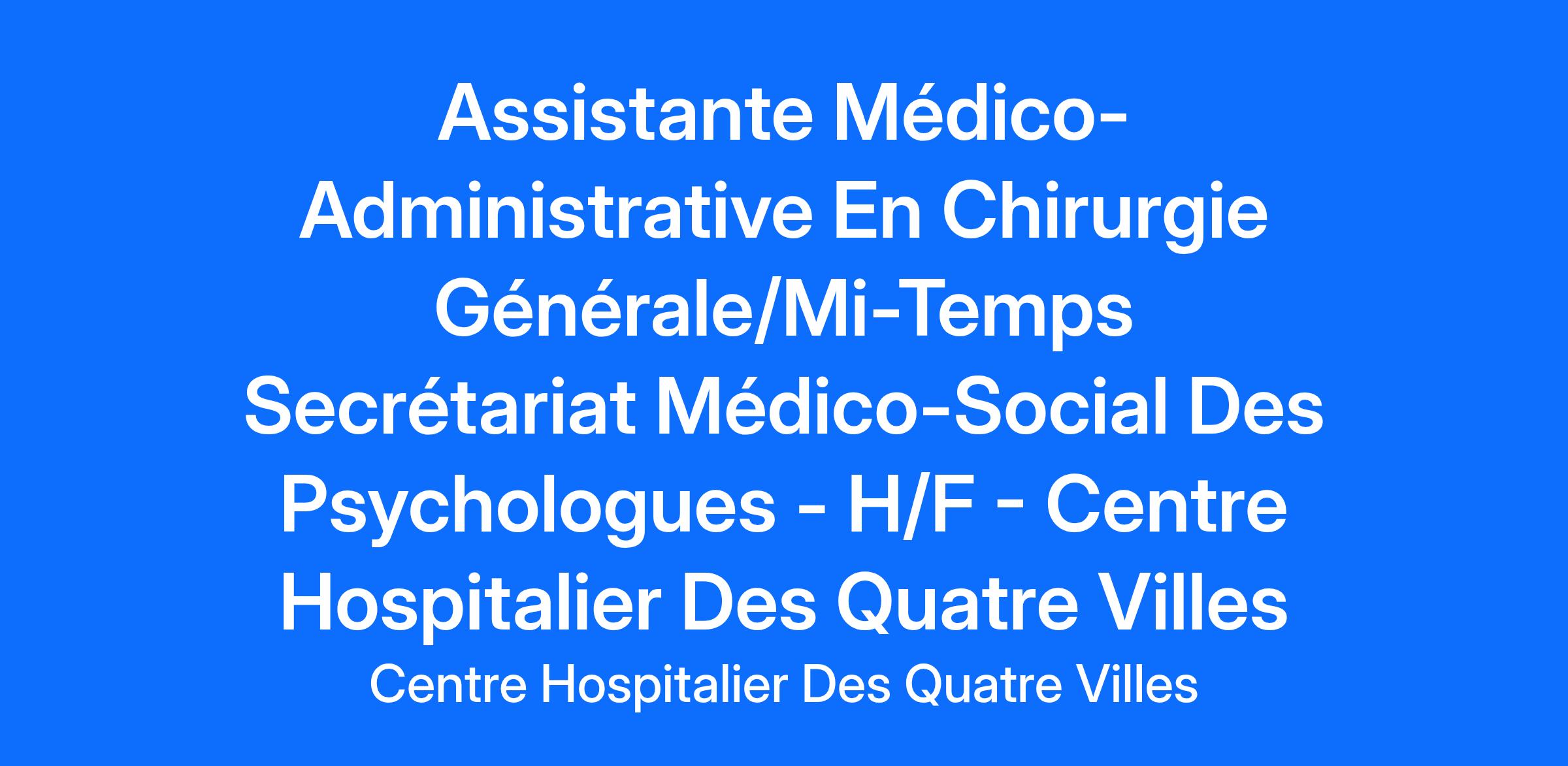 Le Centre Hospitalier des Quatre Villes (92) recherche une Assistante Médico-Administrative pour son service de Chirurgie générale ainsi qu'à mi-temps sur le secrétariat médico-social des psychologues situé sur le site de Saint-Cloud.