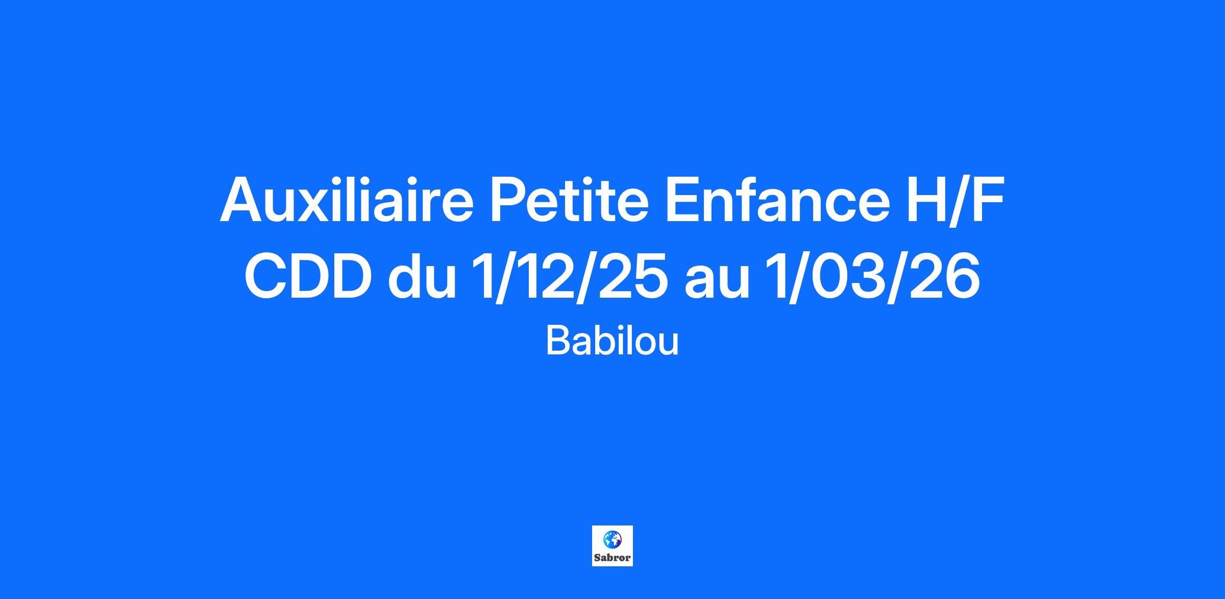 Contract type Fixed Term (durée déterminée) CDD du 1/12/25 au 1/03/26 Vous êtes titulaire du CAP Petite Enfance, BEP CSS (BAC professionnel ASSP), du Titre Assistant de Vie aux familles et idéalement vous avez déjà travaillé en crèche, alors ce poste est fait pour vous. « Babilou laisse une liberté aux équipes dans les choix des projets. Chaque crèche est différente, c’est ce qui fait pour moi sa richesse. » Clémence Directrice de crèche. PRINCIPALES MISSIONS : - Vous assurez un accueil de qualité pour l’enfant et sa famille au travers d’activités et de soins individualisés. - Vous participez à la réflexion éducative avec l’équipe. - Vous collaborez à la mise en œuvre du projet pédagogique en lien avec notre Projet d’Etablissement Groupe. - Vous veillez à la sécurité, l’hygiène et le bien-être de chaque enfant. AVANTAGES : - Tickets Restaurant - Prime d’ancienneté, Prime anniversaire - Bonus Annuel Babilou : 1/4 de 13ème mois à partir de 2 ans d'ancienneté - Remboursement des transports en commun à hauteur de 60% - Congés supplémentaires (2 jours la 1ère année, 4 jours la 2ème année, 5 jours la 3ème année) - Avantages CSE (chèques cadeaux, réductions,…) - Places en crèches pour les enfants de nos collaborateurs (plus de 100 en 2023). - Mutuelle d’Entreprise, 1% logement, assistance sociale gratuite - Proximité géographique lieu de travail/ domicile (annonces accessibles en temps réel) - Échange et partage de bonnes pratiques : rencontre mensuelle avec vos collègues et réseau social interne (Workplace). - Dispositifs de formations VAE (30 heures de détachement pour l'écriture du livret, Accompagnement VAE Auxiliaire de puériculture ou EJE, Ateliers, Conférences, E-learning, …) Tous nos postes sont ouverts aux personnes en situation de handicap. Babilou s’engage au travers d’une politique diversité et inclusion. Nous offrons aux équipes en crèche la possibilité d’exprimer leur créativité, venez exprimer la vôtre ! Date of dating post: 01 - 12 - 2025 Babilou est une entreprise familiale créée par Rodolphe et Edouard Carle en 2003. Aujourd’hui, Babilou c’est un projet commun « Grandir Ensemble » qui évolue dans le respect de ses 5 valeurs : Engagement | Qualité | Esprit d’équipe | Diversité | Bienveillance. Depuis 16 ans, nous mettons à disposition des familles un mode d’accueil fiable et qualitatif. Le bien-être de nos équipes conditionne directement la qualité d’accueil des enfants et des familles. C’est pourquoi, guidés par notre Mission Educative, nous avons à cœur d’accueillir nos collaborateurs comme nous accueillons les enfants et leur famille pour qu’ils : Prennent leur place chez Babilou Apprennent à chaque instant Aient confiance en eux Nous rejoindre, c’est être passionné par son métier et animé par une volonté commune : mener à bien la Mission Educative de Babilou, « Au côté des familles, contribuer à l’éducation des enfants, créateurs du monde de demain. »