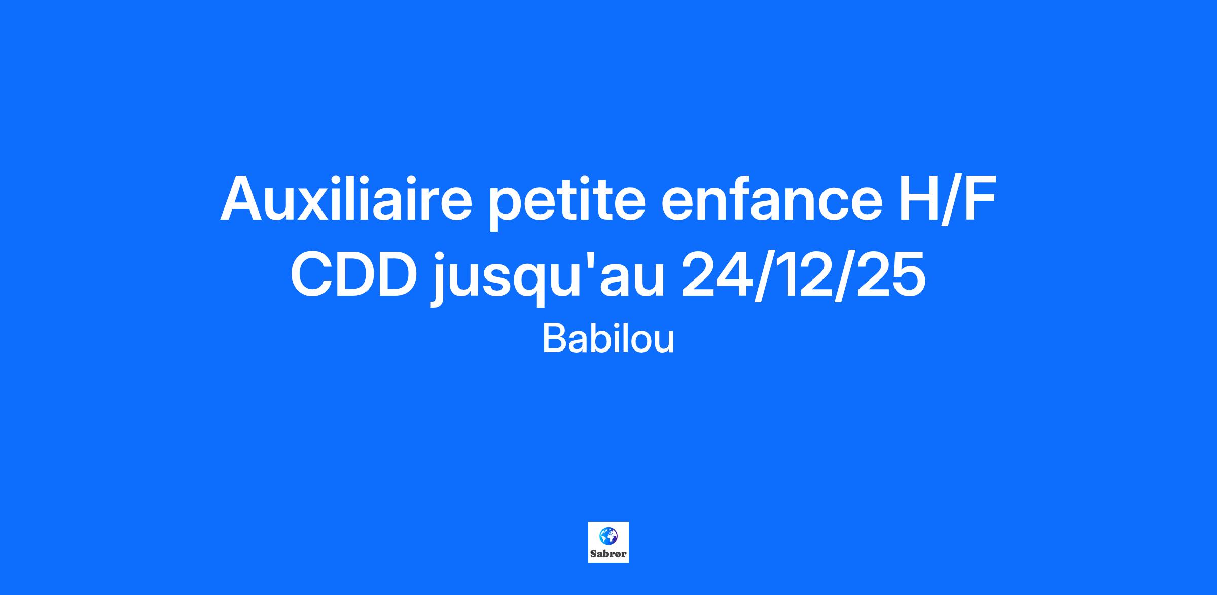 Contract type Fixed Term (durée déterminée) CDD jusqu'au 24/12/25 Vous êtes titulaire du CAP Petite Enfance, BEP CSS (BAC professionnel ASSP), du Titre Assistant de Vie aux familles et idéalement vous avez déjà travaillé en crèche, alors ce poste est fait pour vous. « Babilou laisse une liberté aux équipes dans les choix des projets. Chaque crèche est différente, c’est ce qui fait pour moi sa richesse. » Clémence Directrice de crèche. PRINCIPALES MISSIONS : - Vous assurez un accueil de qualité pour l’enfant et sa famille au travers d’activités et de soins individualisés. - Vous participez à la réflexion éducative avec l’équipe. - Vous collaborez à la mise en œuvre du projet pédagogique en lien avec notre Projet d’Etablissement Groupe. - Vous veillez à la sécurité, l’hygiène et le bien-être de chaque enfant. AVANTAGES : - Tickets Restaurant - Prime d’ancienneté, Prime anniversaire - Bonus Annuel Babilou : 1/4 de 13ème mois à partir de 2 ans d'ancienneté - Remboursement des transports en commun à hauteur de 60% - Congés supplémentaires (2 jours la 1ère année, 4 jours la 2ème année, 5 jours la 3ème année) - Avantages CSE (chèques cadeaux, réductions,…) - Places en crèches pour les enfants de nos collaborateurs (plus de 100 en 2023). - Mutuelle d’Entreprise, 1% logement, assistance sociale gratuite - Proximité géographique lieu de travail/ domicile (annonces accessibles en temps réel) - Échange et partage de bonnes pratiques : rencontre mensuelle avec vos collègues et réseau social interne (Workplace). - Dispositifs de formations VAE (30 heures de détachement pour l'écriture du livret, Accompagnement VAE Auxiliaire de puériculture ou EJE, Ateliers, Conférences, E-learning, …) Tous nos postes sont ouverts aux personnes en situation de handicap. Babilou s’engage au travers d’une politique diversité et inclusion. Nous offrons aux équipes en crèche la possibilité d’exprimer leur créativité, venez exprimer la vôtre ! Date of dating post: 17 - 11 - 2025 Babilou est une entreprise familiale créée par Rodolphe et Edouard Carle en 2003. Aujourd’hui, Babilou c’est un projet commun « Grandir Ensemble » qui évolue dans le respect de ses 5 valeurs : Engagement | Qualité | Esprit d’équipe | Diversité | Bienveillance. Depuis 16 ans, nous mettons à disposition des familles un mode d’accueil fiable et qualitatif. Le bien-être de nos équipes conditionne directement la qualité d’accueil des enfants et des familles. C’est pourquoi, guidés par notre Mission Educative, nous avons à cœur d’accueillir nos collaborateurs comme nous accueillons les enfants et leur famille pour qu’ils : Prennent leur place chez Babilou Apprennent à chaque instant Aient confiance en eux Nous rejoindre, c’est être passionné par son métier et animé par une volonté commune : mener à bien la Mission Educative de Babilou, « Au côté des familles, contribuer à l’éducation des enfants, créateurs du monde de demain. »
