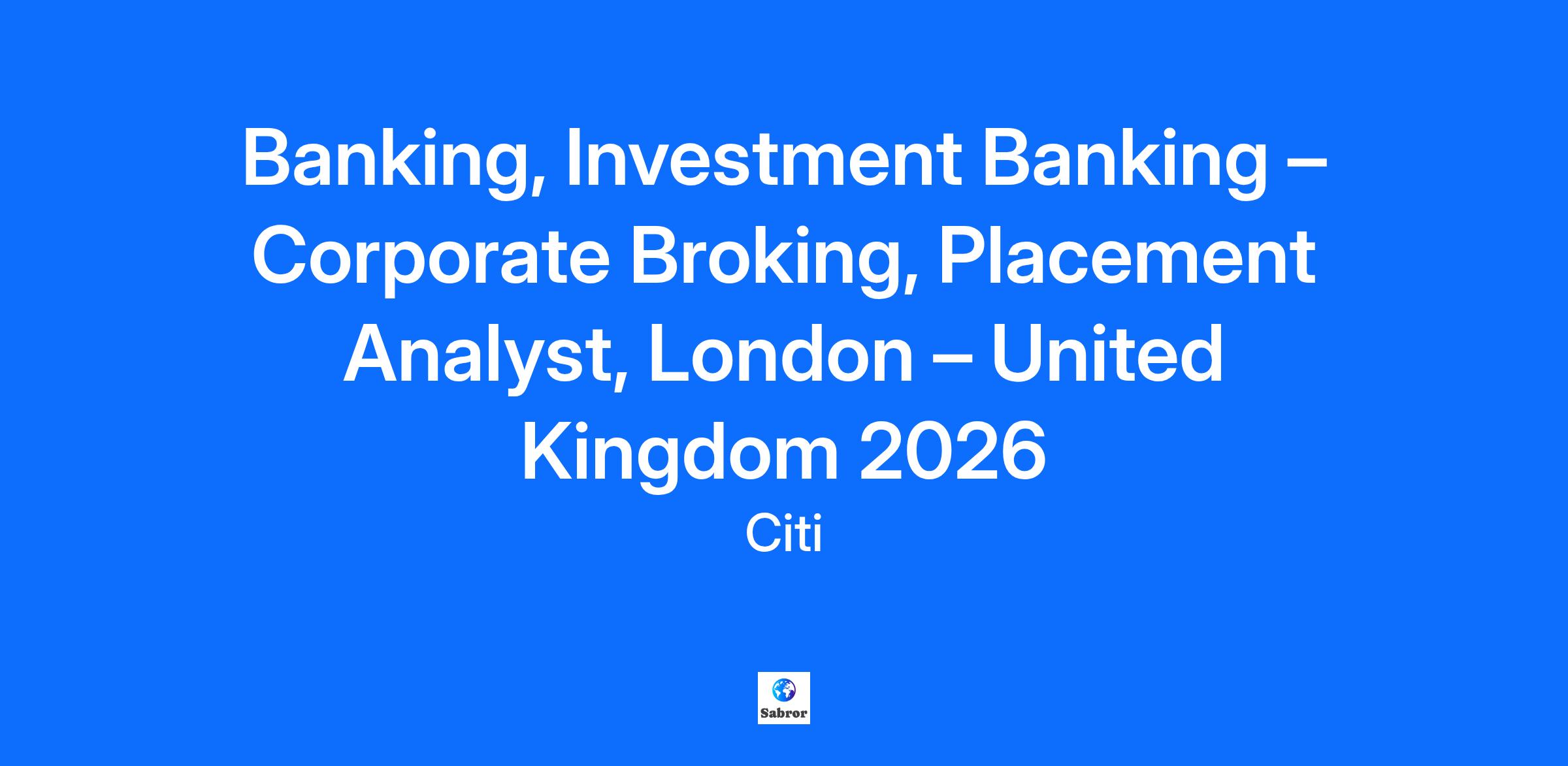 You're the brains behind our work: Citi is looking for placement analysts to join the UK Corporate Broking team in London, from February 2026. Corporate Broking is a core part of our UK Investment Banking franchise and is at the heart of Citi’s coverage of blue-chip clients, focusing primarily on FTSE 100 and FTSE 250 companies. Corporate Broking is a role which is unique within investment banking. We combine the skill-set of corporate finance with a strong understanding of global equity markets and what is driving them. Our work is fast-paced and varied and no day is the same, ranging from keeping our clients well-informed on the latest developments which are driving their share prices, to advising them on raising funds in the capital markets or executing IPOs and/or Mergers & Acquisitions. Our competitive edge is based on building trusted relationships with our clients at the Board, CEO and CFO level, allowing us to bring the full capabilities of Citi’s global platform to bear in helping them achieve their strategic objectives. We provide you with the knowledge and skills you need to succeed: We’re committed to teaching you the ropes. During our 6-month placement analyst program, which starts in February 2026, you will be assigned to the UK Corporate Broking team. Successful placement analysts will be considered for a full time position after graduation. Your time here will look something like this: Keeping up to date on the latest news, developments and trends that are driving equity markets by using the intelligence of Citi’s global equities platform, communicating that information to your clients. Develop an understanding of how companies are viewed and valued by institutional investors through speaking to some of the most important mutual fund and hedge fund managers. Build financial models, assess valuation, and explore transaction opportunities for your clients Conduct research and analyse industry trends. Help to strengthen your clients’ shareholder base by conducting analysis on potential new investors. Participate in client development by having an active role in building new and existing client relationships, and assisting in the presentation of new ideas to clients. We want to hear from you if: You are studying for a degree that allows for a 6-month industrial placement or have graduated. Expected to achieve or have achieved a 2:1 (or equivalent) at undergraduate level in any degree discipline. You have an interest in business. You are available to start in February 2026. Who we think will be a great fit: We’re looking for motivated individuals, who are eager to grow their careers in Investment Banking. Successful candidates take pride in all aspects of their work and recognize that it is a reflection not just of the firm, but of themselves. We value diversity and so do you. We’ll also be looking for the following: Commitment to personal growth and career development including mobility and flexibility. You also have a strong desire to learn, are proactive, building rapport and relationships in team environments. Desire to develop a deep understanding of the financial industry. Intellectual curiosity and proactive approach to searching for new and creative ideas. Strong communication, planning, and organizational skills. Unquestioned commitment to integrity and ethical decision-making. Interest in business. We will be recruiting on a rolling basis therefore we encourage you to apply as soon as possible. There is no deadline for applications. Successful candidates will be offered a competitive salary. The role will be based at 33 Canada Square Canary Wharf - London, E14 5LB, United Kingdom. The role currently offers a hybrid working model, with a mandatory three days in your assigned office, and an optional two days from home. Citi supports this business model, subject to business approval.