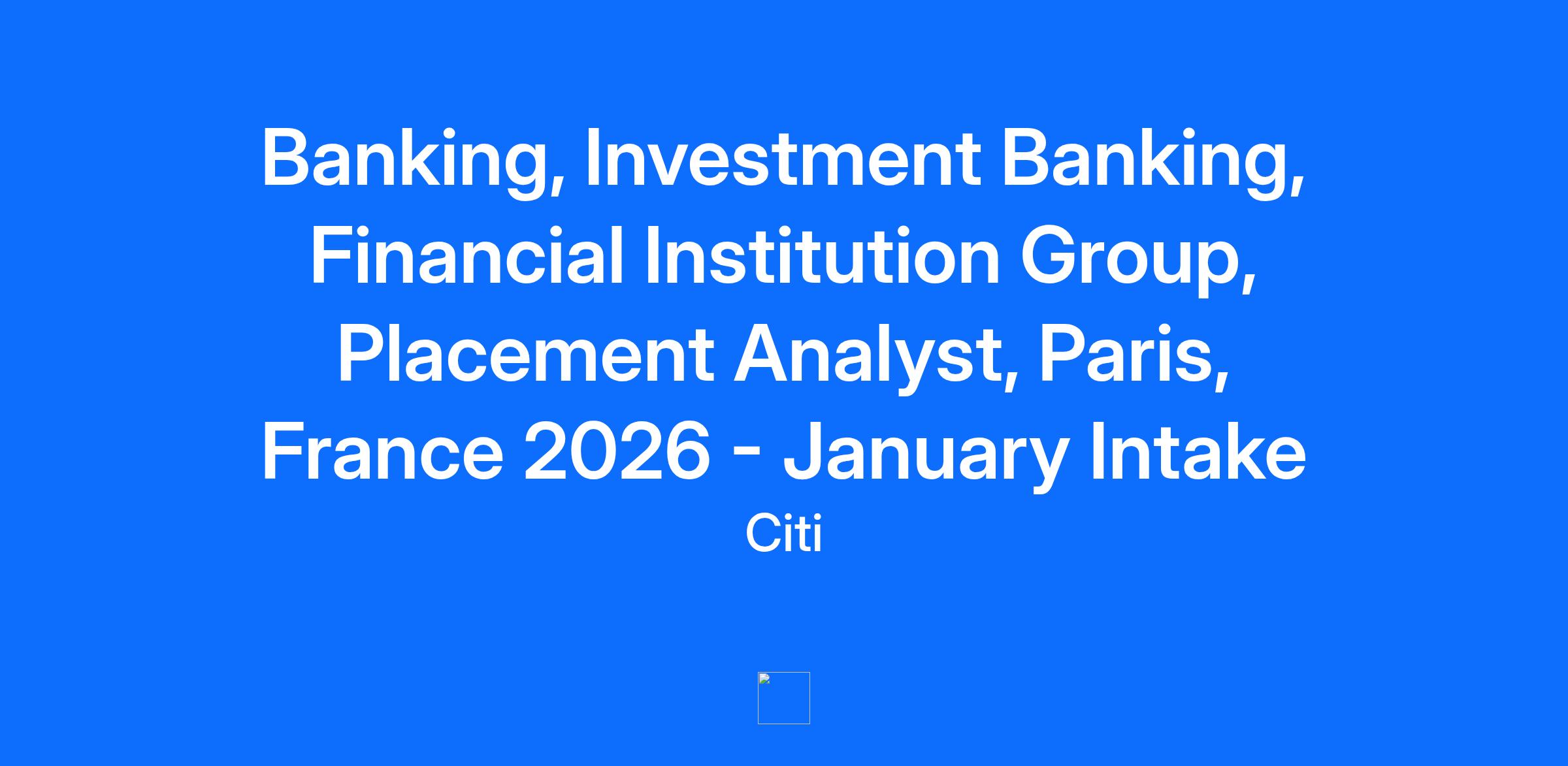 Citi is looking for Placement Intern Analyst to join the Investment Banking (FIG) team in Paris in January 2026 for 6 months. The Investment Banking group advises corporate clients who want to raise funds in capital markets and who need strategic support in financial transactions. Initiatives you may be working on with clients include mergers, acquisitions, divestitures, financial restructurings, underwriting, and distributing equity, debt, and derivative securities. If none of these terms make sense right now, that’s ok, you will be an expert in 6 months! You’re ready to bring your knowledge from the classroom to the boardroom, and Citi wants to help you get there. Whether it’s honing your skills or building your network, we know that success can’t come without growth. Our programs equip you with the knowledge and training you need to play a valuable role in the team, and establish a long-term career here. At Citi, we value internal mobility, and career growth is not a question of if, but when. We provide you with the knowledge and skills you need to succeed. We’re committed to teaching you the ropes. During your 6-month placement intern analyst program you will be assigned to the France Investment Banking FIG team, where you’ll focus on financial analysis and business development. Successful placement analysts may be considered for a full time position after graduation. Your time here will look something like this... Conduct research and analyze industry trends related to business development Build financial models, assess valuation and explore corporate finance solutions for big-picture financial analyses Participate in client development, including coordinating data with clients and assisting in presentation of new ideas to clients We want to hear from you if... You are available to start in January 2026 You are currently enrolled in a university that can provide an internship agreement You have a student status and related visa covering the whole internship period. You have very good knowledge of Corporate Finance and Financial Markets You are fluent in French and English, both written and oral (working language). Good level in additional languages beneficial but not essential You have advanced skills in PowerPoint, Excel and Word Who we think will be a great fit... A dedication to learning and a true passion for the business are vital. As industries all over the globe continue to restructure and grow, we are hiring professionals who have a global perspective on the future of banking and want to make an impact on the corporate level. We value diversity and so do you. We’ll also be looking for the following: Desire to develop a deep understanding of the financial industry Intellectual curiosity and proactive approach to searching for new and creative ideas Strong communication, planning, and organizational skills Commitment to personal growth and career development including mobility and flexibility. You also have a strong desire to learn, are proactive, building rapport and relationships in team environments Unquestioned commitment to integrity and ethical decision-making We will recruit on a rolling basis and therefore encourage you to apply as soon as possible. Before you apply, please make sure you have visited our 'Career Inspiration Page'! Head over to learn more about life at Citi, ask a question or get handy tips from the previous Q&A. ------------------------------------------------------ Job Family Group: Institutional Banking ------------------------------------------------------ Job Family: Investment Banking ------------------------------------------------------ Time Type: Full time ------------------------------------------------------ Most Relevant Skills Please see the requirements listed above. ------------------------------------------------------ Other Relevant Skills For complementary skills, please see above and/or contact the recruiter. ------------------------------------------------------ Citi is an equal opportunity employer, and qualified candidates will receive consideration without regard to their race, color, religion, sex, sexual orientation, gender identity, national origin, disability, status as a protected veteran, or any other characteristic protected by law. If you are a person with a disability and need a reasonable accommodation to use our search tools and/or apply for a career opportunity review Accessibility at Citi. View Citi’s EEO Policy Statement and the Know Your Rights poster.