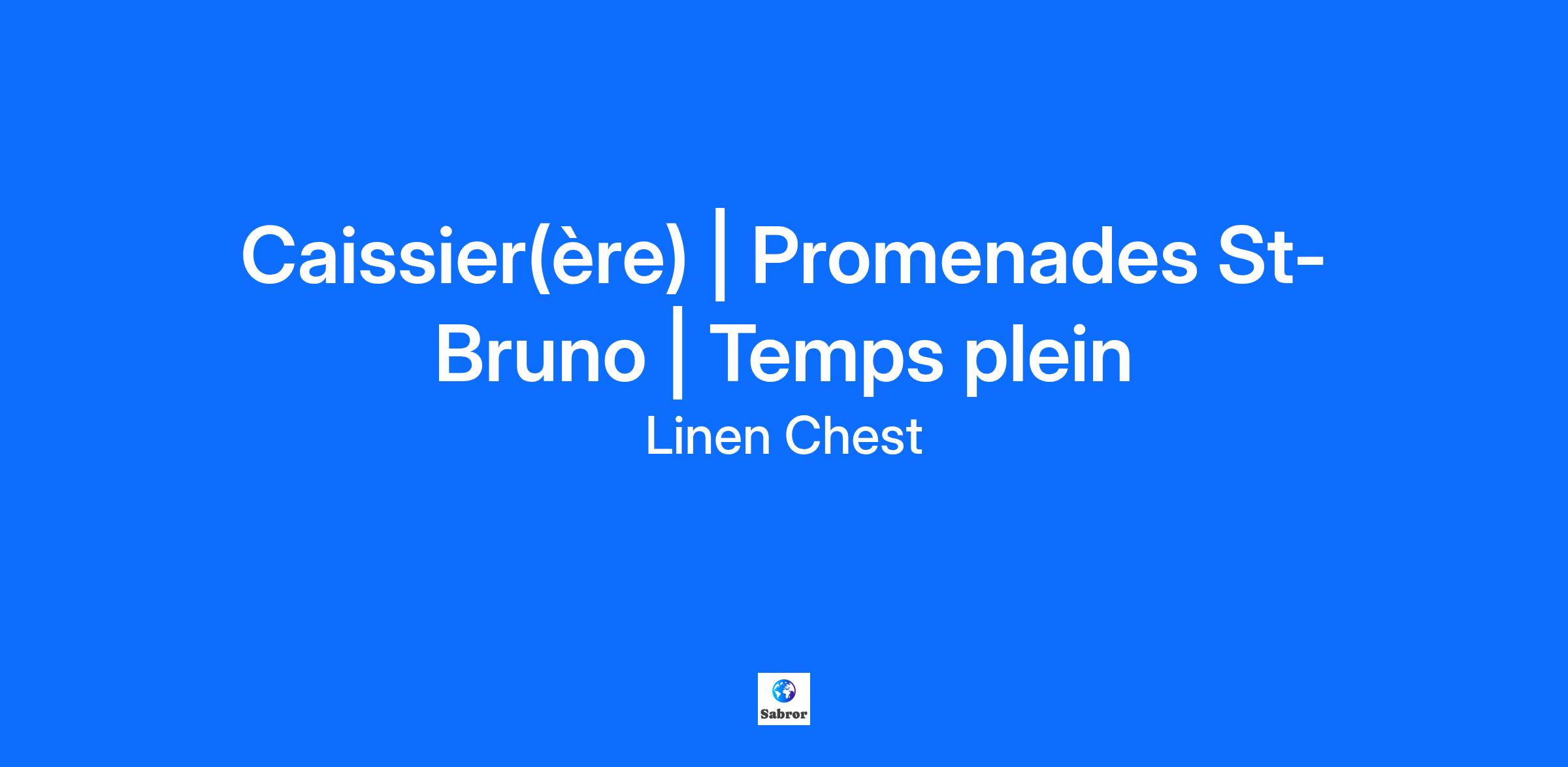 Description de l'entreprise Caissier(ère) | Promenades St-Bruno | Temps plein Vous aimez offrir aux clients un service avant et après-vente impeccable ? Vous êtes à l’aise avec les systèmes de caisse et la gestion d’argent ? Vous voulez faire partie d’une équipe dynamique ? Nous sommes à la recherche de quelqu'un comme vous pour rejoindre notre équipe ! Description du poste Ce que nous vous offrons : Entreprise familiale qui priorise le bien-être de ses employés ; Congés de maladies payées ; Environnement de travail humain où nos talents sont reconnus et appréciés ; Opportunités de croissance au sein de l’entreprise ; Formations et développement professionnels ; Possibilité de faire du temps plein ou du temps partiel selon vos préférences ; Programme d’assurances collectives (médical, paramédical et dentaire)* ; Programme de référencement (jusqu’à 1000$) ; Rabais sur tous les produits Linen Chest ; Qualifications Passionné du service à la clientèle ; Expérience avec une caisse ; Habile et à l’aise avec un ordinateur ; Capable de fournir un excellent service à la clientèle ; Disponible le jour, le soir et le weekend. Informations complémentaires Il s'agit d'une occasion exceptionnelle de travailler pour une entreprise qui vous permettra d'évoluer dans un environnement de travail où vous pourrez vous épanouir et faire la différence. Venez faire carrière au sein de la grande famille Linen Chest ! * Le générique masculin inclut le féminin et est utilisé sans aucune discrimination et uniquement dans le but d'alléger le texte.