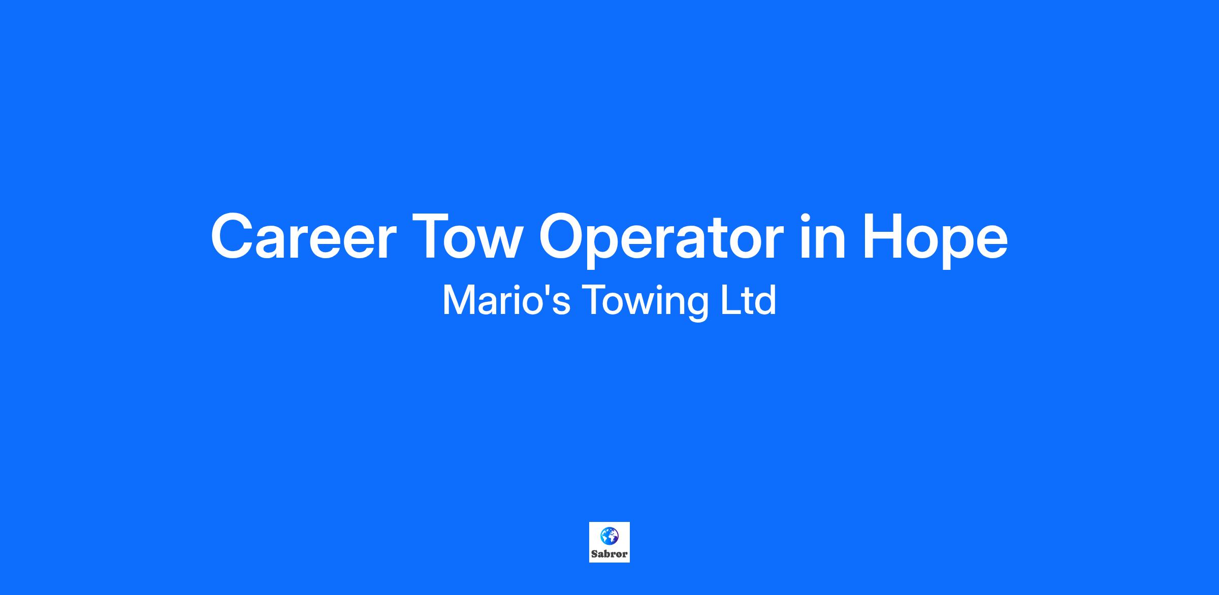 Mario's Towing Ltd. Kelowna location is growing. We are looking to add an additional member to the team in Hope! Light Duty Wrecker/Flatdeck Driver. Driving experience and a clean drivers abstract. Flexible availability required. Willing to train the right candidate. Team player is essential. Uniforms supplied. We offer state of the art equipment. Highest Operator Commission Percent in the trade. Please submit resume with drivers abstract by email to resume@mariostowing.com To see our other job postings click this link. https://tinyurl.com/yckhsus5 Looking to add operators in the following location: Hope Annual earnings are competitive and based on responsibilities Competitive company benefits package after 3 months. Job Type: Full-time Compensation: $70,000-$80,000.00 per year Benefits: Dental care Extended health care Life insurance RRSP match Vision care Schedule: 10 hour shift 12 hour shift Day shift Holidays Weekend availability Experience: towing: 1 year (preferred)