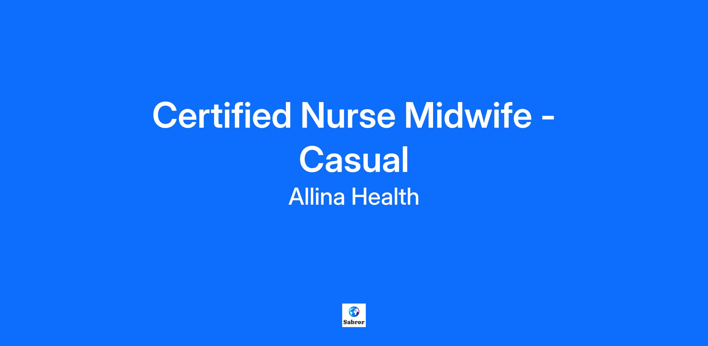Location Address: 2800 10th Ave Receiving Dock Minneapolis, MN 55407-1311 Date Posted: November 25, 2025 Department: 62894405 Allina Health Group OB GYN West Shift: Day/Evening/Night (United States of America) Shift Length: Variable shift length Hours Per Week: 0 Union Contract: Non-Union-NCT Weekend Rotation: Other Job Summary: As a casual Certified Nurse Midwife with Allin, you will step into a dynamic hospital-based environment, providing compassionate, evidence-based care to patients in labor and delivery settings. You’ll collaborate with obstetricians, nurses, and support staff at our Abbott and United Mother Baby Centers. Key Position Details: Practice details: Team of 16 plus CNM across the system Collaborative, supportive and encouraging teammates Opportunities for professional and personal growth- research, mentoring CNM and NP students, instrumental QI projects Support whole person population health care initiatives Contact: Katie Fryer, Senior Recruiter - katina.fryer@allina.com About the location: Abbott Northwestern Mother Baby Center 902 E 26th St, Minneapolis, MN 55404 The Mother Baby Center at Abbott Northwestern Hospital, in partnership with Children’s Minnesota, offers a state-of-the-art environment for labor, delivery, and postpartum care. Designed with families in mind, the center provides a safe, comfortable, and supportive experience throughout the birthing journey, ensuring exceptional care for both mother and baby. About Allina Health: A major regional health system. With a team 27,000 strong, Allina Health operates 12 hospitals, more than 60 clinics, and 100+ specialty care sites. Learn More Commitment to communities. Allina Health has a 140-year connection to our diverse communities. We make a difference through local health initiatives, volunteerism, and revitalization efforts in the places where we operate. Learn more Job Description: Principle Responsibilities CNM group independently provides labor support, water birth and VBAC/TOLAC services Midwifery collaborative support is provided by a supportive inhouse OB and maternal fetal medicine groups We attend approximately 40-50 births per month with three affiliated clinics. "Natural birth experience" highlighting nontraditional care in the hospital. Follows standards for Nurse Midwifery Practice established by the American College of Nurse-Midwives and Minnesota statute. Professional Liability insurance including tail Practice details: Team of 16 plus CNM across the system Collaborative, supportive and encouraging teammates Opportunities for professional and personal growth- research, mentoring CNM and NP students, instrumental QI projects Support whole person population health care initiatives Casual coverage at United and Abbott Mother Baby Centers Job Requirements Bachelor's degree Graduate from Accredited School of Nursing required Master's degree or doctoral in nursing or related field preferred Licensed Registered Nurse - MN Board of Nursing required upon hire BLS Tier 1 - Basic Life Support required within 180 Days AMCB American Midwifery Certification Board upon hire required Physical Demands Medium Work*: Lifting weight Up to 32 lbs. occasionally (*Allina Safe Patient Moving Policy), Up to 25 lbs. frequently Pay Range ERROR ERROR Benefit Summary Allina Health believes the best way to provide safe and compassionate care for our patients is by nurturing the passion of those who care for them. That’s why we devote extraordinary resources to help you grow and thrive — not only as a professional but also as a whole person. When you join our team, you have access to a wealth of valuable employee benefits that support the total well-being — mind, body, spirit and community — of you and your family members. Allina Health is all in on your well-being. Because well-being means something different to everyone, our award-winning program provides you with the resources you need to help you navigate your personal journey. This includes up to $100 in well-being dollars, dedicated well-being navigators, and many programs, activities, articles, videos, personal coaching and tools to support you on your journey. In addition, Allina Health offers employee resources groups (ERGs) -- voluntary, employee-led groups that serve as a resource for members and organizations by fostering a diverse, inclusive workplace aligned with the organization's mission, values, goals, business practices, and objectives. Allina Health also engages employees in various community involvement and volunteering events. Benefits include: Medical/Dental PTO/Time Away Retirement Savings Plans Life Insurance Short-term/Long-term Disability Paid Caregiver Leave Voluntary Benefits (vision, legal, critical illness) Tuition Reimbursement or Continuing Medical Education as applicable Student Loan Support Benefits to navigate the Federal Public Service Loan Forgiveness Program Allina Health is a 501(c)(3) eligible employer *Benefit eligibility/offerings are determined by FTE and if you are represented by a union. People at Allina Health have a career of making a difference in the lives of the millions of patients we see each year at our 90+ clinics, 12 hospitals and through a wide variety of specialty care services in Minnesota and western Wisconsin. We’re a not-for-profit organization committed to enriching your career by providing ongoing training, competitive compensation, support for work-life balance and ways to give back to the communities we serve. Join our team of 27,000+ employees – your career opportunities are limitless! Diversity creates a healthier atmosphere for our employees, patients, and community. Allina Health is proud to be an Equal Employment Opportunity employer, and will make employment decisions without regard to race, color, religion, sex, age, national origin, protected veteran status, disability status, sexual orientation, gender identity or expression, marital status, genetic information, or any other characteris