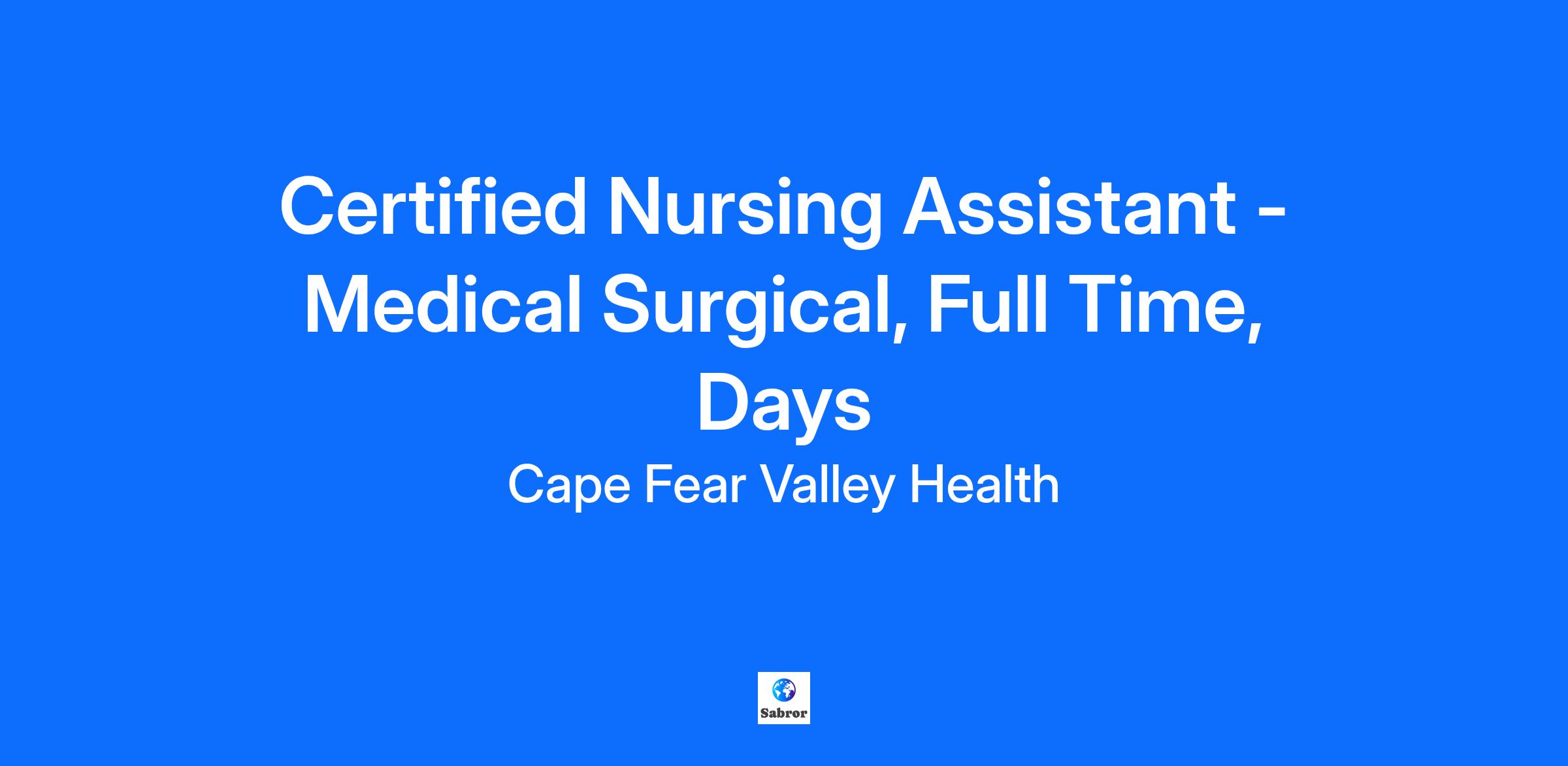 $7,500 Sign on Bonus Facility Hoke Hospital Location Raeford, North Carolina Department Medical Surgical Job Family Nursing Support Work Shift Days (United States of America) Summary Performs basic patient care. Observes and reports abnormal occurrences or changes in patient condition. Cleans, stocks and maintains supplies for the patient unit. Major Job Functions The following is a summary of the major essential functions of this job. The incumbent may perform other duties, both major and minor, that are not mentioned below. In addition, specific functions may change from time to time: Assists in the admission of patients to the unit to include orientation to the unit, hospital routine and patient care equipment Responds to needs of patients with direct assistance when able or by reporting patient needs to the appropriate person Assists with implementation of nursing plan of care by carrying out delegated patient care tasks Assists in maintaining patient safety to include the proper use of equipment and supplies Access to medication/supply room to retrieve patient care items for patient care use Maintains a well-stocked, clean patient environment Actively participates in cost containment and assists in accurate charging for patient services Participates in educational and Performance Improvement activities Maintains (if needed) 4 of NAII skills per unit competency Performs waived testing per unit competency Actively demonstrates responsibility concerning customer satisfaction, patient throughput and hospital functional capacity through compliance with the Hospital Innovation Project (HIP) Other duties as assigned Minimum Qualifications The following qualifications, or equivalents, are the minimum requirements necessary to perform the essential functions of this job: Education and Formal Training: High school graduate or equivalent required Nursing Assistant certification required Current registration with North Carolina Division of Facility Services Work Experience: None Knowledge, Skills, and Abilities Required: Excellent guest relations skills Verbal and written skills required Ability to read English Ability to accept supervision from a multidisciplinary team Flexible in approach to work tasks and schedules Able to grasp new skills and techniques Has basic knowledge of age-specific considerations for patients served Has basic computer skills Physical Requirements: Ability to work variable shifts Ability to turn and lift patients Much standing, walking, bending and lifting Possess visual and auditory acuity for observing patients Position involves exposure to blood and body secretions and may involve skin, eye, mucous membrane, or parenteral contact with blood or other potentially infectious material Required Licenses and Certifications BLS - American Heart Association, CNA - NC Nursing Assistant Registry Cape Fear Valley Health System is an Equal Opportunity Employer M/F/Disability/Veteran/Sexual Orientation/Gender Identity For exceptional healthcare come to Cape Fear Valley Health where caring employees are committed to integrity, patient-centeredness and excellence throughout the entire healthcare process. At Cape Fear Valley Health, our goal is to improve the quality of every life we touch. Our diverse team of doctors, nurses and staff work together to create a better experience for every patient, every time. Cape Fear Valley is a 950-bed, 8-hospital regional health system, the 8th largest in North Carolina, with more than 1 million inpatient and outpatients annually. A private not-for-profit organization with over 7,000 employees and 850 physicians. Our employees and physicians proudly serve a seven-county region of southeastern North Carolina, including Fayetteville, Fort Bragg, Hope Mills, Raeford, Lumberton, Elizabethtown, Clinton, Lillington, Dunn and beyond. Our medical facilities include Cape Fear Valley Medical Center, Highsmith-Rainey Specialty Hospital, Cape Fear Valley Rehabilitation Center, Behavioral Health Care, Bladen County Hospital, Hoke Hospital, Central Harnett Hospital, Betsy Johnson Hospital, as well as more than 60 medical offices and specialty care clinics spread throughout the Cape Fear region.