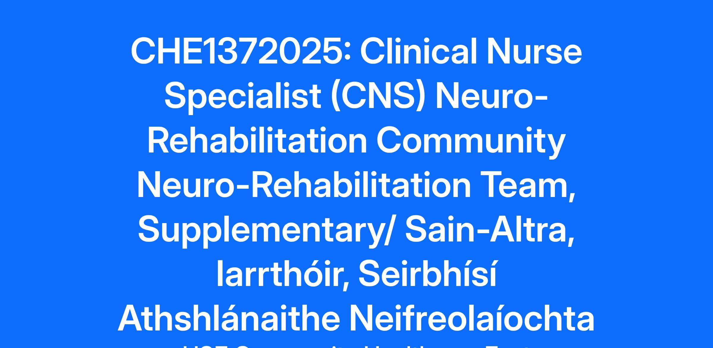A panel may be formed as a result of this campaign for Clinical Nurse Specialist (CNS) Neuro-Rehabilitation Community Neuro-Rehabilitation Team, HSE Dublin South & Wicklow from which current and future, permanent and specified purpose vacancies of full or part-time duration may be filled.