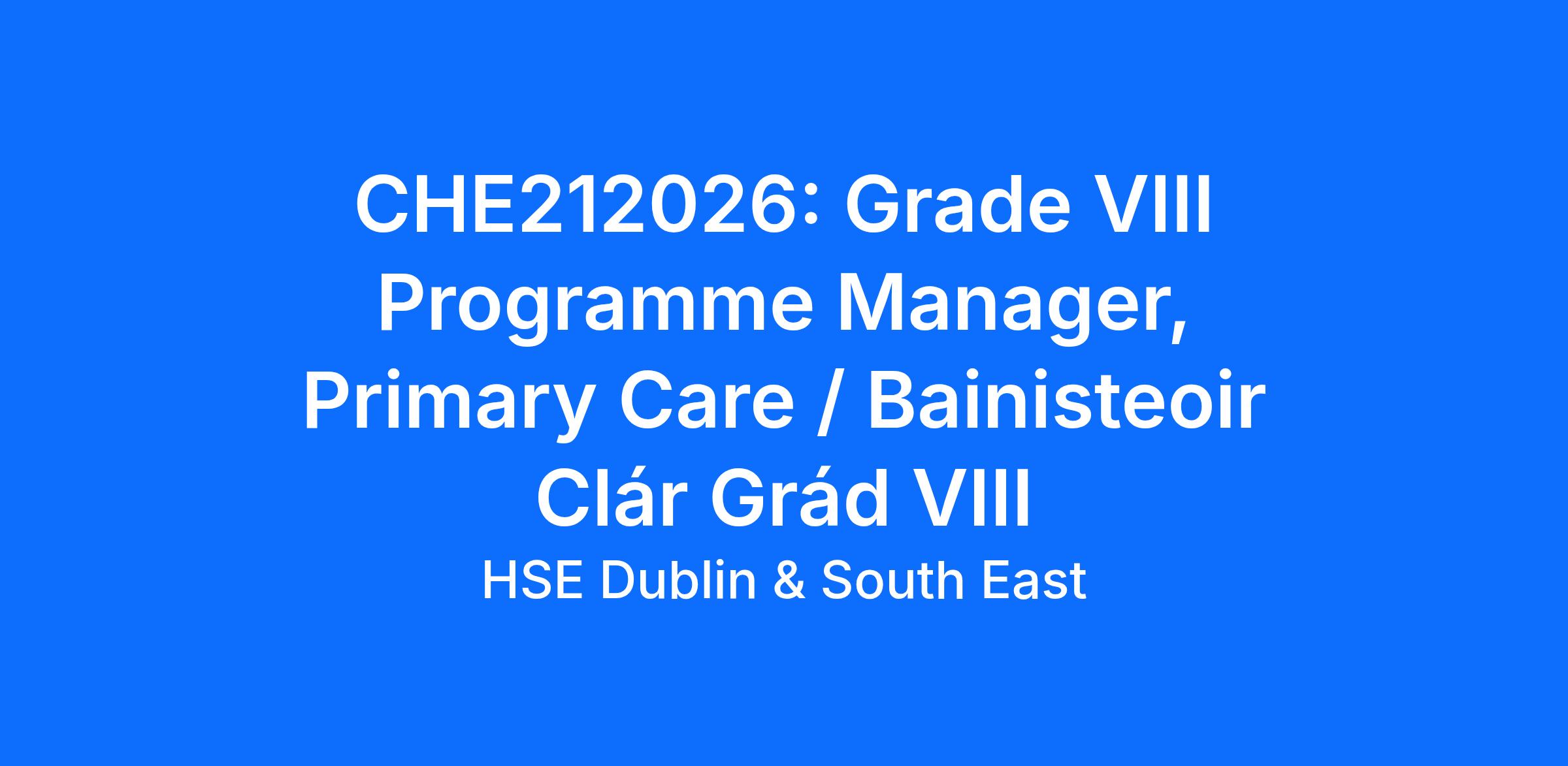 A panel may be formed as a result of this campaign for Grade VIII, Programme Manager Primary Care, Dublin South & Wicklow from which current and future, permanent and specified purpose vacancies of full or part-time duration may be filled.