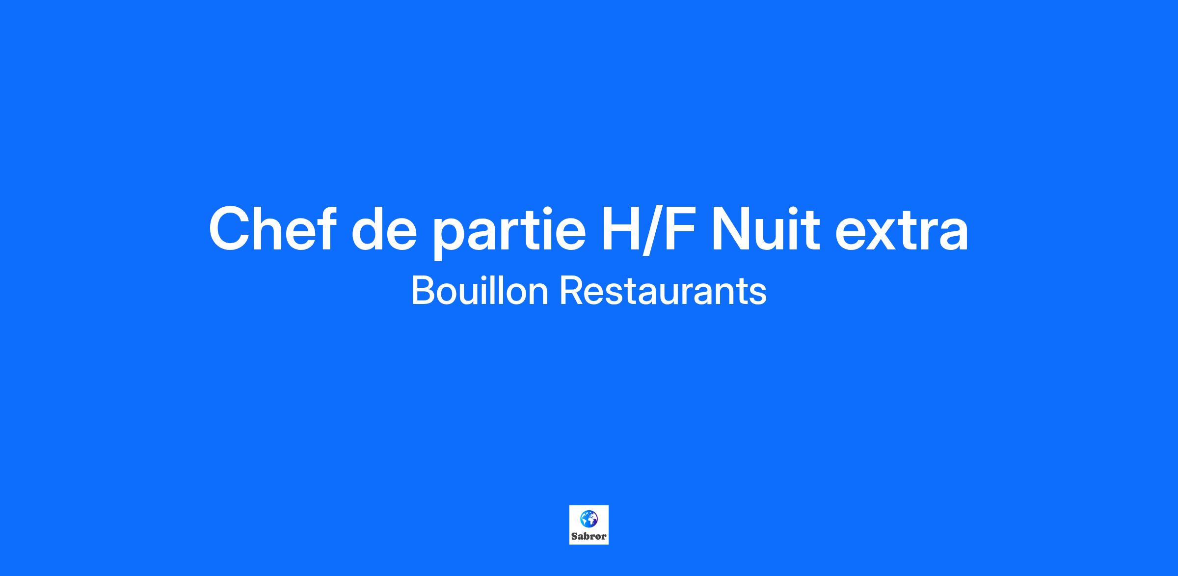 Le Bouillon fait partie d'un Groupe familial dynamique comprenant trois entités majeures : Bouillon Pigalle, Bouillon République et Bouillon Service (vente à emporter et livraison). Ensemble, ces établissements incarnent la tradition des Bouillons parisiens tout en offrant une expérience culinaire contemporaine. Avec une équipe familiale de plus de 300 collaborateurs, nous sommes engagés à offrir à nos clients une cuisine française authentique de qualité dans un cadre chaleureux, animé et typique de la Belle Époque. Bouillon recherche des passionnés pour renforcer ses équipes en cuisine ! Si tu justifies d'une expérience en tant que chef de partie ou demi-chef de partie confirmée, que tu mets le client au cœur de ton métier et aspires à une expérience unique dans la culture traditionnelle des Bouillons, nous avons le poste idéal pour toi. Les missions : En tant que Chef de partie tu seras le bras droit du second de cuisine et du 1er Chef de partie. Vous serez en charge de certaines cuissons et mise en place qui serviront aux établissements la journée: Cuissons et mise en place de divers produits Mise en bacs pour le transports Horaires : POSTE DE NUIT 23h / 07h --- 2 jours / semaines Profil recherché : Tu as le souci du travail bien fait Tu es concentré Tu sais travailler en autonomie Tu dégages une bonne énergie Tu garantis une expérience client irréprochable Les avantages : Possibilité d'évolution rapide au sein du Groupe Participation au forfait mobilité durable Prime annuelle, intéressement au chiffre d'affaire Comité d'entreprise ( bons cadeaux... ) Conformément à la législation en vigueur : Prise en charge de 50% du pass navigo Repas sur place (préparé avec soin par notre Chef)