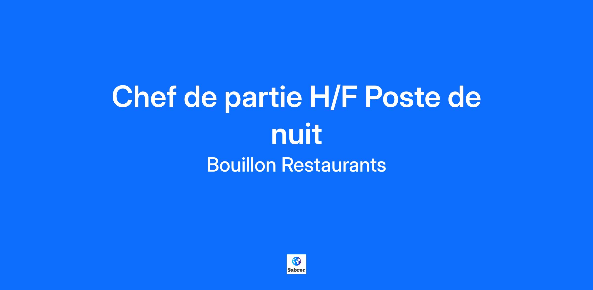 Le Bouillon fait partie d'un Groupe familial dynamique comprenant trois entités majeures : Bouillon Pigalle, Bouillon République et Bouillon Service (vente à emporter et livraison). Ensemble, ces établissements incarnent la tradition des Bouillons parisiens tout en offrant une expérience culinaire contemporaine. Avec une équipe familiale de plus de 300 collaborateurs, nous sommes engagés à offrir à nos clients une cuisine française authentique de qualité dans un cadre chaleureux, animé et typique de la Belle Époque. Bouillon recherche des passionnés pour renforcer ses équipes en cuisine ! Si tu justifies d'une expérience en tant que chef de partie ou demi-chef de partie confirmée, que tu mets le client au cœur de ton métier et aspires à une expérience unique dans la culture traditionnelle des Bouillons, nous avons le poste idéal pour toi. Les missions : En tant que Chef de partie tu seras le bras droit du second de cuisine et du 1er Chef de partie. Vous serez en charge de certaines cuissons et mise en place qui serviront aux établissements la journée: * Cuissons et mise en place de divers produits * Mise en bacs pour le transports Horaires : POSTE DE NUIT 23h / 07h 39h 5jours / 7 Profil recherché : * Tu as le souci du travail bien fait * Tu es concentré * Tu sais travailler en autonomie * Tu dégages une bonne énergie * Tu garantis une expérience client irréprochable Les avantages : * Possibilité d'évolution rapide au sein du Groupe * Participation au forfait mobilité durable * Prime annuelle, intéressement au chiffre d'affaire * Comité d'entreprise ( bons cadeaux... ) Conformément à la législation en vigueur : * Prise en charge de 50% du pass navigo * Repas sur place (préparé avec soin par notre Chef)