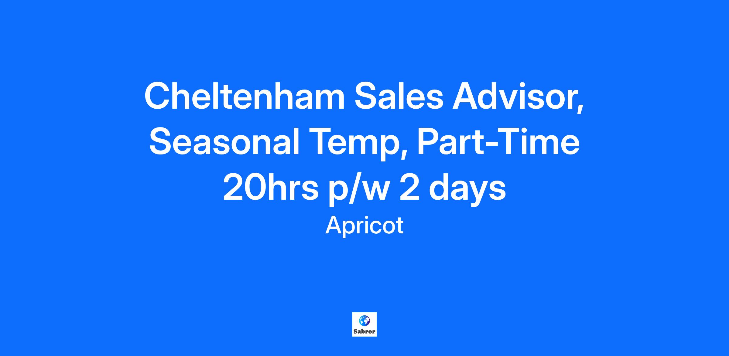 JOB TITLE: Sales Advisor LOCATION: Cheltenham CONTRACT: Part-Time, Seasonal Temp until 28/02/2026 HOURS: 10 hours over 2 days per week PAY RATE: Between £11.14 - £12.45 per hour We have an amazing opportunity to join our Apricot family in one of our retail stores! We are looking for knowledgeable Retail Sales Assistant looking to make their next step within fashion retail. Working within the store team, you will possess strong product knowledge, provide excellent customer service, and have great attention to detail. What we desire from our team Provide a great experience to every customer Keen to participate in all training opportunities Proactively integrate with all team members Maintain & understand product knowledge Embrace ownership of tasks Adhere to all operational practices and procedures, i.e. deliveries, health and safety standards, stock takes & replenishment. Maintain Shop floor Image Maintain excellent housekeeping standards throughout the store, including external and back of house/stockroom areas. Awareness of sales targets and performance How we imagine you Customer service focused Interested in fashion Flexible & adaptable Team player Motivated Keen to learn new skills Multi-tasker If you need any adjustments made during the recruitment and interview process do let us know. Join us and make a difference at the heart of Apricot's customer journey! Good Luck!
