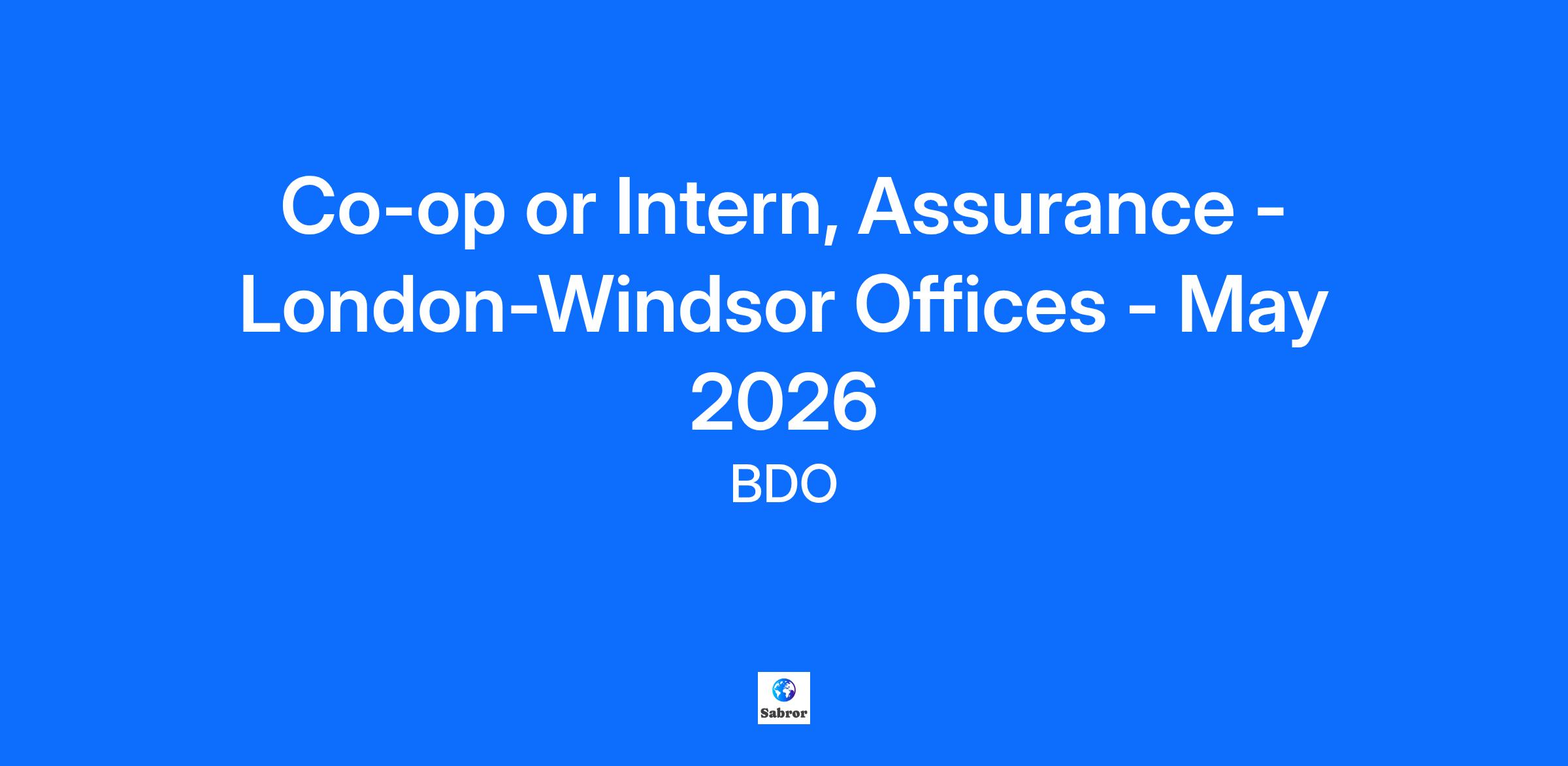 Putting people first, every day BDO is a firm built on a foundation of positive relationships with our people and our clients. Each day, our professionals provide exceptional service, helping clients with advice and insight they can trust. In turn, we offer an award-winning environment that fosters a people-first culture with a high priority on your personal and professional growth. Your Opportunity Our London-Windsor offices (London, Windsor, Chatham, Strathroy, Windsor, Woodstock) are looking for a 4-month Co-op Student or Intern to join the Assurance team from May to August 2026. This role is designed to offer a comprehensive learning experience in the field of accounting, exposing the Co-op or Intern to various aspects of financial reporting, analysis, compliance, and teamwork. The Co-op or Intern will own the following responsibilities: Efficiently utilize technical knowledge from courses to carry out work projects and assignments Prepare and complete working papers, financial information, and compilation engagements per regulatory standards Gather evidence for Assurance and Accounting engagements Build positive working relationships with clients and effectively respond to requests and suggestions Effectively communicate with team members regarding progress updates and issues on an ongoing basis Collaborate with and support the Financial Reporting & Insights team. How do we define success for your role? You demonstrate BDO's core values through all aspects of your work: Integrity, Respect & Collaboration You understand your clients’ industry, challenges, and opportunities; clients describe you as positive, professional, and delivering high quality work You identify, recommend, & are focused on effective service delivery to your clients You share in an inclusive & engaging work environment that develops, retains & attracts talent You actively participate in the adoption of digital tools and strategies to drive an innovative workplace You grow your expertise through learning & professional development. Your experience and education You are currently working towards a degree focused in accounting with a long-term goal of becoming a CPA You have a desire to provide outstanding client service and a commitment to teamwork You have proven leadership skills and can take initiative to seek understanding You display strong attention to detail, problem solving, analytical, and communication skills. Earn your CPA Designation At BDO, we’re committed to the success of students pursuing their CPA designation. We provide pre-approved programs across our 100+ offices, mentorship and support, reimbursement of exam fees, enrollment in Canada’s leading CFE prep course, and flexible options for study leave in order for you to be successful. Why BDO? Our people-first approach to talent has earned us a spot among Canada’s Top 100 Employers for 2025. This recognition is a milestone we’re thrilled to add to our collection of awards for both experienced and student talent experiences. Our firm is committed to providing an environment where you can be successful in the following ways: We enable you to engage with how we change and evolve, being a key contributor to the success and growth of BDO in Canada. We help you become a better professional within our services, industries, and markets with extensive opportunities for learning and development. We support your achievement of personal goals outside of the office and making an impact on your community. Giving back adds up: Where company meets community. BDO is actively involved in our communities by supporting local charity initiatives. We support staff with local and national events where you will be given the opportunity to contribute to your community. Total rewards that matter: We pay for performance with competitive total cash compensation that recognizes and rewards your contribution. We provide flexible benefits from day one, and a market leading personal time off policy. We are committed to supporting your overall wellness beyond working hours and provide reimbursement for wellness initiatives that fit your lifestyle. Everyone counts: We believe every employee should have the opportunity to participate and succeed. Through leadership by our Diversity, Equity and Inclusion Leader, we are committed to a workplace culture of respect, inclusion, and diversity. We recognize and celebrate the valuable differences among each of us, including race, religious beliefs, physical or mental disabilities, age, place of origin, marital status, family status, gender or gender identity and sexual orientation. If you require accommodation to complete the application process, please contact us. Flexibility: All BDO personnel are expected to spend some of their time working in the office, at the client site, and virtually unless accommodations or alternative work arrangements are in place. Our model is a blended approach designed to support the flexible needs of our people, the firm and our clients. It’s about creating work experiences that meet everyone’s needs and providing flexibility to adjust when, where and how we work to meet the expectations of our role. Code of Conduct: Our Code of Conduct sets clear standards for how we conduct business. It reflects our shared values and commitments and includes guiding principles to help us make ethical decisions and maintain trust with each other, our clients, and the public. With your consent, BDO Canada may use AI technology (Microsoft Copilot) to transcribe during preliminary conversations, solely for the purpose of note-taking and not for other purposes, such as resume review, evaluation or selection of candidates. More information on BDO Canada’s Privacy Policy can be found here: Privacy Policy | BDO Canada Ready to make your mark at BDO? Click “Apply now” to send your up-to-date resume to one of our Talent Acquisition Specialists. To explore other opportunities at BDO, check out our careers page. Wh