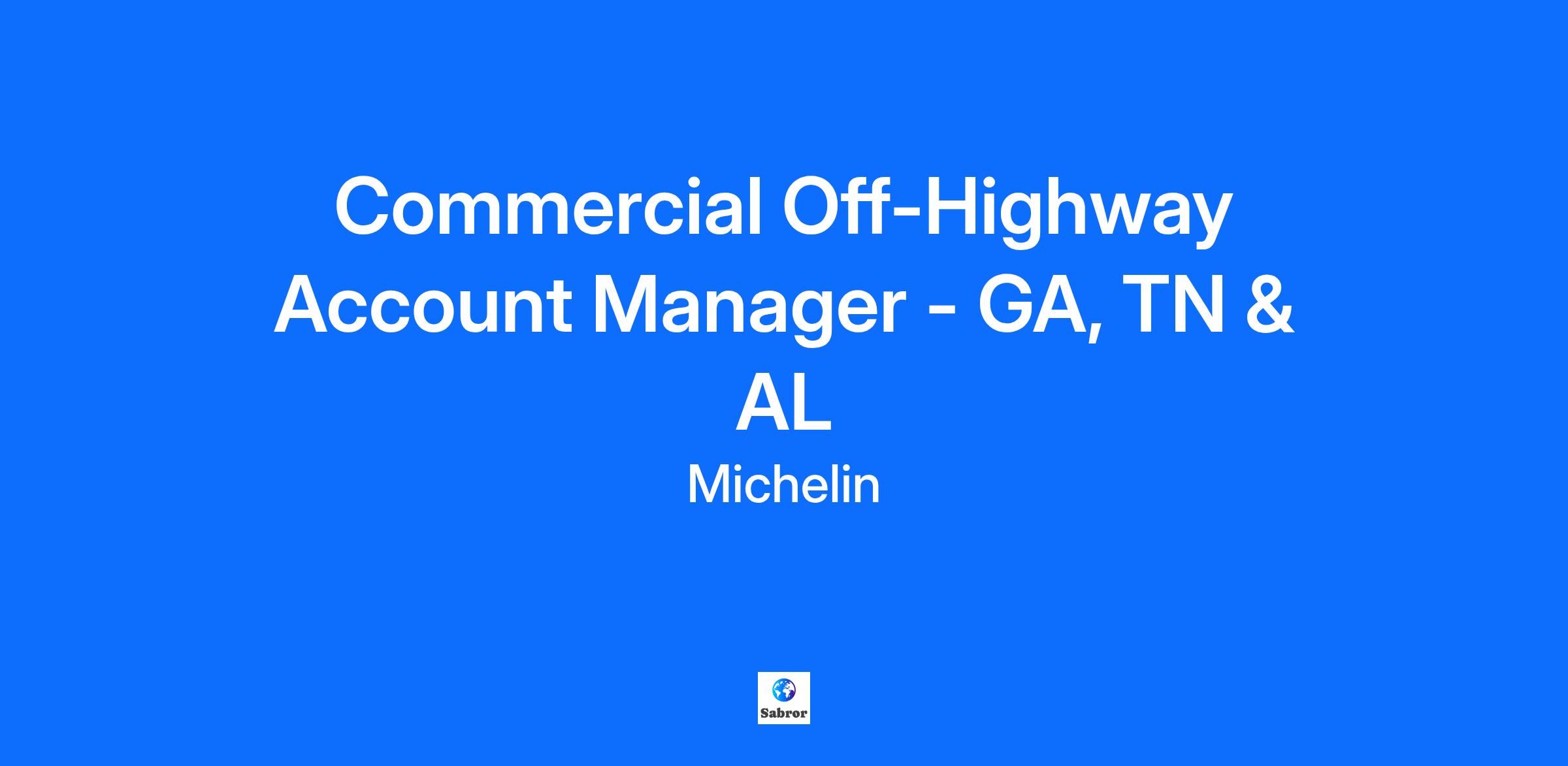 Commercial Off-Highway Account Manager - GA, TN & AL Build a Career That Matters with One of the World’s Most Respected Employers! - - - - - - - - - - - - THE OPPORTUNITY Join Michelin, the worldwide leader in tires! We’re looking for an experienced Commercial Account Manager to help grow our business and strengthen customer relationships. This sales role is key to driving portfolio growth, profitability, and delivering value to our clients. If you are a highly motivated team player looking for an exciting sales career, Michelin is the place for you. The territory covered by this role is Georgia, Tennessee and Alabama and requires 30-50% travel. This position requires the candidate to be based in Atlanta, GA, Nashville, TN or Birmingham, AL WHAT WILL YOU DO Sell tires for the most awarded tire company in the world Build and maintain strong relationships with commercial clients. Manage accounts end-to-end and coordinate internally to meet client needs. Identify new business opportunities and expand our client base. Use a consultative approach to recommend solutions that align with client goals. Track performance metrics and take action to ensure success. WHAT WILL YOU BRING Bachelor’s degree or equivalent experience. Strong communication and relationship-building skills. Ability to work collaboratively and think critically. Problem-solving skills to address client challenges and deliver solutions. Comfortable analyzing data and trends. Proficiency in Microsoft Office; Salesforce experience is a plus. #LI-HIRINGMICHELIN #LI-JM1 Ready to Shape the Future of Innovation? Michelin is building a world-leading manufacturer of life-changing composites and experiences. Pioneering engineered materials for more than 130 years, Michelin is uniquely positioned to make decisive contributions to human progress and a more sustainable world. Drawing on its deep know-how in polymer composite materials, Michelin is constantly innovating to manufacture high-quality tires and components for critical applications in demanding fields as varied as mobility, construction, aeronautics, low-carbon energies and healthcare. The care placed in its products and deep customer knowledge inspire Michelin to offer the finest experiences. This spans from providing data- and AI-based connected solutions for professional fleets to recommending outstanding restaurants and hotels curated by the MICHELIN Guide. Why Michelin? Career Growth: Personalized development plans, mentorship, and cross-functional opportunities. Unique career paths and opportunities for advancement. Inclusive Culture: Thrive in a diverse, supportive environment where your competencies, contributions and behaviors are recognized. Option to join one of our Business Resource Groups and Inclusion Councils. Innovation-Driven: Work on projects that matter—from sustainable materials to digital transformation. Community Impact: Be part of a company that does what's right. We use sustainable business practices while balancing the needs of our customers and communities. Michelin provides equal employment opportunities to all employees and applicants for employment and prohibits discrimination and harassment of any type without regard to race, color, religion, sex (including pregnancy, gender identity, and sexual orientation), parental status, national origin, age, disability, genetic information (including family medical history), political affiliation, military service, or other non-merit-based factors. Consistent with these obligations, Michelin also provides reasonable accommodations to employees and applicants with disabilities and for sincerely held religious beliefs. If you need accommodation for any part of the employment process because of a disability, please contact us at accommodations@michelin.com. This position is not available for immigration sponsorship. We build the future with people like you. Begin your career with Michelin today! Michelin, the leading tire company, is dedicated to sustainably improving the mobility of goods and people by manufacturing and marketing tires and services for every type of vehicle, including airplanes, automobiles, bicycles/motorcycles, earthmovers, farm equipment and trucks. It also offers digital mobility support services and publishes travel guides, hotel and restaurant guides, maps and road atlases. Headquartered in Clermont-Ferrand, France, Michelin is present in more than 170 countries, has 111,200 employees and operates 67 production plants in 17 different countries. Michelin has a Technology Center in charge of research and development, with operations in Europe, North America and Asia. In short, whether you look at our mission, our products or our people, Michelin is a company that truly helps you to move forward... Visit our website to discover more about us www.michelin.com
