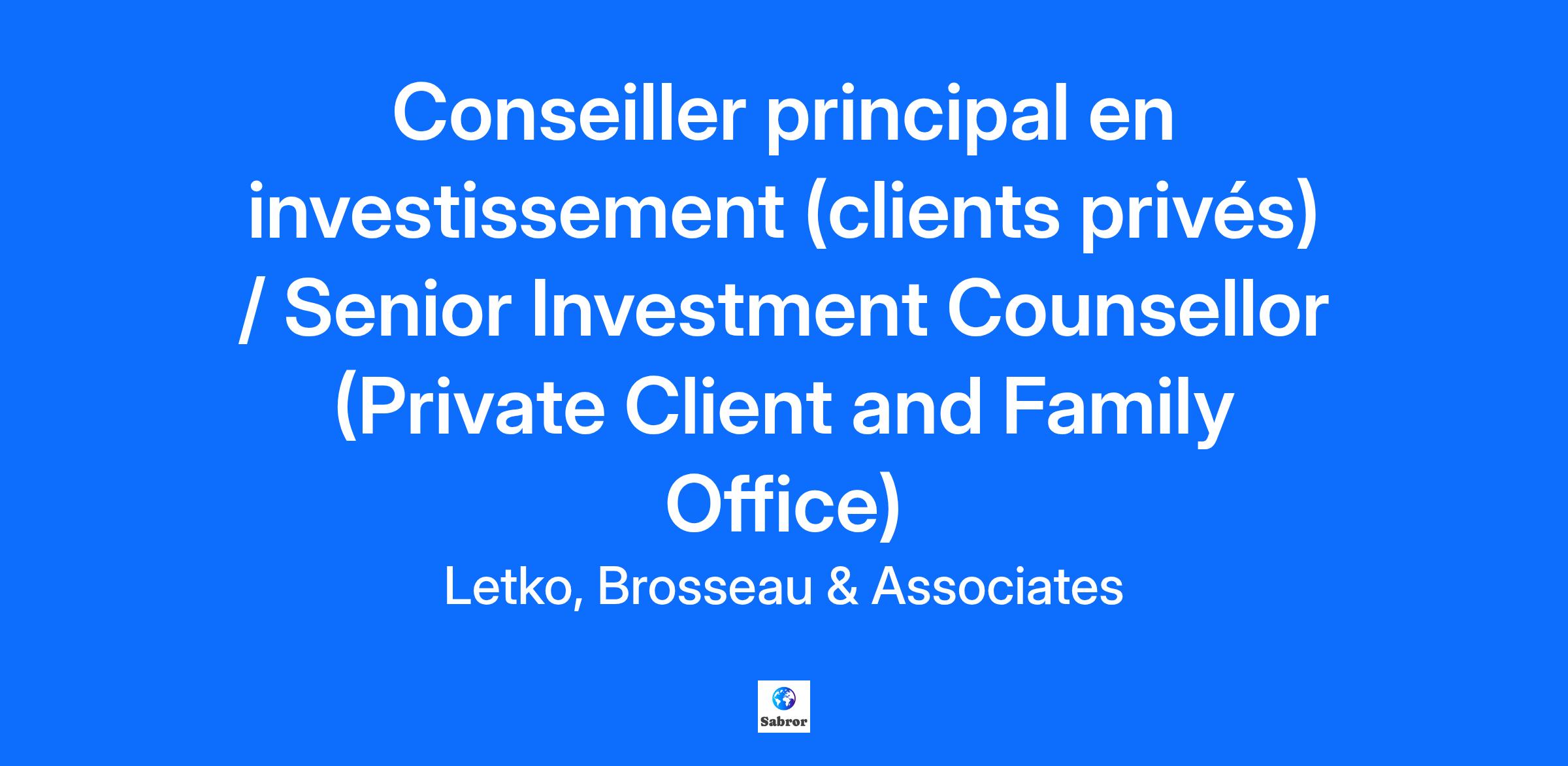 Letko, Brosseau & Associates est l'un des principaux gestionnaires d'investissement indépendants au Canada. Fondée en 1987, la société propose un ensemble diversifié de solutions d'investissement à une clientèle nationale et internationale. Nous sommes convaincus que notre approche axée sur les affaires et la recherche fondamentale, notre solide culture éthique et notre engagement fiduciaire envers nos clients ont été les clés de notre croissance et de notre succès à long terme. Grâce à notre engagement continu et actif auprès des entreprises dans lesquelles nous investissons, nous cherchons à contribuer à un changement positif, tout en obtenant des rendements supérieurs pour nos clients. Nous recherchons un professionnel passionné par les marchés financiers et le développement commercial auprès de clients privés. Ce poste est essentiel à la croissance et au développement de notre société. Le conseiller principal en investissement sera chargé d'identifier, de prospecter et de gérer de nouvelles relations commerciales avec des clients privés et des sociétés de gestion des affaires familiales. Ce poste exige une compréhension approfondie des marchés financiers et une connaissance approfondie du paysage des clients privés et des sociétés de gestion des affaires familiales. au Canada. Le conseiller principal en investissement agira également à titre de conseiller de confiance auprès d'un certain nombre de clients privés actuels de l'entreprise. Il sera chargé d'examiner la répartition des actifs et la politique d'investissement, d'expliquer les décisions relatives au portefeuille et de discuter des perspectives d'investissement de l'entreprise. Responsabilités principales: Développement d’affaires Prospecter, identifier et qualifier de manière proactive les clients potentiels et développer un processus de vente adapté afin de tirer parti des opportunités du marché dans le centre du Canada (Ontario et Manitoba). Élaborer et mettre en œuvre des stratégies de développement commercial ciblées en vue de pénétrer divers segments de clientèle privée et de family office. Établir des relations commerciales avec diverses entités et personnes susceptibles d'aider l'entreprise à renforcer sa présence dans les segments de la clientèle privée et des family office. Participer à des événements et conférences du secteur. Gestion des relations clients Se forger une réputation auprès des clients en tant que conseiller en placement efficace et perspicace, et partenaire de confiance à long terme. Cultiver et entretenir des relations solides et durables avec les clients privés existants. Se tenir au courant de la stratégie d'investissement de l'entreprise, de ses perspectives économiques et des marchés financiers. Communiquer régulièrement avec les clients et les intermédiaires afin de partager la stratégie d'investissement, la philosophie et les perspectives économiques et financières de l'entreprise. Examiner les politiques d'investissement et la composition des actifs et recommander des changements si nécessaire. Fournir régulièrement aux clients des informations actualisées sur l'évolution de leur portefeuille par le biais de documents, d'e-mails, de présentations téléphoniques et en personne. Répondre aux questions des clients sur leurs avoirs, la stratégie d'investissement de l'entreprise, les perspectives économiques ou d'autres questions ayant une incidence sur leurs portefeuilles. Traiter et surveiller les transactions des clients et veiller à leur conformité. Assurer la liaison avec les dépositaires, les comptables, les consultants et les autres parties au nom des clients. Collaborer avec les équipes internes (gestion de portefeuille, service à la clientèle et conformité) afin de garantir la satisfaction des clients et la prestation d'un service de haute qualité. Indicateurs de réussite à court et à long terme : Se forger une réputation auprès des clients en tant que conseiller en placement efficace et perspicace, et partenaire de confiance à long terme. Développer des relations solides avec les clients existants et nouveaux. Développer la clientèle et les actifs sous gestion de l'entreprise. Être ambassadeur des valeurs de l'entreprise. Profil recherché: Diplôme universitaire en finance, économie ou dans une discipline connexe (un MBA/Maîtrise est un atout) Au moins dix (10) ans d'expérience dans un poste similaire (gestionnaire de portefeuille, gestionnaire des relations avec la clientèle, développement des affaires, etc.) dans le domaine de la gestion de placements, de la banque d'investissement ou de la consultation Titre de CIM et/ou CFA Satisfaire aux exigences de la CVMO, de l'AMF et des autres autorités provinciales pour s'inscrire en tant que conseiller en placement Le bilinguisme, tant à l'oral qu'à l'écrit (anglais et français) Qualifications requises pour le candidat idéal: Professionnel chevronné de la gestion d'investissements, ayant fait ses preuves dans l'établissement de relations fructueuses et durables dans le domaine de la clientèle privée et des family offices. Fortement axé sur les résultats et capable d'atteindre les objectifs de vente Solides compétences en analyse financière et expérience des marchés des capitaux Présence professionnelle et excellentes aptitudes relationnelles et de présentation Esprit d'initiative et capacité à travailler de manière autonome Engagement en faveur de l'intégrité, de la transparence et de normes éthiques élevées. Salaire et avantages sociaux : Salaire de base compétitif plus prime annuelle Programme de commission avantageux Programme d'avantages sociaux allant de la couverture médicale et dentaire à l'assurance vie et invalidité Contribution de l'employeur à un régime de participation différée aux bénéfices (RPDB) Environnement de travail hybride Nous remercions tous les candidats pour leur 