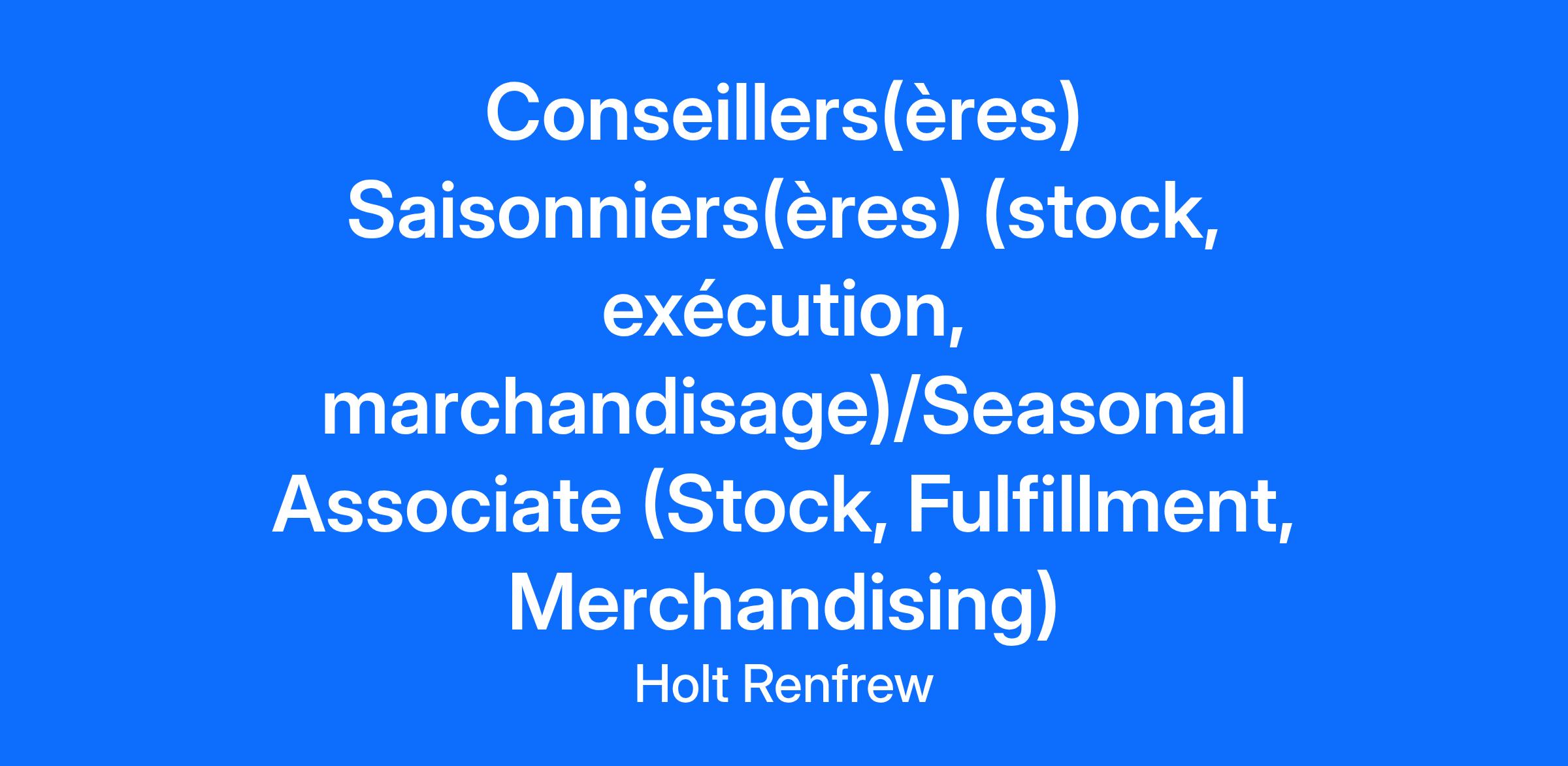 Holt Renfrew offers you an inspiring, fashion-driven environment with opportunities to learn and grow. From our incredible partnerships with iconic luxury brands, to our commitments to corporate social responsibility, you will be inspired every day. Conseillers(ères) Saisonniers(ères) (stock, exécution, marchandisage) Vous aimez l'effervescence de la saison des fêtes? Vous recherchez un travail à temps plein ou à temps partiel qui vous permettra de vous amuser et de faire une différence dans la journée d’une autre personne? Nous recrutons actuellement des conseillers(ères) saisonniers(ères) pour nos magasins! Qui sommes-nous? Holt Renfrew est le détaillant de luxe principal au Canada, proposant des vêtements, des chaussures, des accessoires et des produits de beauté des marques des plus prestigieuses maisons de mode au monde, pour femmes et pour hommes. Rejoignez-nous dans nos magasins d'un bout à l'autre du pays, où nous nous efforçons de faire de chaque visite une expérience inspirée et distincte de la mode de luxe. Pourquoi embauchons-nous dans nos magasins? Les conseillers(ères) saisonniers(ères) travaillent en collaboration avec les équipes des magasins pour inspirer une vie sous le signe du style et offrir des expériences de shopping extraordinaires à nos clients. Les postes de conseillers(ères) saisonniers(ères) sont disponibles dans les domaines suivants (les besoins de chaque magasin varient) Ce que nous offrons : Taux de rémunération compétitif entre 18 et 20 $ de l'heure, en fonction de l'expérience. 0 à 39 heures par semaine. Remise pour employés saisonniers Une atmosphère amusante et conviviale avec une formation enc ours d’emploi Travailler en coulisses (préparation de commande, expédition et réception, soutien des stocks) : Préposé(e) à la préparation des commandes : Préparation de toutes les commandes en ligne et des transferts entre magasins pour répondre aux besoins des clients, et autres tâches assignées Autres tâches assignées Conseiller(ère), Soutien des stocks : Veiller à ce que l'espace de vente soit maintenu en permanence à un niveau de luxe grâce au réapprovisionnement des produits et en observant les normes de commercialisation en rayon Entretien des cabines d'essayage Autres tâches assignées Exigences : Passion pour la marque et le service à la clientèle Capacité à travailler dans un environnement en évolution rapide Compétences avérées en matière de travail d'équipe Capacité à se tenir debout pendant de longues périodes, à se déplacer entre le magasin et les bureaux arrière et à soulever jusqu'à 30 lbs, capacité à utiliser une échelle, à déplacer des articles d'exposition, si nécessaire. Aptitude à travailler une variété de quarts de travail, y compris le matin, l'après-midi et le soir pendant les fêtes de fin d'année, entre le 20 octobre et le 10 janvier Possibilité de postes de nuit supplémentaires pendant la semaine de pointe du vendredi fou, selon le principe du premier arrivé, premier servi ou du volontariat. Des primes de nuit seront offertes. Seasonal Associate (Stock, Fulfillment, Merchandising) Do you enjoy the hustle and bustle of holiday season? Are you looking for full-time/part-time work? We are hiring back-of-house seasonal associates for our stores! Who are we? Holt Renfrew is Canada's leading luxury retailer, offering designer apparel, footwear, accessories, and beauty products from the world’s most prestigious fashion houses, for both women and men. Join us at stores nation-wide, where we aim to make your every visit an inspired and distinct experience in luxury fashion. What are we hiring for in our stores? Seasonal Associates work in collaboration with the store teams to Inspire a Life of Style and provide extraordinary shopping experiences for our customers. Seasonal Associate roles are available in the following areas (needs of each location will vary) What we offer: Competitive pay rate between $18- $20/ hour, based on experience 0 – 39 hours per week Seasonal employee discount A fun & friendly atmosphere with on- the – job training provided Working behind the scenes (Order Fulfillment, Shipping & Receiving, Stock Support): Order Fulfillment Associates: Fulfillment of all online orders and inter-store transfers to meet customer needs Read orders, locate product and package it to Holt Renfrew standards Other duties as assigned Stock Support Associates: Ensure the sales floor is maintained to luxury levels at all times through product replenishment, maintaining floor merchandising standards Fitting rooms maintenance Other duties as assigned Visual Merchandising Associates: Assemble Holiday Shop fixtures, place signage, props and displays in compliance with Holt Renfrew standards and directives Re-work presentations/ displays as merchandise sells down, rotate stock as required, ensuring established visual merchandising standards are maintained throughout the store interiors and windows Properly maintain the visual stockroom & visual merchanting collateral Requirements: Passionate about the brand and customer service Ability to work in a fast-paced environment Demonstrated teamwork skills Ability to stand for periods of time, moving between the store and back-office areas and ability to lift up to 30 lbs, ability to use a ladder, move display items, as required Ability to work a variety of shifts including mornings/afternoons/evenings/ weekends during the holiday season between October 20th and January 10th Opportunity for additional overnight shifts available during Black Friday peak sales week, on a first come, first served/ volunteer basis. Overnight shift premium pay rates will be offered. Holt Renfrew is an equal opportunity employer committed to fostering a diverse and inclusive workplace. Our future success depends on the perspectives and contributions of all our employees -- their diverse backgrounds, abilities and experiences make our busin