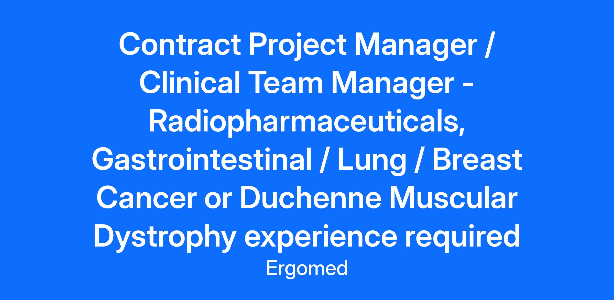 Company DescriptionErgomed Group is a rapidly expanding full service mid-sized CRO specialising in Oncology and Rare Disease. Since its foundation in 1997 the company has grown organically and steadily by making strategic investments and landmark acquisitions, with operations in Europe, North America and Asia We have nourished a true international culture here at Ergomed. Come and join us in this exciting journey to make a positive impact in patient’s lives. Job DescriptionWe are recruiting for a contract Project Manager or contract Clinical Team Manager wiuth previous experience running global trials in Radiopharmaceuticals, Gastrointestinal / Lung / Breast Cancer or Duchenne Muscular Dystrophy. Ensure that projects are delivered on time, within budget, and agreed scope, maintaining the appropriate industry, sponsor and Ergomed quality standards Liaise with project team members, provide training where needed and ensure correct allocation to tasks Develop, review and edit project plans to assure consistency with goals and milestones Organization and facilitation of project meetings related to study activities (study organization, initiation, execution, closure) Serve as primary point of contact with sponsor and Ergomed Senior Management on project status Represent Ergomed at external meetings, providing liaison with scientific/medical experts in other CRO/Sponsor companies and for committee meetings, (e.g.EC/IRB) Develop review and edit of relevant SOPs to assure consistency with Regulatory standards and develop study related training programs to support this. Contribute to bid defense activities QualificationsExperience serving as a Project Manager of international clinical trials in a CRO environment Experience with global Radiopharmaceuticals, Gastrointestinal / Lung / Breast Cancer or Duchenne Muscular Dystrophy clinical trials. Strong analytical, organizational and communication skills Bachelor’s Degree in a science related discipline. Additional InformationOur core values are key to how we operate, and if you feel they resonate with you then Ergomed is a great company to join! Quality Integrity & Trust Drive & Passion Agility & Responsiveness Belonging Collaborative Partnerships We look forward to welcoming your application.