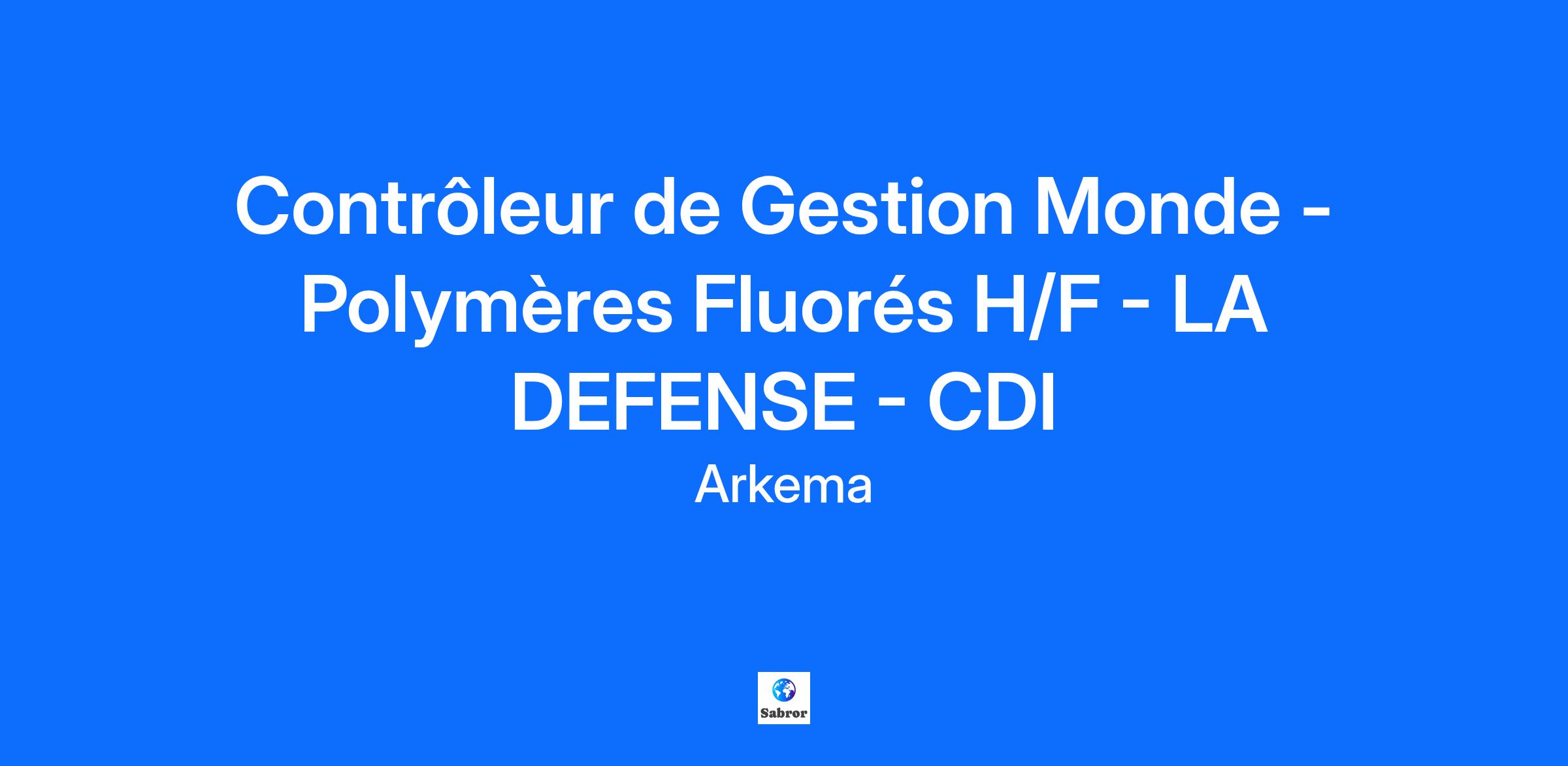 Détails de la Mission Arkema recherche un(e) Contrôleur de Gestion Monde – Polymères Fluorés basé(e) à La Défense. Rattaché(e) au Responsable Finance du segment High Performance Polymers. Missions principales : - Consolidation mondiale des Polymères Fluorés : * Consolider et valider le reporting mensuel (Flash, reporting DCCG, Brochure). * Préparer et présenter les résultats aux réunions mensuelles (RCG + DCCG). * Définit et met en place de nouveaux indicateurs pour le pilotage de l’activité (Résultat, BFR, Cash-flow, Nouveaux développements, …). * Coordonner et consolider mondialement le budget, la prévision de clôture, les prévisions mensuelles. - Contribution aux études économiques des Polymères Fluorés : * Évaluer la rentabilité économique des projets d’investissement ou d’acquisition. * Assurer le suivi périodique des projets pour la direction du plan. * Participer à l’élaboration et la consolidation du plan à 5 ans. - Développement Durable : Contribution aux analyses et reporting : * Notamment, évaluation des risques financiers liés aux évolutions des réglementations. - Respect des règles de contrôle interne : * Gérer les habilitations / délégations. * Suivre le reporting risques / EHB. * Participer aux réunions avec les auditeurs, consultants. - Optimisation et fiabilisation du reportingProfil Recherché - Vous avez un Bac+5 – Finance Comptabilité ou expérience équivalente avec minimum 5 ans d’expérience.- Vous êtes réactif(ve), flexible, curieux(se) et avez une bonne capacité à communiquer.- Vous avez de l'appétence pour les systèmes d’information et les tableurs.