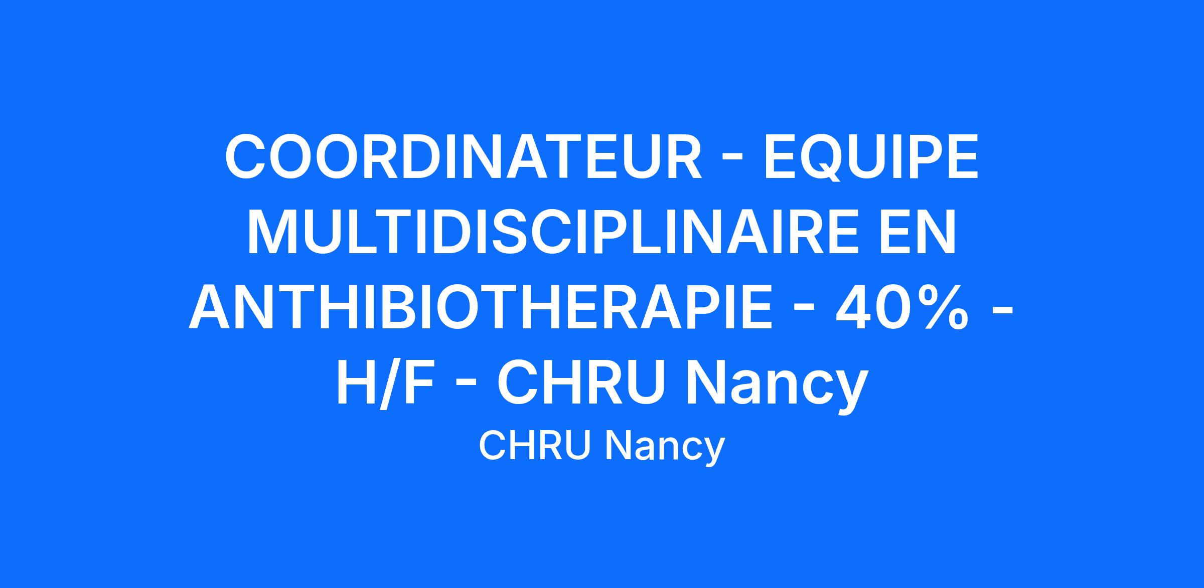 Le Département Territorial de la Qualité et des Usagers (DTQU) du CHRU de Nancy recrute un Coordinateur au sein de l’Equipe Multidisciplinaire en Antibiothérapie (EMA) Sud Lorraine sur le site de l’Hôpital Central.