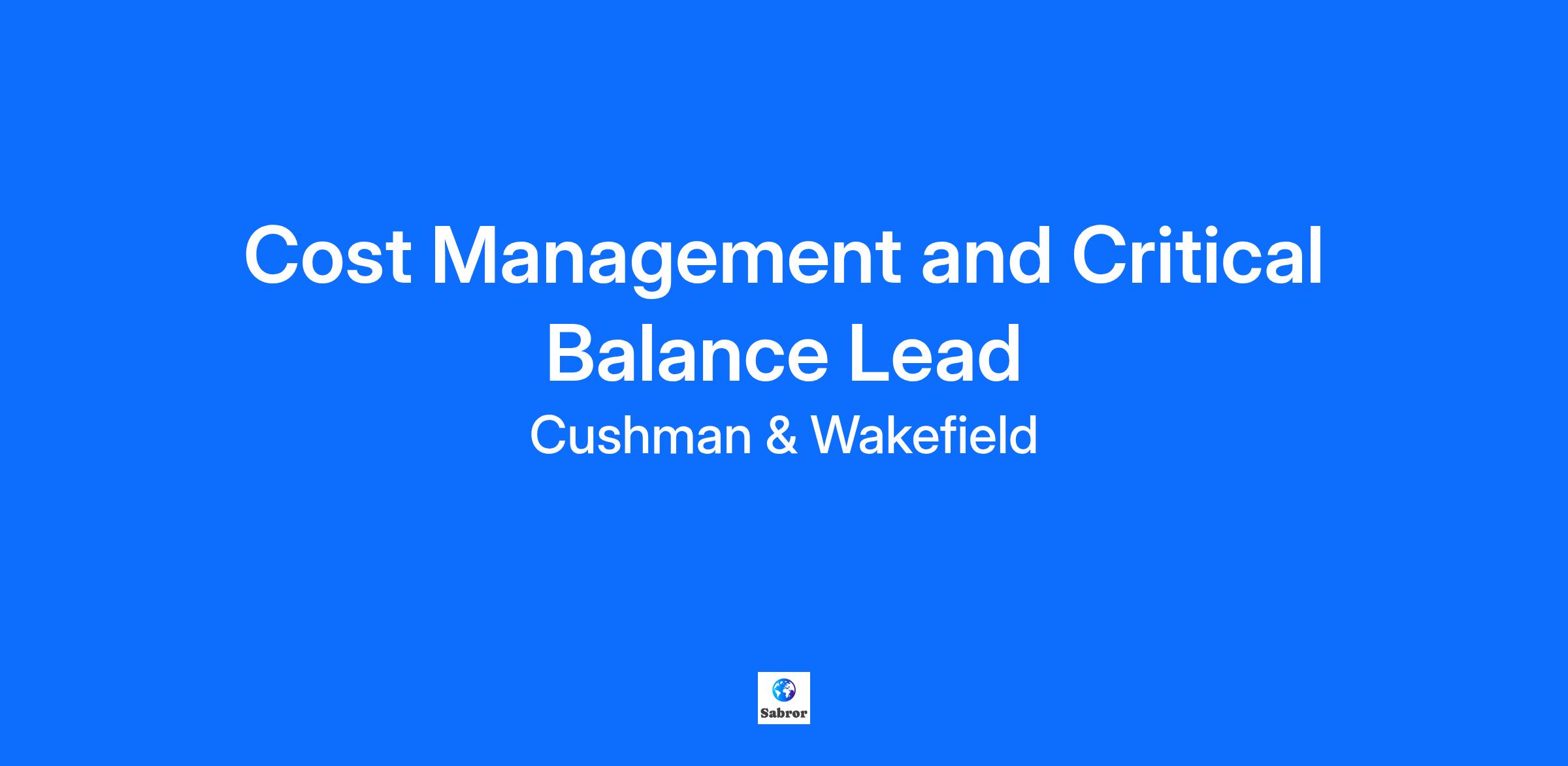 Job Title Cost Management and Critical Balance Lead Job Description Summary #LI-DNI Job Description #LI-DNI INCO: “Cushman & Wakefield” About Cushman & Wakefield Cushman & Wakefield (NYSE: CWK) is a global leader in real estate services, leveraging our specialized expertise to deliver innovative solutions and exceptional value to owners and occupiers. With 52,000 employees in nearly 400 offices across 60 countries, we are one of the largest firms in the industry, with more than 100 years of history. In 2023, we generated $9.5 billion in revenue from our core services. To learn more, visit www.careers.cushmanwakefield.com.