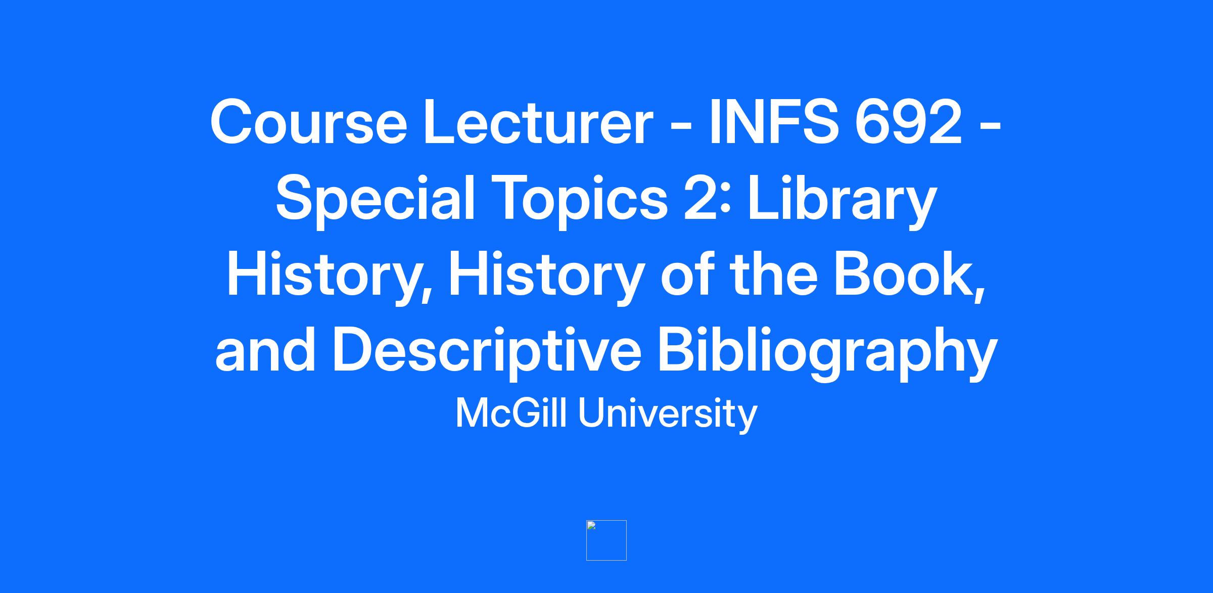 Please refer to the How to Apply for a Job (for External Candidates) job aid for instructions on how to apply. If you are an active McGill employee (ie: currently in an active contract or position at McGill University), do not apply through this Career Site. Login to your McGill Workday account and apply to this posting using the Find Jobs report (type Find Jobs in the search bar). McGill’s School of Information Studies Master’s program (https://www.mcgill.ca/sis/home) is seeking a Course Lecturer to teach INFS 692 Special Topics 2: Library History, History of the Book, and Descriptive Bibliography. Course Overview: The course will help students to achieve Learning Outcome #1 of the MIST program: “Describe the key historical, theoretical, and ethical foundations in the field of information studies.” It will cover the following subjects: history of the book, library history, special collections librarianship, and research methods in book history, including but not limited to digital humanities and descriptive bibliography. The course will introduce students to the history of the book as a material and technological object, the main vehicle for transmission and consumption of the written word and the social force influenced by and influencing society. It will trace the history of books’ creation, production, distribution, reception, and consumption from cuneiform tablets and illuminated manuscripts to the present, primarily focusing on the history of the printed book in Europe and North America. Through lectures and practical labs, students will learn about the development of books’ production practices, tools, materials, and techniques and understand underlying historical causes of evolution in the process of books’ creation and production. When studying books’ distribution and reception, students will explore the history of information institutions, such as libraries, as well as the history of private book collecting as one of the major forces that defined which historical containers of information were preserved and survived, hence shaping and limiting our present possibilities of access to these materials. By examining books as historical printed objects, students will master the basics of descriptive bibliography, a practical skill for information professionals and one of the research techniques in the field of book history. The course will also survey major theoretical models, research methods, sources, and approaches employed by historians of books and print culture. Lastly, it will introduce students to the practice of librarianship in the special collection environment and the role of rare and historical materials in research libraries. Teaching Qualification Requirements: Education The instructor must possess comprehensive and practical expertise in book history and descriptive biography, along with graduate-level education in history, publishing history, or a related field. Experience Candidates should have a minimum of two to three years of experience in rare books research. Prior university-level teaching experience is also required. A doctoral degree (PhD) is mandatory. Other The language of instruction at McGill is English, but a working knowledge of French would be an asset. Hiring Unit: School of Information Studies Course Title: INFS 692 Special Topics 2: Library History, History of the Book, and Descriptive Bibliography Credits: 3 credit course Schedule: W 2:35 pm-5:25 pm Location: EDUC 629 Salary: $11,479.00 Deadline to Apply: You will have two (2) days from the posting date to apply. You have until midnight the day before the deadline to apply to submit your application. McGill University is committed to equity in employment and diversity. It welcomes applications from indigenous peoples, visible minorities, ethnic minorities, persons with disabilities, women, persons of minority sexual orientations and gender identities and others who may contribute to further diversification. Before applying, please note that to work at McGill University, you must be both authorized to work in Canada and willing to work in the province of Quebec at the campus where the position is based / located. McGill University is an English-language university where most teaching and research activities are conducted in the English language, thereby requiring English communication both verbally and in writing. Hiring Unit: School of Information Studies Course Title: Special Topics 2: Library History, History of the Book, and Descriptive Bibliography Subject Code: INFS 692 01 Location: Education Building Schedule: Wednesdays 2:35 pm-5:25 pm Deadline to Apply: 2025-12-14 McGill University hires on the basis of merit and is strongly committed to equity and diversity within its community. We welcome applications from racialized persons/visible minorities, women, Indigenous persons, persons with disabilities, ethnic minorities, and persons of minority sexual orientations and gender identities, as well as from all qualified candidates with the skills and knowledge to productively engage with diverse communities. McGill implements an employment equity program and encourages members of designated groups to self-identify. Persons with disabilities who anticipate needing accommodations for any part of the application process may contact, in confidence, accessibilityrequest.hr@mcgill.ca. Located in one of the world’s great multicultural and multilingual cities, McGill University is internationally recognized for its excellence as a leading institution of higher education and research. For nearly 200 years, through the work of dedicated people, McGill has been breaking ground in diverse fields and contributing solutions to some of the world’s most significant issues. McGillians are proud to be part of a community that is both global and local, inspired by challenge and committed to shaping a better future. McGill received a Platinum STARS rating in sustainability, is among Canada’s gre