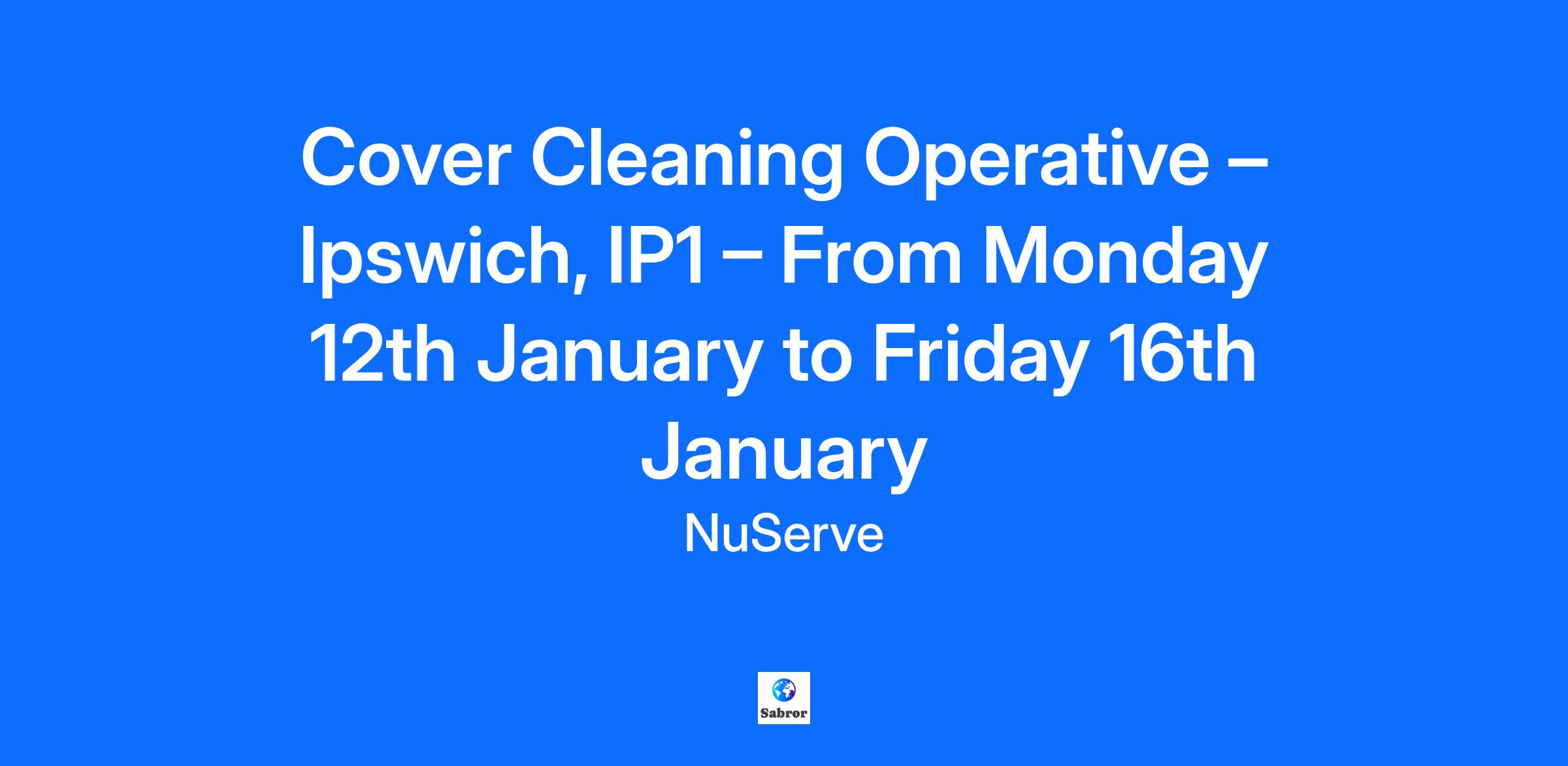 Cover Cleaning Operative – Ipswich, IP1 – From Monday 12th January to Friday 16th January Join a B Corp Company on a Mission to Transform Facilities Management Salary: £12.64 per hour Dates: Monday 12th January to Friday 16th January Location: Ipswich, IP1 Time: 2 hours in the morning and 4 hours in the evening (Can be flexible with times) Contract: Fixed Term The Opportunity Do you take pride in keeping spaces spotless and welcoming? We’re looking for a dedicated and reliable Cleaning Operative to join our team and help us deliver outstanding service every single day. If you’re someone who values attention to detail and enjoys making a real difference in your work, we want to hear from you! Key Duties As part of our friendly and supportive team, you’ll play a key role in keeping our site clean, safe, and comfortable for everyone. Your day-to-day duties will include: • Sweeping, mopping, and vacuuming floors to keep them gleaming • Dusting surfaces, furniture, and fixtures to maintain a tidy environment • Emptying bins and replacing liners to ensure clean, pleasant spaces • Cleaning and sanitising restrooms (including toilets, sinks, mirrors, and floors) • Restocking bathroom supplies such as toilet paper, soap, and paper towels • Ordering and maintaining cleaning supplies for the site Communication • Take direction from your supervisor and complete tasks efficiently • Communicate clearly and professionally with clients and team members • Refer any queries or issues to your supervisor promptly Compliance & Safety Your safety — and that of others — comes first. You’ll follow all health and safety procedures, including safe use of cleaning products, wearing appropriate protective equipment, preventing slips and trips, and reporting hazards or accidents. You’ll also help ensure chemicals are stored securely. Who are you? This is a great opportunity for someone who enjoys working independently, takes pride in their work, and always strives for the highest standards. Essential: • A strong work ethic and commitment to excellent cleaning standards • A positive, can-do attitude and great attention to detail • Good communication skills and the ability to stay organised • The ability to stay calm and focused under pressure • Flexibility to adapt to changing tasks or schedules Desirable: • Previous cleaning experience (but don’t worry — full training will be provided!) Who are we We're not your typical cleaning and facilities company. As a certified B Corp, NuServe is committed to doing business differently – putting people, planet, and purpose at the heart of everything we do. With revenues approaching £15m and ambitious plans to reach £30m by 2030, we're on an exciting growth journey to become the most loved brand in facilities management. Our reputation is built on four pillars: professionalism, care, sustainability, and innovation. If you're looking for a role where your work truly matters and you can grow with an organization that's going places, keep reading. What You'll Love About Working Here Purpose-Driven: As a B Corp, we're committed to making a positive impact on society and the environment – your work contributes to something bigger. Great Benefits: • Salary: £12.64 per hour • Opportunity to earn commission for new business referrals • 28 days leave including bank holidays • Pension scheme with employer contributions • Employee benefits portal with 24/7 GP access Supportive Culture: Join a friendly, collaborative team where people matter, ideas are valued, and everyone is working towards a common goal. NuServe is an equal opportunities employer. We celebrate diversity and are committed to creating an inclusive environment for all employees.