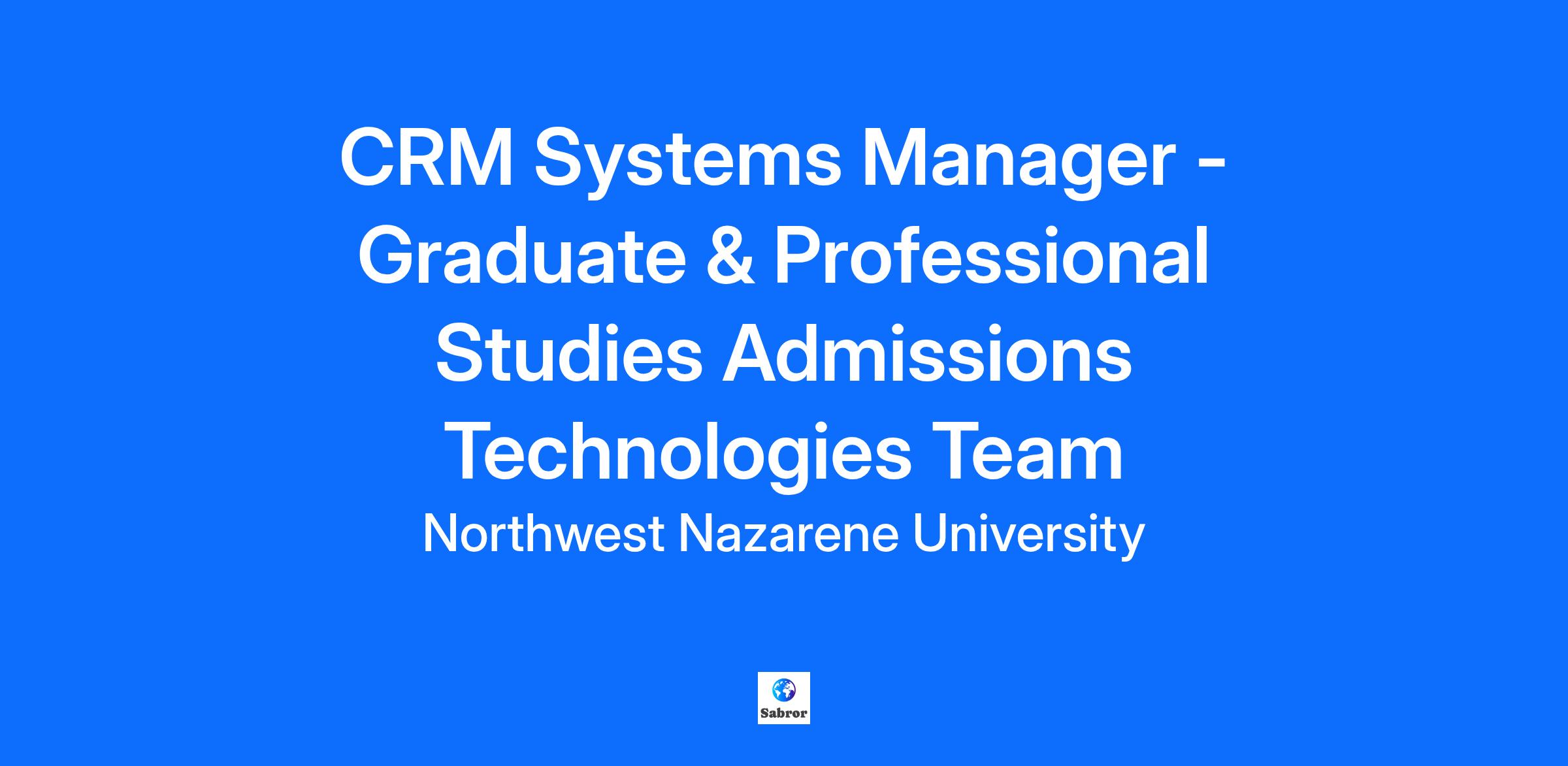 The CRM Systems Manager is a non-exempt, full-time position. The CRM Systems Manager is a member of the Admissions Technologies team that is responsible for the development, implementation, customization, management, and maintenance related to the Slate CRM platform to support the mission and enrollment initiatives of Northwest Nazarene University. The CRM Systems Manager (GPS) serves as a Slate Captain serving the Graduate & Professional Studies Admissions team. The CRM Systems Manager is a non-exempt, full-time position and reports to the Director of Admissions Technologies.
