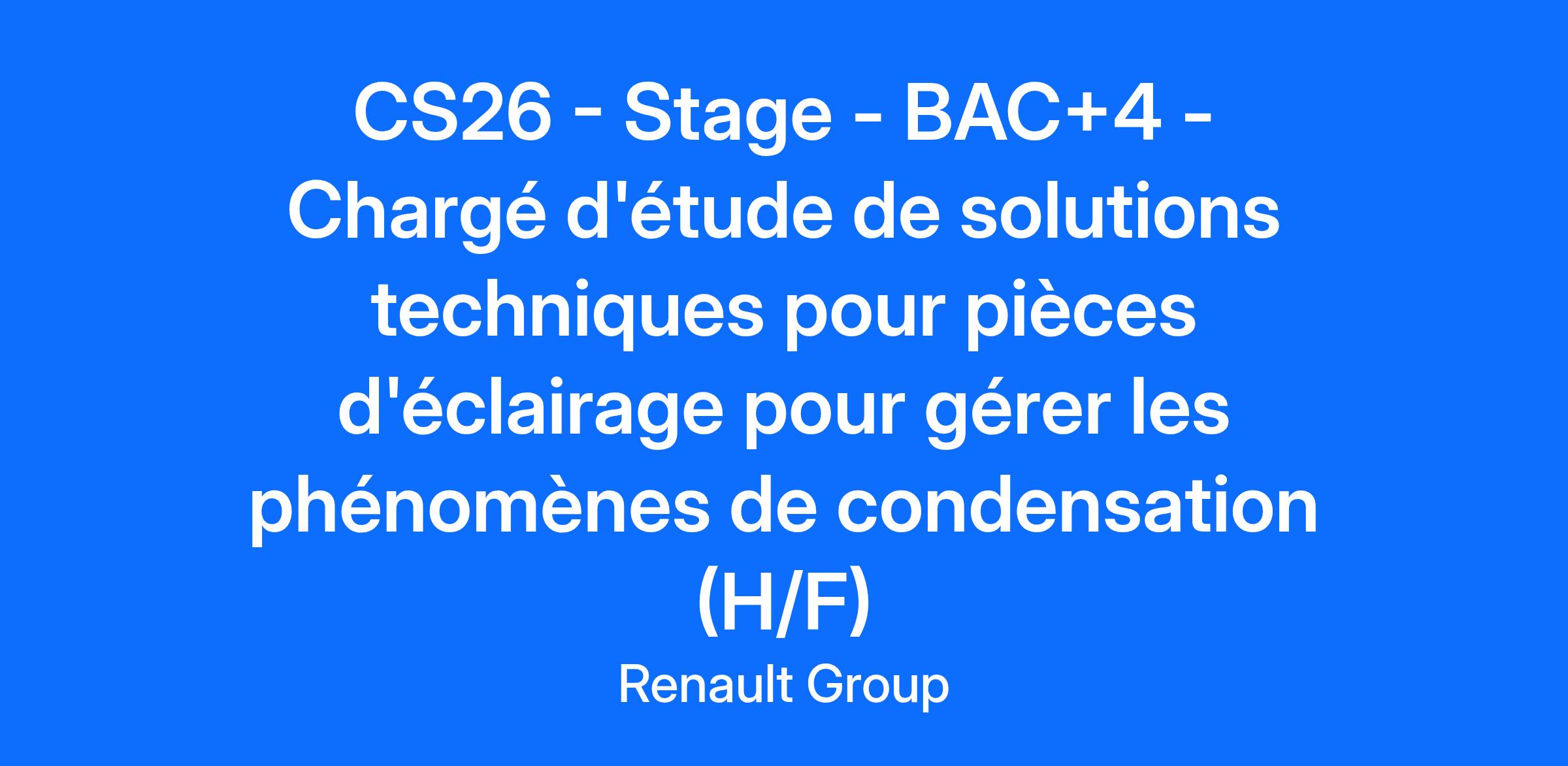 Company RENAULT s.a.s. Job Description Contexte et environnement de travail : L’éclairage automobile est un secteur dynamique et en pleine expansion au cœur de l’industrie automobile. Porté par de fortes innovations, il intègre des technologies de pointe telles que les LED, le pixel lighting ou encore les systèmes adaptatifs. Ces avancées influencent directement le design des véhicules, renforçant leur identité visuelle et leur attractivité. Rejoindre ce domaine, c’est participer à des projets passionnants mêlant ingénierie, design et performance. Le stagiaire évoluera au sein du service éclairage qui a en charge le cadrage, le développement et l'industrialisation des pièces d'éclairage pour les véhicules du Groupe Renault. Détails des missions confiées au stagiaire : Benchmark et étude de solutions techniques existantes à l'intérieur des pièces d'éclairage Analyse des méthodes d'essai existantes (interne Renault et fournisseur) Réalisation d'essais sur pièces d'éclairage et interprétation des résultats Recherches de principes de conception pour limiter la condensation Résultats attendus : Comparaison des méthodes d'essai et orientation vers un choix d'une méthode Evaluation de différentes solutions techniques pour lutter contre la condensation et préconisation d'une solution optimisée en fonction des cas d'usages Enrichissement d'une base de données des résultats d'essai Mise à jour des exigences vis-à-vis de la condensation et actualisation du cahier des charges. Qui êtes-vous ? Vous êtes en deuxième année de cycle ingénieur, avec une spécialisation en thermique ou thermodynamique, Vous avez un intérêt marqué pour les problématiques techniques liées à l’éclairage automobile et à la gestion des phénomènes physiques comme la condensation. Autonome,rigoureux.se et doté.e d’un bon sens de l’analyse Vous aimez travailler en équipe et savez faire preuve d’un bon relationnel Vous êtes force de proposition et motivé.e par l’idée de contribuer à des projets concrets, en lien avec des technologies de pointe et des enjeux industriels. Maîtrise de l’anglais requise Vous souhaitez participer à l’aventure de l’automobile de demain ? Rejoignez-nous ! Job Family Human Resources Contract Duration 3 months Renault Group is committed to creating an inclusive working environment and the conditions for each of us to bring their passion, perform to the full and grow, whilst being themselves. We find strength in our diversity and we are engaged to ensure equal employment opportunities regardless of race, colour, ancestry, religion, gender, national origin, sexual orientation, age, citizenship, marital status, disability, gender identity, etc. If you have a disability or special need requiring layout of the workstation or work schedule, please let us know by completing this form. In order to follow in real time the evolution of your applications and to stay in touch with us, we invite you to create a candidate account. This will take you no more than a minute and will also make it easier for you to apply in the future. By submitting your CV or application, you authorise Renault Group to use and store information about you for the purposes of following up your application or future employment. This information will only be used by Renault Group companies as described in the Group privacy policy. As a visionary, innovative company, Renault Group has been at the forefront of mobility since 1899. Today, the Group is transforming its business model to become a next-generation, high-tech, low-carbon automotive company, working with its four brands: Renault, Dacia, Alpine and Mobilize, and specialist entities to shape the future of mobility. All energies can play a role in decarbonisation. Consequently, we are developing smart, safe and affordable electric vehicles, while also continuing to innovate in the development of more efficient, low-carbon ICE and hybrid vehicles. In addition, the company is turning to other alternative energy sources, notably dual-energy electric motors. Mobility habits are changing. For this reason, we are investing in smart, electric mobility solutions with the emphasis on use, backed up by a complete ecosystem of services. Owing to the increasing scarcity of natural resources, we are deploying circular economy solutions to recycle materials. Do you want to be part of creating the future of mobility? Join us now! https://www.renaultgroup.com/en/group/