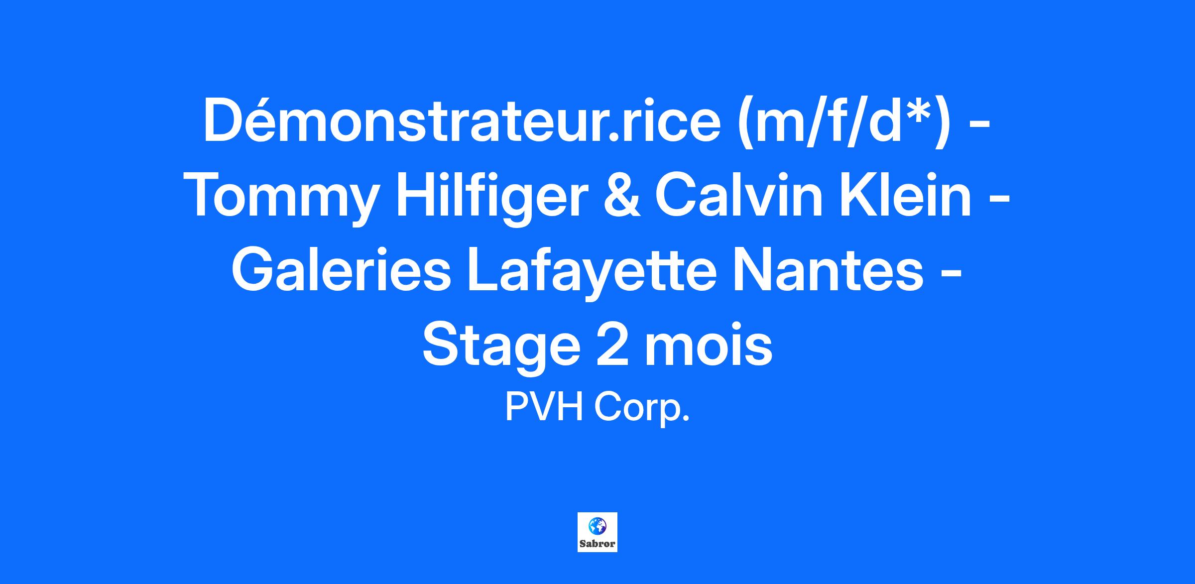 Design Your Future at PVH Démonstrateur.rice (m/f/d*) - Tommy Hilfiger & Calvin Klein - Galeries Lafayette Nantes - Stage 2 mois Présentation de l’entreprise Créée en 1881, PVH est l'une des plus importantes entreprises textiles au monde, regroupant plusieurs marques de mode iconiques et lifestyle. Parmi elles figurent Calvin Klein, acquise en 2003, et Tommy Hilfiger en 2010. Description du poste Es-tu prêt.e à faire passer ta carrière au niveau supérieur et à rejoindre un parcours extraordinaire au sein de PVH ? Alors conçois ton avenir avec nous ! Rejoins nos équipes Tommy Hilfiger et Calvin Klein des Galeries Lafayette de Nantes, en tant que démonstrateur.rice (m/f/d) en stage pour 2 mois maximum à pourvoir entre décembre et janvier. Voici les responsabilités qui te seront confiées afin d’atteindre nos objectifs communs : Fais vivre une expérience client unique et personnalisée Laisse parler ton tempérament commercial Sois le/la garant.e de la bonne tenue du point de vente : respect des guidelines visuel merchandising, réception et traitement des livraisons, gestion rigoureuse des stocks, encaissement… Transmets ta passion pour la mode et le produit Exprime ta créativité, sois curieux.se et THINK BIG ! Profil recherché Tu as idéalement une première expérience dans le secteur de la mode, du retail ou du commerce. Chez PVH nous sommes ouverts aux profils provenant de différents horizons ! Ton niveau d’anglais te permet de répondre aux attentes de notre clientèle internationale. Postule dès maintenant, raconte-nous ton histoire et rejoins-nous ! Quelle est la prochaine étape ? Nos équipes examineront ta candidature, et t’appelleront si ton profil est compatible ! Puis, tu auras l'opportunité de nous rencontrer lors d'un entretien. Nous sommes impatients.es de découvrir les prochains talents de PVH ! Chez PVH, nous encourageons la diversité et le respect de l'individualité et nous sommes fiers de travailler avec des personnes talentueuses venant d'horizons différents. Dans un esprit d'inclusion, les candidats-es seront considérés-ées sans égard à leur âge, leur appartenance ethnique, leur sexe, leur expression de genre, leur identité de genre, leur nationalité, leur religion ou leur orientation sexuelle. Toutes nos offres d'emploi sont ouvertes aux personnes en situation de handicap. We are brand builders who focus our passion and creativity to build Calvin Klein and Tommy Hilfiger into the most desirable lifestyle brands in the world and at the same time position PVH as one of the best-performing brand groups in our sector.