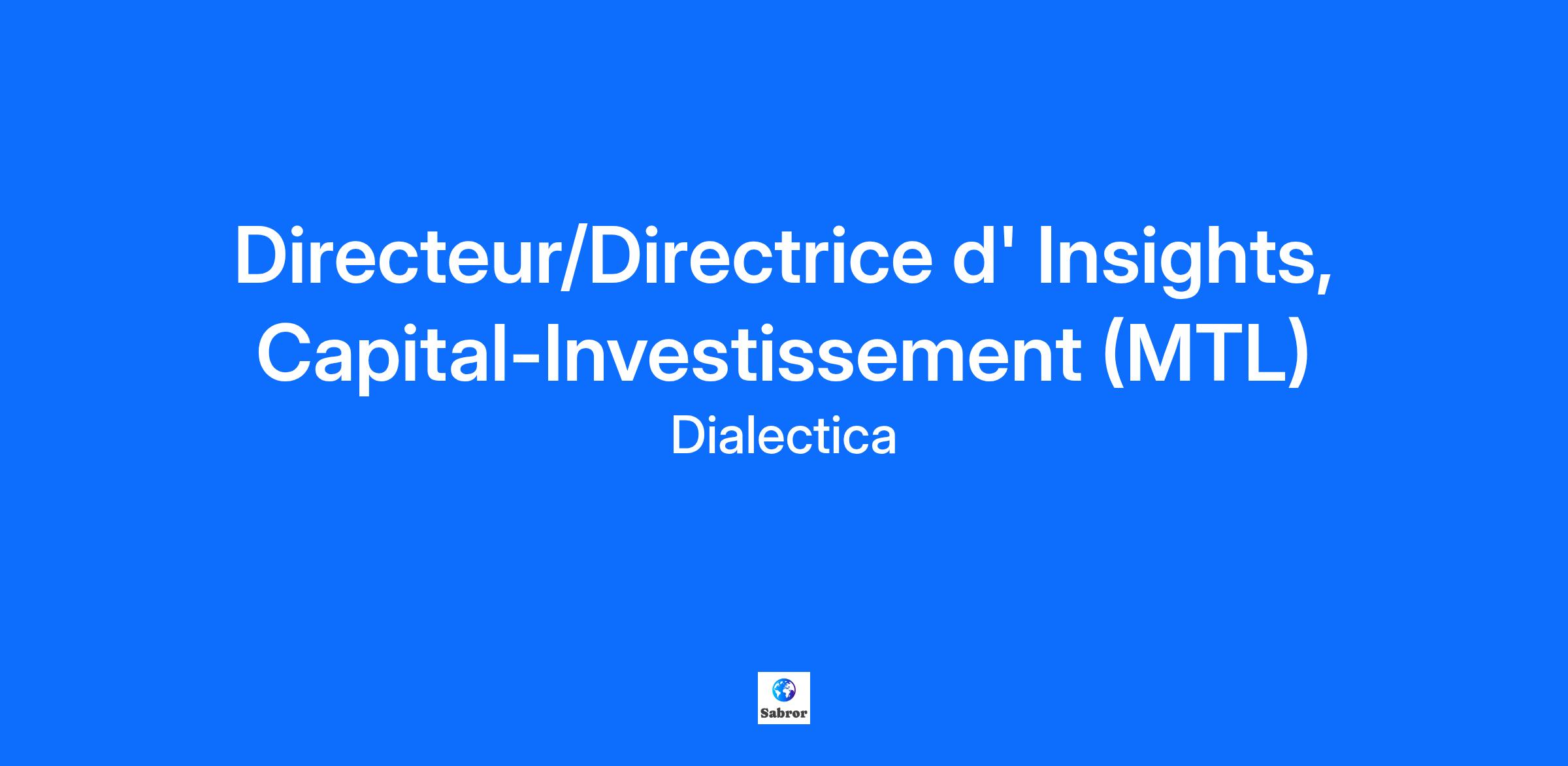 À propos de Dialectica Dialectica est une firme de services d'information B2B de premier plan qui accompagne les plus grands cabinets de conseil, les fonds d'investissement et les grandes entreprises, en leur permettant de recueillir des informations et des perspectives en temps réel auprès d'experts de l'industrie dans divers marchés, secteurs et régions. Dialectica a été reconnue comme l'une des entreprises à la croissance la plus rapide d'Europe par le Financial Times pendant 5 années consécutives, comme l'un des meilleurs employeurs pour les jeunes diplômés par le Career Directory au Canada et comme un Meilleurs Lieux de Travail. Nous croyons qu'il faut soutenir nos employés pour qu'ils donnent le meilleur d'eux-mêmes et qu'ils se développent, et la création d'un milieu de travail dynamique, valorisant et respectueux est au cœur de notre raison d'être : Accélérer la transition vers une société prospère en favorisant une meilleure prise de décision. Pour plus d'informations, visitez dialecticanet.com Ce que vous ferez Au sein de l’équipe de capital-investissement, Insights est un nouveau produit, en forte croissance, qui permet aux entreprises une meilleure prise de décisions stratégiques. Votre rôle sera d’accompagner et d'accélérer cette croissance. Vos principales responsabilités comprendront: Création de Contenu Proactif Développer du contenu proactif sur des sujets d'intérêt pour les clients de capital-investissement dans votre zone de couverture Mener des séances exploratoires pour discuter du contenu proactif avec les clients et générer des opportunités clients Prospection et Ventes Techniques Définir les besoins des clients et générer des opportunités clients / mandats de projets à travers l'ensemble de l'offre de Dialectica pour le Capital Investissement (Appels avec des Experts, Voix du Client, Cartographie des Fusions et Acquisitions, Deal Advisors, Origin, etc.). Livraison de Produits et Gestion de la Relation Client Gérer directement la livraison et l'assurance qualité de l'équipe de produits Insights (par exemple, Voix du Client, cartographie des Fusions et Acquisitions, etc.). Travailler avec d'autres équipes de produits pour assurer l'assurance qualité et l'excellence de la livraison à travers l'ensemble de l'offre de Dialectica. Jouer un rôle de premier plan dans le développement de la relation avec les clients à travers les projets et tirer parti des occasions d'élargir la base d'utilisateurs par le biais de recommandations. Innovation de Produits Créer des opportunités pour améliorer l'offre de produits Insights de Dialectica pour les clients de capital-investissement en testant et en co-créant de nouveaux modules Insights avec les clients. Gestion de Comptes Entretenir les relations avec les cadres supérieurs et avec les responsables du budget afin de maintenir ou accroître la part de portefeuille Dialectica dans votre zone de couverture. Gérer les renouvellements annuels et les processus de vente d'engagements forfaitaires. Ce que nous recherchons 11 ans ou plus d'expérience dans le domaine des services professionnels/du conseil ou une expérience équivalente ; l'expérience des transactions est fortement appréciée Des compétences interpersonnelles et de communication exceptionnelles, avec la capacité d'influencer et d'engager les parties prenantes à tous les niveaux Un sens aigu des affaires et une réflexion stratégique, avec la capacité d'identifier les opportunités de croissance du chiffre d'affaires et d'expansion du marché Expérience avérée du leadership, avec la capacité d'inspirer et de motiver les collègues pour atteindre des objectifs ambitieux Esprit orienté vers les résultats, avec un accent sur la fourniture d'une valeur exceptionnelle aux clients et la stimulation de la croissance de l'entreprise. Ce que vous obtiendrez Faire partie d'une équipe créative, entrepreneuriale et dynamique Soutien et assistance de certains des collègues les plus motivants. Possibilités de développer de nouvelles compétences et de faire progresser votre carrière au sein d'une organisation mondiale Programmes d'apprentissage et de perfectionnement Rémunération concurrentielle REER avec cotisation de l'employeur Couverture de santé complète (vie, soins médicaux, dentaires, de la vue et programmes d'aide aux employés) Programme de bien-être important (allocation, journées flexibles et de bénévolat) Une culture diversifiée et inclusive soutenue par un certain nombre d'initiatives La liberté et la flexibilité de gérer votre rôle de la manière qui vous convient L'entreprise recrute des experts du monde entier dans tous les secteurs pour ses clients situés principalement à l'extérieur du Québec, avec le soutien des autres bureaux de l'entreprise situés à l'extérieur du Québec avec lesquels les interactions sont constantes. Par conséquent, la connaissance de l'anglais est requise pour ce poste. La connaissance du français est requise pour les postes situés de façon permanente au Québec afin que les titulaires puissent communiquer avec leurs collègues et fournisseurs au Québec, au besoin. Une formation en français sera offerte à tous les titulaires de postes permanents au Québec qui n'ont pas une bonne connaissance du français. Dialectica souscrit au principe de l'égalité d'accès à l'emploi. Dialectica ne fait aucune discrimination fondée sur la race, la religion, l'identité de genre, l'orientation sexuelle, l'âge, un handicap physique ou mental non disqualifiant, l'origine nationale, le statut d'ancien combattant ou tout autre motif visé par la loi applicable. Vous n'êtes pas sûr d'avoir toutes les qualifications? Postulez quand même! Chez Dialectica, nous nous efforçons de créer un milieu de travail inclusif et nous accueillons les candidats ayant des expériences et des antécédents différents.