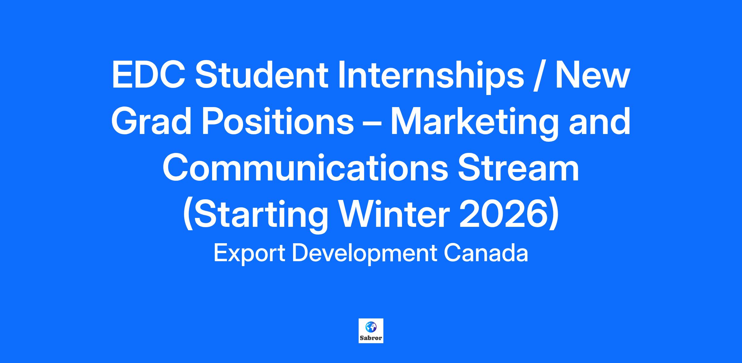EDC Student Internships / New Grad Positions - Marketing and Communications Stream This Candidate Pool is specifically for roles on various teams looking for students and new grads with Marketing and Communications skills and career interests. If you are looking for another general area of interest, please see our other campus roles on our website! About EDC: At Export Development Canada (EDC), we empower Canadian businesses to succeed globally. As a Financial Crown corporation, we offer innovative financial solutions and expert insights to help businesses explore new markets, mitigate risks, and achieve growth. Why Join EDC? Collaborate with a diverse, experienced team Thrive in a supportive, teamwork-driven environment. Impact global communities through sustainable growth in emerging markets. Recognized as one of Canada’s Top 100 Employers, Best Diversity Employers, and a Top 100 Family-Friendly Employers. Enjoy a comprehensive Total Rewards package, including benefits, vacation, wellness programs, and professional development opportunities. Student and New Grad Opportunities Our student and new grad opportunities include internships and co-op programs, all designed to give your career a strong start. Winter work terms begin at four months in length and may be extended for an additional four months or more, depending on business needs. While most roles are full-time, there is flexibility for part-time work. Our program is ideal for early career professionals who are new grads that have completed their courses within the past year, as well as students in their current program of study. Work terms in our program can be counted towards an accredited co-op program with your university or college. We are actively recruiting early career professionals for the 2026 Winter Semester in various teams looking for Marketing and Communications students or new grads. Team assignments will vary, and detailed descriptions will be provided if selected for an interview. Apply to this pool if you are a student or new grad who is: In or recently graduated from a Marketing or Communications specific program In a related program with an interest in Marketing and Communication roles Interested in learning a variety of skills on teams including Brand, Internal Relations, Communications, Marketing Strategy, Marketing Technology, etc. Our Ideal Student or New Grad: Currently enrolled or recently graduated from an undergraduate or graduate program (eligible for up to one year after completion of studies). Available for 8 months or more - While roles will be available for 4-month terms, preference will be given to candidates with availability that extends. Previous work term experience related to their field of study Strong verbal and written communication skills Motivated self-starter, good organizational and analytical skills Ability to work independently and within a team Enthusiasm to tackle any task, whether menial or complex Knowledge of both official languages is an asset and may be required for certain positions What can you expect from an EDC work term? The opportunity to build cross-functional professional networks, identify and pursue opportunities for improvement and innovation, and continuously learn and grow through coaching and mentoring from professionals throughout EDC. Work in a high-performing, fast-paced and flexible environment facilitated by technologies and report to any of our EDC Hubs across Canada. What to expect from us? You will be notified when we have received your application. If your profile matches a team's needs, we will reach out to schedule an interview with the team, you will receive a description of the team you are selected for in preparation for your interview. We will be contacting candidates on a rolling basis from October to December 2025 for interviews, dependent on business needs. #LI-Hybrid Eligibility: Applicants must be Canadian citizens, permanent residents, or hold a valid work visa at the time of application. Applicants must meet government security screening requirements. Applicants must be currently enrolled in post-secondary studies or have completed their studies within the past year. Compensation Details: Student, New Grad & Master’s salaries range from $42,900 to $56,550 annually, based on year of study. Please see the salary breakdown by year of study below: 1st Year: $42,900 ($22.00/hour) 2nd Year: $44,850 ($23.00/hour) 3rd Year: $46,800 ($24.00/hour) 4th Year and Beyond: $48,750 ($25.00/hour) New Graduate (Undergraduate): $54,600 ($28.00/hour) Master’s/PhD: $56,550 ($29.00/hour) Location: Export Development Canada operates in a hybrid work environment, currently requiring employees to work in the office 2 days per week. (subject to change) Opportunities may be performed from EDC’s headquarters in Ottawa or from one of our Community Hubs located in Toronto, Mississauga, Montreal, Brossard, Laval, Calgary, Edmonton, Halifax, or Vancouver. EDC's Commitment to Employment Equity: Export Development Canada (EDC) is dedicated to fostering employment equity and building a diverse workforce. We actively encourage applications from women, Indigenous peoples, visible minorities, persons with disabilities, and members of the 2SLGBTQI+ community. Should you require any accommodation during the recruitment and selection process, please let our Recruitment team know. Candidates must apply directly online to be considered for this role. We thank all applicants for their interest in a career at EDC; however, only those candidates who are selected for an interview will be contacted. Please note that we will be contacting candidates on a rolling basis from October to December 2025 for interviews depending on business needs. Should you require any accommodation during the recruitment and selection process, please contact the Recruitment team at accessibility@edc.ca