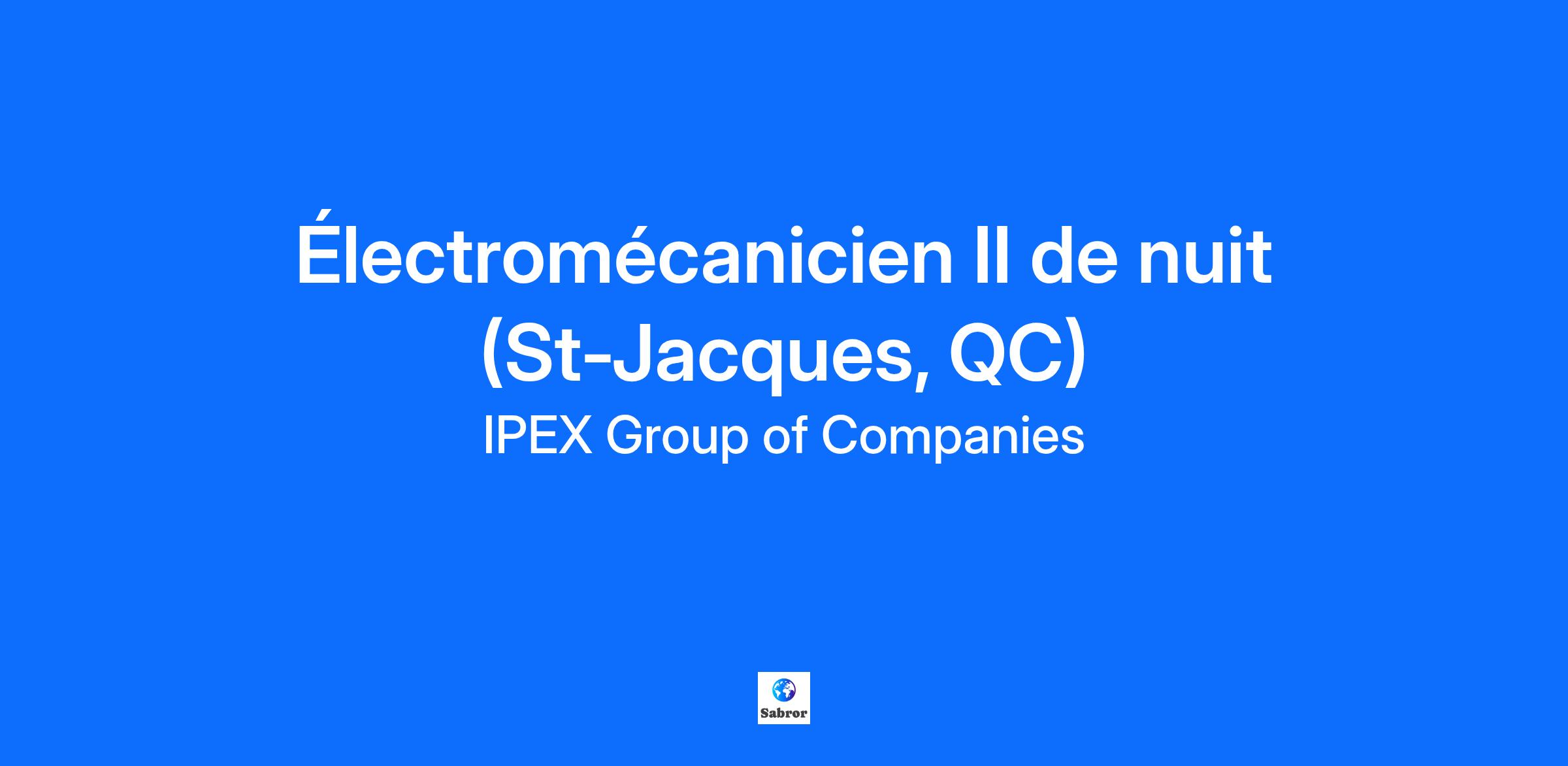 Job Posting IPEX est l’un des principaux fournisseurs de systèmes intégrés de tuyauteries thermoplastiques en Amérique du Nord. Nous avons pour mission de bâtir un avenir meilleur en connectant les gens avec l’eau et l’énergie. Nous avons présentement une opportunité en tant qu'Électromécanicien II de nuit. Ce rôle est basé à notre usine de Saint-Jacques et relève du Superviseur de maintenance. Ne manquez pas l’opportunité de joindre une grande famille de professionnels centrée sur les gens, leaders à l’esprit agile, entrepreneurs dans l’âme qui aiment défier le statu quo. Description du poste L’électromécanicien est responsable d’assurer le bon fonctionnement mécanique et électrique des presses à injection et des équipements auxiliaires. Activités principales Effectuer des réparation mécaniques, hydrauliques, électriques, électroniques et de contrôle; Effectuer l’inspection et l’entretien préventifs des différents équipements; Effectuer des diagnostiques et proposer des solutions; Effectuer des modifications d’équipement en fonction des besoin propres à Ipex. Effectuer la lecture de plans électriques, mécaniques, hydrauliques et pneumatiques. Effectuer des dessins techniques; Effectuer les montages et ajustements d’équipement spécifiques à Ipex; Effectuer des travaux de soudure à plat et vertical; Effectuer des travaux d’usinage conventionnel; Participer à la conception de projets d’améliorations; Effectuer toutes autres tâches connexes à la demande du supérieur immédiat. Connaissances et compétences nécessaires Diplôme d’études professionnelles en électromécanique de systèmes automatisés; Certificat restreint en connexion d’appareillage ou certificat en électricité; 3 à 5 ans d’expérience à titre d’électromécanicien dans le domaine manufacturier; Maîtrise de la langue anglaise à un niveau intermédiaire; Maîtrise de la langue française à l’oral et à l’écrit. Disponible à travailler sur un quart de travail de 12h de nuit IPEX fait tout son possible pour répondre aux besoins d’accommodement des personnes handicapées durant tout le processus d’entrevue et, sur demande, collaborera avec les candidats qualifiés pour leur offrir des mesures d’accommodement convenables de façon à prendre en compte leurs besoins en matière d’accessibilité découlant de leur handicap. Les candidats participant à toutes les étapes du processus de sélection en vue d’un emploi à IPEX peuvent demander des mesures d’accommodement. Pour faire une demande, veuillez communiquer avec les RH à HR@ipexna.com #IPXCA