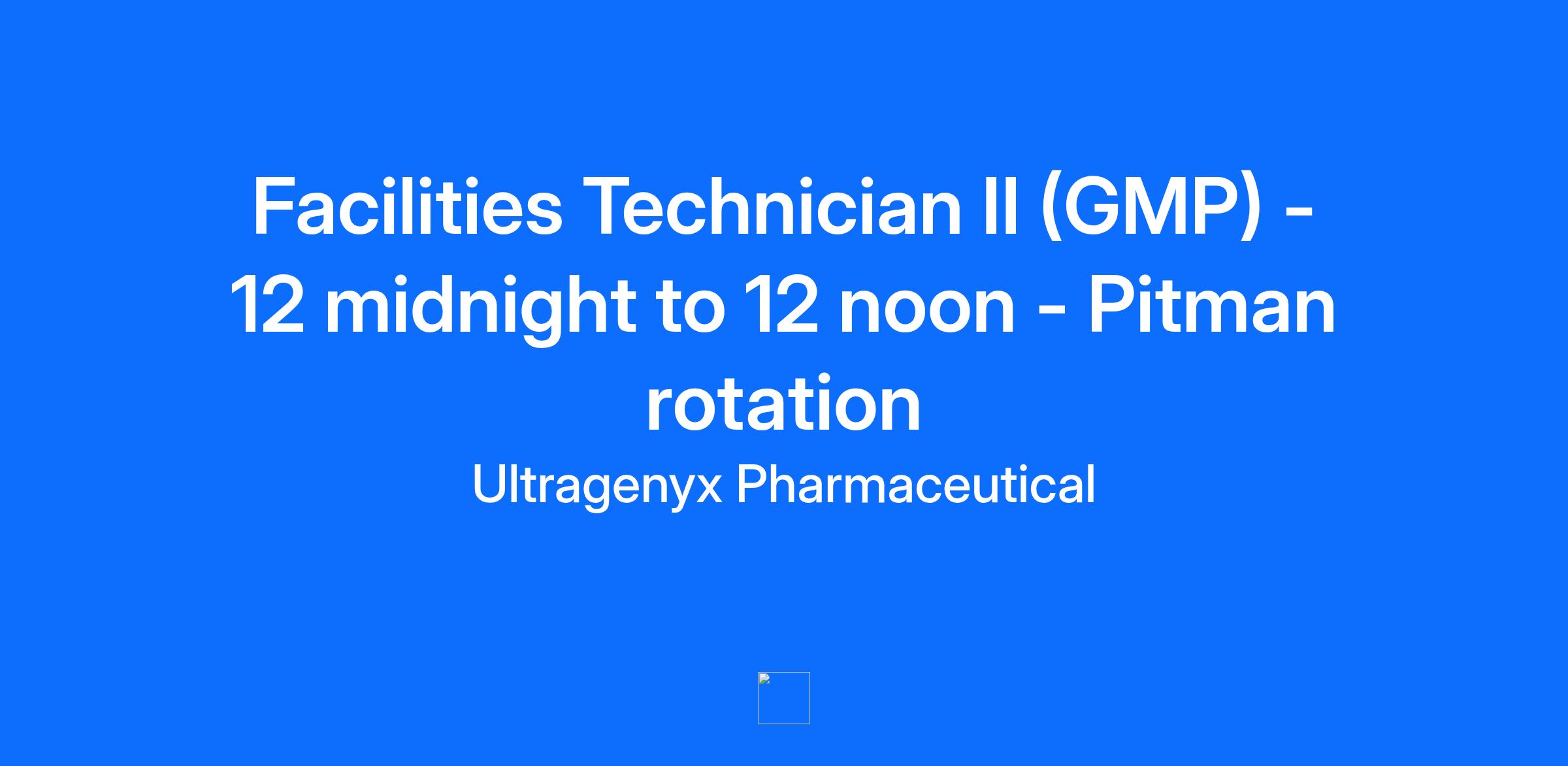 Why Join Us? Be a hero for our rare disease patients At Ultragenyx, we fundamentally believe that taking real impactful action to care for the needs of patients and our people is always the right thing to do. To achieve this goal, our vision is to lead the future of rare disease medicine. For us, this means going where other biopharma companies won’t go – challenging the status quo and creating a new model that advances our field so more patients and caregivers can benefit from life-changing treatments. We do this by following the science, applying a novel rapid development approach, making innovative medicines at fair and reasonable prices, and creating a collaborative ecosystem to reach patients in ways that are most meaningful for them. Our commitment and care for patients extends to our people, so culture is an essential cornerstone for Ultragenyx. We remain continuously focused on creating a supportive and inclusive environment of profound learning and growth – so employees can thrive in all areas of their lives, in and outside of work. Ultimately, we want to be an organization where we would be proud for our family, friends and children to work. If you want to have a meaningful impact, do the best work of your career, and grow a lot, both professionally and personally, come join our team. POSITION SUMMARY: ultracurious – Apply your biggest ideas in courageous ways The GMP Facilities Tech II performs preventative and corrective maintenance on a variety of complex utility systems within Ultragenyx GMP QC laboratory and manufacturing facilities. Equipment/systems include but is not limited to HVAC systems, cold storage, compressed air and gas systems, Reverse Osmosis (RO) and Water for Injection (WFI) systems, wastewater treatment, clean steam generation, fire detection/suppression, boilers, pumps/motors, etc. The Facilities Tech II will also perform corrective and preventive maintenance on GMP lab instruments and process equipment such as bioreactors, filling machines, centrifuges, rockers, chromatography columns, autoclaves, and glass washers. With minimal oversight, the Facilities Tech II must be able to interpret drawings, wiring diagrams, and equipment specifications to effectively perform troubleshooting and repair activities. WORK MODEL: Core Lab & Ops: This role typically requires that the majority of the work be conducted on-site and thus will be subject to certain on-site safety protocols. This is a 12 hour day shift based position from 12 midnight to 12 noon. RESPONSIBILITIES: 1. Perform and document all corrective and preventative maintenance activities performed on GMP facility equipment and/or systems in accordance with GDP requirements. 2. Ensure GMP compliance with all facilities related activities including corrective and preventative maintenance. 3. Troubleshoot complex electrical and controls issues on all building systems and equipment. 4. Maintain all facility equipment and systems at optimum levels of performance, efficiency, and reliability. 5. Ensure that all facilities and maintenance activities are performed in accordance with current internal and external requirements for safety, quality, regulatory environmental, and compliance standards. 6. Execute continuous improvement projects to improve departmental performance. 7. Collaboratively work to resolve issues and improve equipment performance. 8. Always demonstrate good safety practices, including appropriate use of protective equipment. Reports and takes initiative to correct safety & environmental hazards. 9. Respond to emergency service calls and resolve identified issues in a timely manner and in accordance with all safety, quality and compliance requirements. 10. Perform weekend walkthrough duties according to schedule. 11. Participate in an On-Call rotation for off hour facility emergencies. 12. Ensure that all required quality and safety training is completed on time and current. REQUIREMENTS: Minimum of a High School Diploma, preferably a college degree, or equivalent combination of education and direct work experience 1. 3+ years of experience working in a GMP or regulated environment required. 2. Experience working for a maintenance organization in a GMP Biotech/Pharmaceutical manufacturing environment is preferred. 3. Experience with Building Management Systems (BMS) and Computerized Maintenance Monitoring System (CMMS) software is preferred. 4. Licensure in any of the following areas is preferred: Wastewater Treatment, Refrigeration/Air Conditioning, Electrician, or Plumbing. 5. Must demonstrate ability to work independently, make effective decisions, resolve technical issues, and manage time effectively. 6. Must demonstrate effective verbal and written communication and be able to effectively interact with all levels of the organization across all departments. 7. Must demonstrate the ability to work effectively in teams to achieve results. 8. Basic proficiency with Microsoft Office Products such as Word and Excel or equivalent software applications is required. PHYSICAL DEMAND REQUIREMENTS: · Stand for extended periods of time with periodic stooping / bending / kneeling. · Ability to climb ladders and stairs of various heights. · Able to lift, push, pull up to 50lbs. · Work in a controlled environment requiring GxP gowning and wear protective clothing over the head, face, hands, feet, and body. This requires the ability to change clothes into appropriate gowning and personal protective equipment. · Certain tasks may require use of a respirator; medical clearance will be required in advance. · Must remove all make-up, jewelry, and contract lenses while in the manufacturing environment. · Working in temperature-controlled environments (cold rooms). #LI-CT1 #LI-Onsite The typical annual salary range for this full-time position is listed below. This range reflects the characteristics of the job, such as required skills and qualifications and is based on the office location noted in th