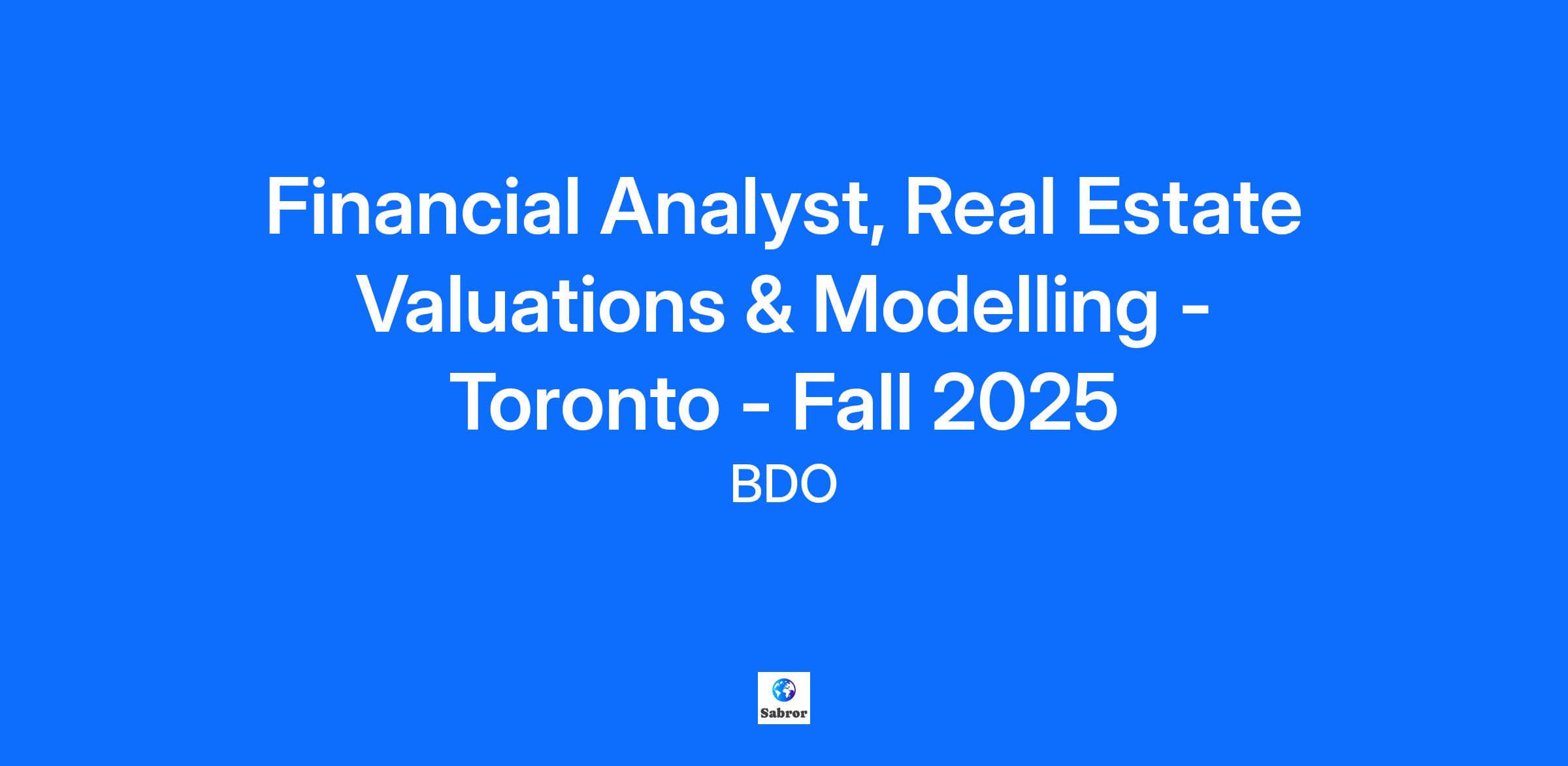 Putting people first, every day BDO is a firm built on a foundation of positive relationships with our people and our clients. Each day, our professionals provide exceptional service, helping clients with advice and insight they can trust. In turn, we offer an award-winning environment that fosters a people-first culture with a high priority on your personal and professional growth. Your Opportunity We are seeking an individual to join our Real Estate Valuations & Modelling team as a Financial Analyst in Toronto. We are looking for driven candidates with a foundational understanding of valuation concepts and a strong willingness to learn. This role provides an excellent opportunity to develop technical expertise and gain hands-on experience in delivering high-quality valuation services. The successful candidate will support valuation engagements, contribute to client deliverables, and work closely with the team to build their knowledge and skill set in the following areas: Key Accountabilities and Responsibilities: As a Financial Analyst, you will play an active role in supporting BDO Canada’s growing portfolio of valuation clients. Play an active role in carrying out real estate appraisal mandates, in particular: Work extensively with Excel to perform complex financial analysis. Develop proficiency with BDO’s real estate valuation workbooks, mapping, and research programs. Conduct market research and collect/collate relevant sales comparables. Carry out land use research, including mapping, usage, official plans, and zoning by-laws. Participate in site inspections as required (some travel may be necessary). Contribute to the preparation of appraisal reports, client presentations, and proposals. Liaise with market participants and clients for research and reporting purposes. Support business development activities by building relationships with current and prospective clients, as well as other BDO service groups. Perform additional valuation-related tasks as assigned (audit assist, market research reporting, etc). If interested, contribute to Business Valuations for tax planning, financial reporting, financial planning, and transaction advisory purposes. How do we define success for your role? You demonstrate BDO's core values through all aspects of your work: Integrity, Respect & Collaboration You understand your client’s industry, challenges, and opportunities; clients describe you as positive, professional, and delivering high quality work You identify, recommend, & are focused on effective service delivery to your clients You share in an inclusive & engaging work environment that develops, retains & attracts talent You actively participate in the adoption of digital tools and strategies to drive an innovative workplace You grow your expertise through learning & professional development. Your experience and education A bachelor's degree in accounting, finance, business, or another related field Willingness to work towards an AACI designation is an asset. 0-2 years of work experience in appraisal, asset management, investments, consulting, etc An understanding and ability to read financial statements, and other pertinent documents such as leases, sales agreements, and research reports. Proficiency in Microsoft Suite, especially Excel Strong analytical and problem-solving skills Excellent attention to detail Solid verbal and written communication skills Ability to prioritize and manage multiple tasks A valid Canadian G-level driver’s license with access to a car is considered an asset. Application instructions Please upload your resume, cover letter and unofficial transcripts in a single PDF file to be considered for this position. Why BDO? Our people-first approach to talent has earned us a spot among Canada’s Top 100 Employers for 2025. This recognition is a milestone we’re thrilled to add to our collection of awards for both experienced and student talent experiences. Our firm is committed to providing an environment where you can be successful in the following ways: We enable you to engage with how we change and evolve, being a key contributor to the success and growth of BDO in Canada. We help you become a better professional within our services, industries, and markets with extensive opportunities for learning and development. We support your achievement of personal goals outside of the office and making an impact on your community. Giving back adds up: Where company meets community. BDO is actively involved in our communities by supporting local charity initiatives. We support staff with local and national events where you will be given the opportunity to contribute to your community. Total rewards that matter: We pay for performance with competitive total cash compensation that recognizes and rewards your contribution. We provide flexible benefits from day one, and a market leading personal time off policy. We are committed to supporting your overall wellness beyond working hours and provide reimbursement for wellness initiatives that fit your lifestyle. Everyone counts: We believe every employee should have the opportunity to participate and succeed. Through leadership by our Diversity, Equity and Inclusion Leader, we are committed to a workplace culture of respect, inclusion, and diversity. We recognize and celebrate the valuable differences among each of us, including race, religious beliefs, physical or mental disabilities, age, place of origin, marital status, family status, gender or gender identity and sexual orientation. If you require accommodation to complete the application process, please contact us. Flexibility: All BDO personnel are expected to spend some of their time working in the office, at the client site, and virtually unless accommodations or alternative work arrangements are in place. Our model is a blended approach designed to support the flexible needs of our people, the firm and our clients. It’s about creating work experiences that meet ev