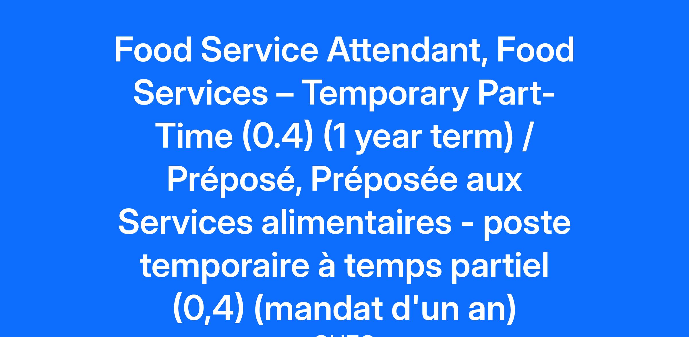 Compensation Pay Range: $23.97-$29.46 Job Description: Please Note: If you are a current CHEO employee with access to Workday, please apply to this posting via the Workday application as an internal applicant using the Jobs Hub. To successfully apply for this position, please submit your application by 11:59 pm the day before the advertised closing date in the posting to ensure your application is received. POSITION SUMMARY CHEO offers its patients hotel-style food services. Room service at CHEO is very much like the room service you would find at any hotel. The room service initiative has been well received by patients and their families and it has been a success story for the hospital. We are in the process of launching our patient ordering app in August. In our retail locations we offer our own Crafted at CHEO brand for our induction style concept in our Cafeteria. Our second floor shop offers Mr Sub, Pizza Pizza and we proudly brew Starbucks coffee. As part of our retail umbrella we operate the Treehouse Gift Shop which offers wide array of Plush, Lego and other brands for our patients, families and staff. As a Food Service Attendant at CHEO you be responsible for: Preparation and handling of food items in accordance to department regulations Preparation of formula feeds Patient tray set up and assembly Delivery and pick up trays to patient areas Preparation and set up of catering functions Cash and closing procedures Operation of dish machine Maintenance of safe and sanitary conditions in work areas Work in retail locations (Mr Sub, Pizza Pizza, Starbucks) Other duties as assigned QUALIFICATIONS Criminal Record Check (Essential) Grade 12 diploma (Essential) Demonstrated initiative, team work and flexible work schedule (Essential) Demonstrated skills in dealing with the public (Essential) Demonstrated excellent communication skills (Essential) Ability to work with minimal supervision (Essential) Minimum 6 months experience in food service operation (Essential) Physical strength sufficient to correspond to job requirements (Essential) Ability to prioritize (Essential) Bilingualism (English and French) (Preferred) Successful completion of Food Handler Certification (Preferred) This assignment may be extended or shortened based on operational needs. * Please note you will be represented by the Ontario Federation Healthcare Workers – Laborers International Union of North America, (OFHCW-LiUNA). Effective March 29, 2021, CHEO will conduct a more comprehensive pre-screening and evaluation process. This process may include more varied and multidimensional testing such as a written test, practical exam, or other assessment. All candidates who meet the essential and preferred qualifications may be tested. CHEO values diversity and is an equal opportunity employer. We are committed to providing an inclusive and barrier-free work environment, starting with the hiring process and welcome interest from all qualified applicants. Should you require accommodation during any phase in the recruitment process, please contact Human Resources at talentacquisition@cheo.on.ca. All information received in relation to accommodation will be kept confidential and will be handled in compliance with the Accessibility for Ontarians with Disabilities Act. Bilingualism (French/English) will be validated by a language proficiency assessment conducted by a third party provider. Candidates will be required to meet the minimum linguistic profile prior to the date of hire. CHEO is committed to providing a safe environment for staff, patients, and visitors. Consistent with that commitment, all applicants must be fully vaccinated against COVID-19 to be considered for any staff or volunteer opportunities. Applicants are also strongly encouraged to receive their COVID-19 booster shots when eligible to protect against the spread of COVID-19. Upon hiring, presentation of government issued documentation confirming full vaccination must be provided, or presentation of supporting documentation of a valid medical contraindication or other reasonable consideration pursuant to the Ontario Human Rights Code. We thank all those who apply, however, only those to be interviewed will be contacted. Veuillez noter : si vous êtes actuellement un employé du CHEO ayant accès à Workday, veuillez postuler à cette offre via l'application Workday en tant que candidat interne. Veuillez noter : pour postuler avec succès à ce poste, veuillez soumettre votre candidature avant 23 h 59 la veille de la date de clôture annoncée dans l'affichage pour vous assurer que votre candidature est reçue. RÉSUMÉ DES FONCTIONS Le CHEO offre à ses patients des services de restauration de style hôtelier. Dans nos commerces de détail, nous offrons notre propre marque Crafted par CHEO pour notre concept de style induction dans notre cafétéria. Notre café situé au deuxième étage propose des produits Mr Sub, Pizza Pizza et nous préparons fièrement du café Starbucks. Dans le cadre de nos commerces de vente au détail généralistes, nous exploitons le Treehouse Gift Shop qui offre un large éventail de produits de marques Plush, Lego et autres pour nos patients, nos familles et notre personnel. En tant que préposé(e) aux Services alimentaires au CHEO, vous serez responsable de ce qui suit : Préparer et manipuler les aliments conformément aux règlements du Ministère. Préparer les aliments pour nourrissons. Préparer les plateaux des patients et les disposer dans le bon ordre. Apporter les plateaux aux unités des patients, puis aller les rechercher. Préparer et installer les services de restauration. Suivre les processus de transaction et de fermeture de la caisse. Utiliser le lave‑vaisselle. Maintenir l’hygiène et la sécurité des aires de travail. Travailler dans des points de vente au détail (Mr Sub, Pizza Pizza, Starbucks) Accomplir d’autres tâches selon les besoins. QUALIFICATIONS Vérification du casier judiciaire (VCJ) (Es