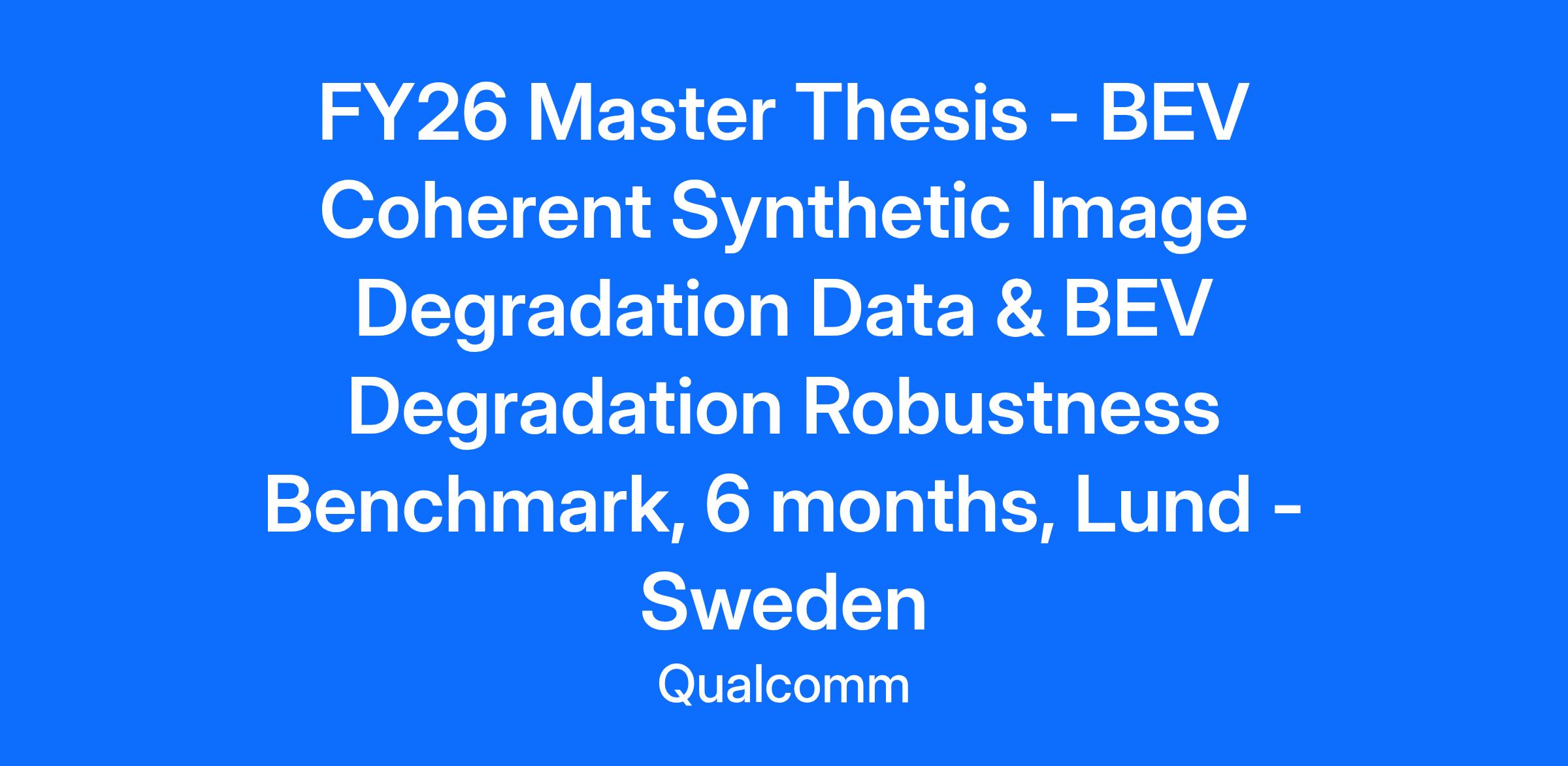 Company: Qualcomm Auto Ltd Sweden Filial Job Area: Interns Group, Interns Group > Interim Intern General Summary: Background: For autonomous driving, multiple cameras are needed to create a full view of the surround vehicle. In an autonomous driving system, it is critical to be robust to degradations. To overcome this challenge, one could teach the system to account for degradations by including data with degradations in training. The difficulty with this is to collect the data because the phenomena are rare, and large-scale collection is not feasible. However, creating realistic synthetic data is an alternative solution. Purpose: This thesis explores the creation of synthetic image degradation data, specifically focusing on windshield and lens artifacts such as blur, blockage, and other related artifacts, aiming to create realistic image degradation across all sensors. Potential methods could be to use Generative Adversarial Networks (GANs) or diffusion models to generate synthetic images. The study also aims to evaluate the robustness of BEV methods under the influence of image degradation, including the synthetically generated data. Student Background: Proficiency in programming languages such as Python. Courses in image processing, computer vision, and machine learning. Experience image processing libraries (e.g., TensorFlow, PyTorch, OpenCV). Experience with GANs (beneficial) *References to a particular number of years experience are for indicative purposes only. Applications from candidates with equivalent experience will be considered, provided that the candidate can demonstrate an ability to fulfill the principal duties of the role and possesses the required competencies. Applicants: Qualcomm is an equal opportunity employer. If you are an individual with a disability and need an accommodation during the application/hiring process, rest assured that Qualcomm is committed to providing an accessible process. You may e-mail disability-accomodations@qualcomm.com or call Qualcomm's toll-free number found here. Upon request, Qualcomm will provide reasonable accommodations to support individuals with disabilities to be able participate in the hiring process. Qualcomm is also committed to making our workplace accessible for individuals with disabilities. (Keep in mind that this email address is used to provide reasonable accommodations for individuals with disabilities. We will not respond here to requests for updates on applications or resume inquiries). Qualcomm expects its employees to abide by all applicable policies and procedures, including but not limited to security and other requirements regarding protection of Company confidential information and other confidential and/or proprietary information, to the extent those requirements are permissible under applicable law. To all Staffing and Recruiting Agencies: Our Careers Site is only for individuals seeking a job at Qualcomm. Staffing and recruiting agencies and individuals being represented by an agency are not authorized to use this site or to submit profiles, applications or resumes, and any such submissions will be considered unsolicited. Qualcomm does not accept unsolicited resumes or applications from agencies. Please do not forward resumes to our jobs alias, Qualcomm employees or any other company location. Qualcomm is not responsible for any fees related to unsolicited resumes/applications. If you would like more information about this role, please contact Qualcomm Careers.
