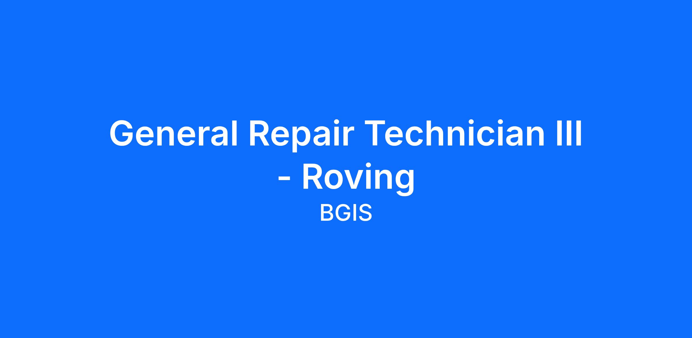 The General Repair Technician III - Roving is responsible for operating the facility including, but not limited to mechanical other supporting systems; performing structured inspections, preventative and corrective maintenance, routine and on-demand services on facility mechanical equipment and other systems. The Technician III, Stationary is also responsible for performing work in accordance with established processes and practices and for complying with internal and external requirements including but not limited to environmental, health and safety, fire protection.