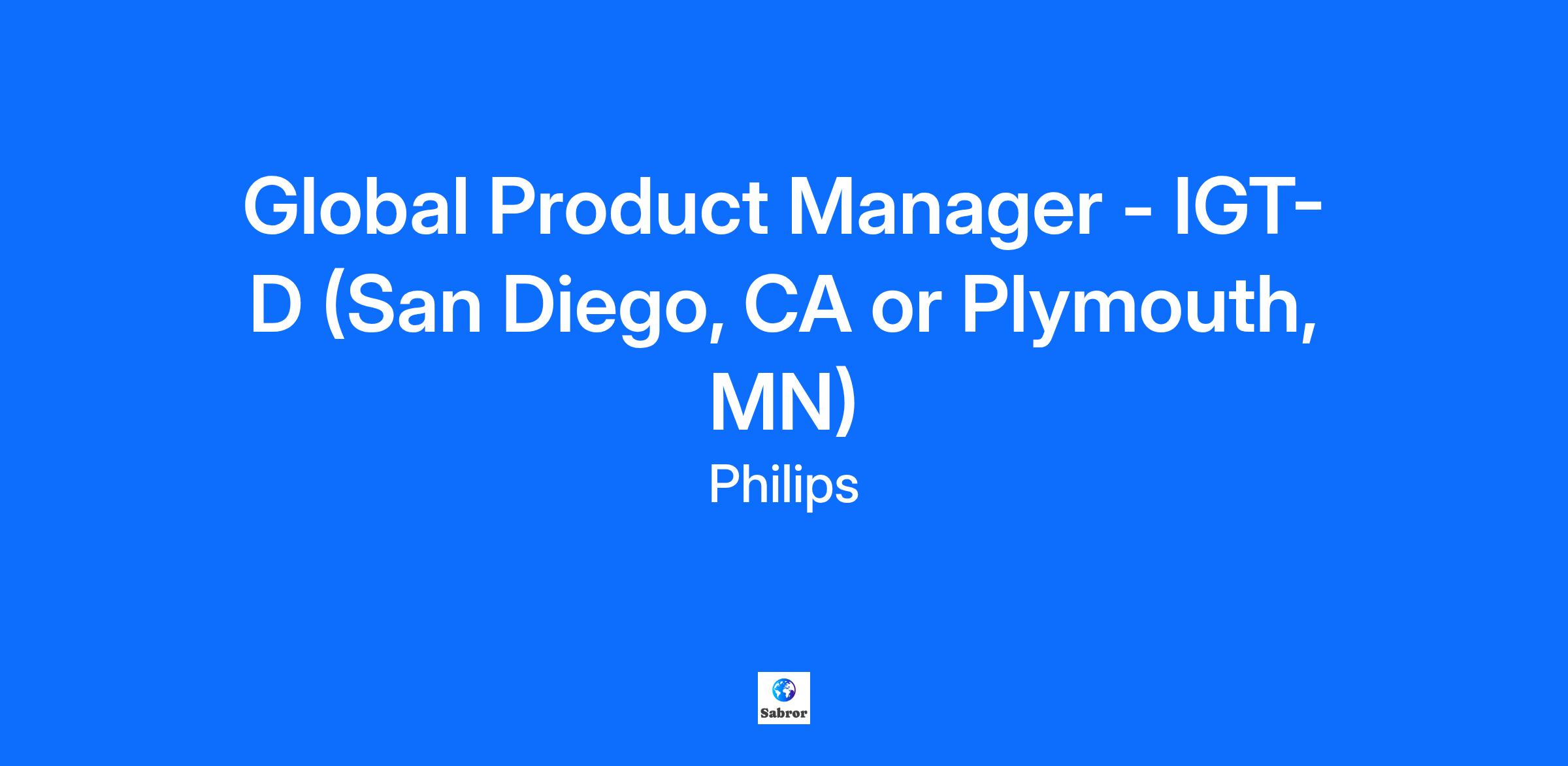 Job Title Global Product Manager - IGT-D (San Diego, CA or Plymouth, MN) Job Description Global Product Manager – IGT-D (San Diego, CA or Plymouth, MN) As a Global Product Manager, you’ll drive business performance and market success by shaping product strategy, leading lifecycle management, and enabling seamless global execution through cross-functional collaboration and process excellence. Your role: Support lifecycle and roadmap management by coordinating product planning, launch activities, and phase-in/phase-out processes to ensure alignment with portfolio and market strategies. Help establish and manage governance processes for road mapping, IBP, global launch planning, and VOX management to drive consistency, visibility, and cross-functional accountability. Collaborate with regional business leaders to gather market insights, communicate portfolio priorities, and align global and regional product strategies. Assist in developing and maintaining global communication strategies to ensure clear and consistent messaging across the organization and geographies. Partner with cross-functional teams to support business case creation, product performance reviews, and continuous improvement initiatives that enhance global product management maturity. You're the right fit if: You’ve acquired 5+ years of experience in product management, marketing, or related disciplines, ideally in a global or cross-functional environment. You have a Bachelor’s degree in engineering (or other technical discipline), marketing, business, or a related field. MBA preferred. You have strong skills in process design, governance implementation, stakeholder communication, and data-driven decision-making. You’re passionate about building structure and clarity within evolving teams and helping drive long-term success through operational excellence. You must be able to successfully perform the following minimum Physical, Cognitive and Environmental job requirements with or without accommodation for this position. You’re collaborative, detail-oriented, and skilled at managing multiple initiatives while building relationships across functions and regions. How we work together: We believe that we are better together than apart. For our office-based teams, this means working in-person at least 3 days per week. Onsite roles require full-time presence in the company’s facilities. Field roles are most effectively done outside of the company’s main facilities, generally at the customers’ or suppliers’ locations. This is an office-based role. About Philips: We are a health technology company. We built our entire company around the belief that every human matters, and we won't stop until everybody everywhere has access to the quality healthcare that we all deserve. Do the work of your life to help improve the lives of others. Learn more about our business. Discover our rich and exciting history. Learn more about our purpose. Learn more about our culture. Philips Transparency Details: The pay range for this position in CA is $106,000 to $170,000 The pay range for this position in MN is $100,000 to $160,000 The actual base pay offered may vary within the posted ranges depending on multiple factors including job-related knowledge/skills, experience, business needs, geographical location, and internal equity. In addition, other compensation, such as an annual incentive bonus, sales commission or long-term incentives may be offered. Employees are eligible to participate in our comprehensive Philips Total Rewards benefits program, which includes a generous PTO, 401k (up to 7% match), HSA (with company contribution), stock purchase plan, education reimbursement and much more. Details about our benefits can be found here. At Philips, it is not typical for an individual to be hired at or near the top end of the range for their role and compensation decisions are dependent upon the facts and circumstances of each case. Additional Information: US work authorization is a precondition of employment. The company will not consider candidates who require sponsorship for a work-authorized visa, now or in the future. Company relocation benefits will not be provided for this position. For this position, you must reside in or within commuting distance to San Diego, CA or Plymouth, MN. #LI-PH1 #LI-OFFICE This requisition is expected to stay active for 45 days but may close earlier if a successful candidate is selected or business necessity dictates. Interested candidates are encouraged to apply as soon as possible to ensure consideration. Philips is an Equal Employment and Opportunity Employer including Disability/Vets and maintains a drug-free workplace. At Philips, we believe that every human matters. As a global health-tech leader, we focus on improving people’s health and wellbeing through meaningful innovation. The people who work here share our passion and are motivated to bring this purpose to life. For more than 130 years, we have been creating technologies and innovations that improve people's lives and support healthcare practitioners. Headquartered in the Netherlands and operating in more than 100 countries globally, we focus our advanced technology and deep clinical and consumer insights on Precision Diagnosis, Image Guided Therapy, Enterprise Informatics, Monitoring/ Connected Care, Sleep & Respiratory Care and Personal Health. Together, we deliver better care for more people because we believe that every human matters. That's why we're taking steps to create an environment where we acknowledge and embrace our differences and uniqueness and listen to and value each other's views. When people feel cared for and listened to, they bring their best qualities to work, leading to better collaboration, communication, innovation and success. It is the policy of Philips to provide equal employment and advancement opportunities to all qualified employees and applicants for employment without regard to race, color, religion, 