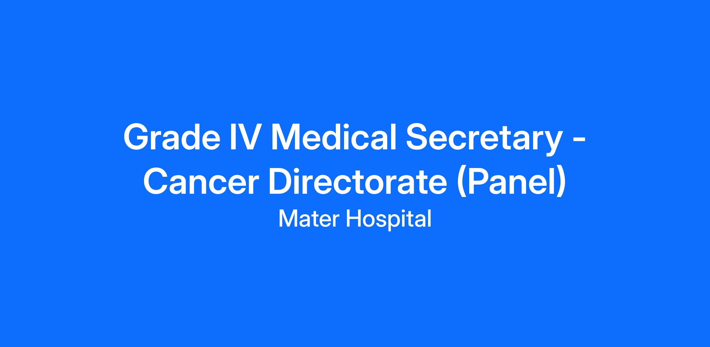 Applicants are invited from suitably experienced and qualified candidates for a Grade IV Medical Secretary - Cancer Directorate Panel for Temporary contracts on a full time and part time basis. Candidates who are successful at interview stage will be placed on a panel from which future Temporary Grade IV Medical Secretary - Cancer Directorate vacancies may be filled.