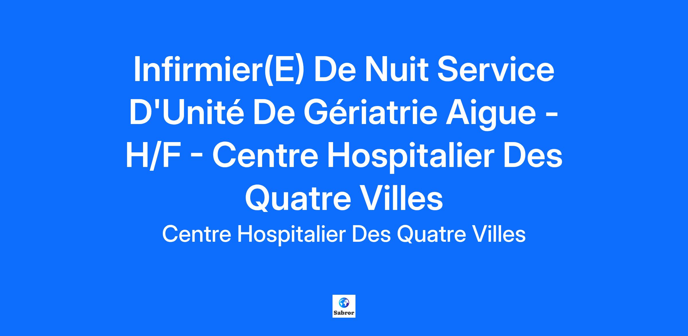 Le Centre Hospitalier des Quatre Villes (92) est un établissement dynamique de 600 lits répartis sur 3 sites dans les villes de Sèvres et de Saint Cloud. Il est établissement support du GHT 92. Le CH4V recrute un(e) Infirmier(e) de nuit pour son service d'Unité de Gériatrie Aigue, site de Sèvres.