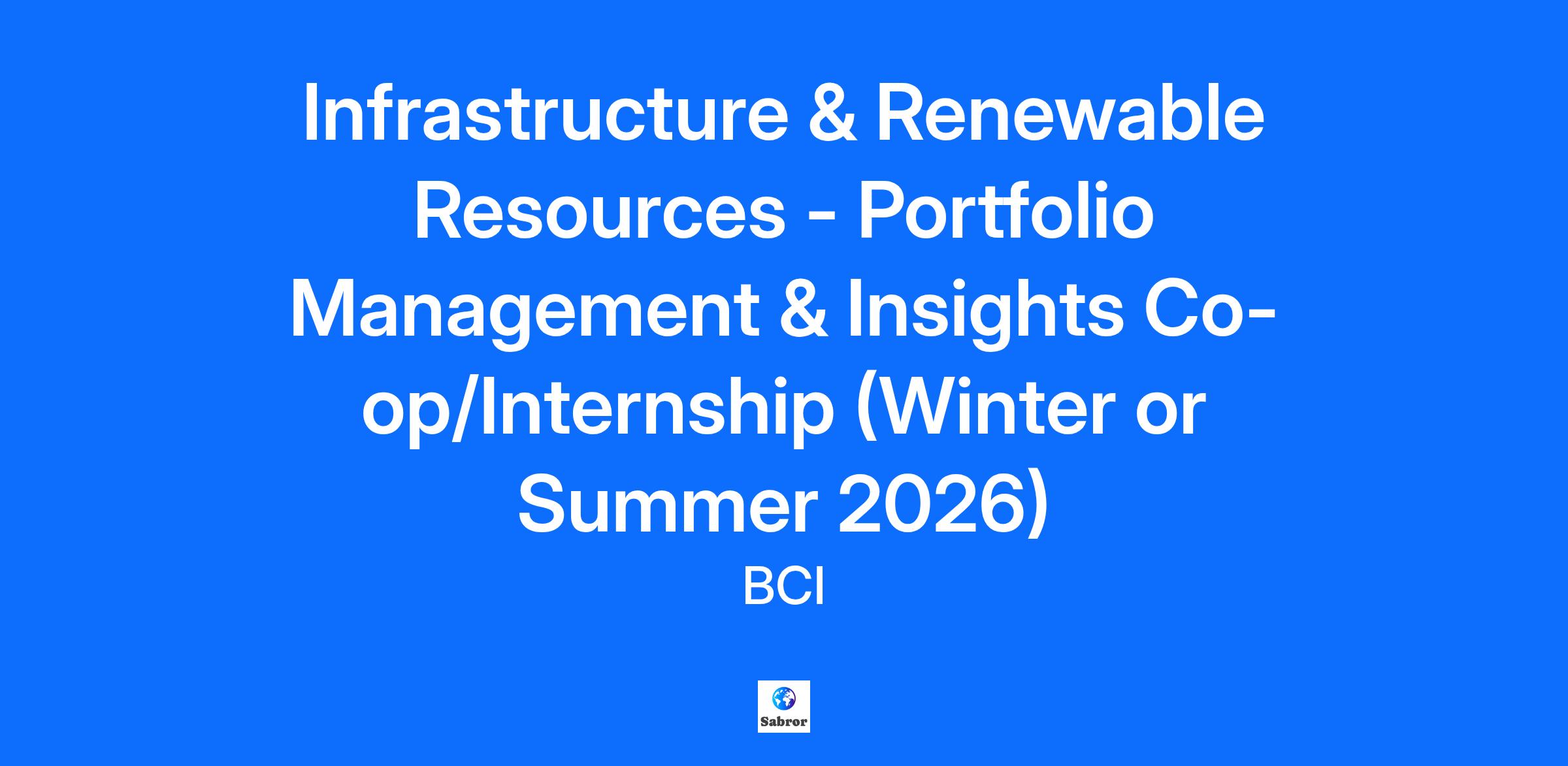 Closing date: October 2, 2025 Use your critical thinking skills in a fast-growing company where you can have an impact. The British Columbia Investment Management Corporation (BCI) is currently seeking a Portfolio Management and Insights Co-op Student/Intern for the Winter 2026 (January to April) or Summer 2026 (May to August) terms to support the Infrastructure and Renewable Resources department. If you are a highly motivated, team player who can handle multiple projects and are interested in developing your professional career and learning more about driving sustainable growth, accelerating innovation and operating on a global scale, this is the opportunity for you! WHAT YOU NEED TO KNOW BCI manages a globally diversified portfolio of gross assets valued at $295.0 billion and is one of Canada’s largest institutional investors. We invest globally to support pension and other funds for more than 30 clients based in British Columbia. We are proud to have been chosen as one of Canada’s Top 100 Employers and BC’s Top Employers. These national and provincial competitions recognize employers who offer exceptional workplaces for their employees. WHO YOU WILL WORK WITH The I&RR team invests globally in private infrastructure businesses that provide stable long-term results. BCI’s I&RR portfolio has more than $30 billion in AUM and ranks as the eleventh largest institutional infrastructure investor globally. The portfolio spans a range of sectors including utilities, transportation, and telecommunications as well as tangible assets in timberland and agriculture. I&RR seeks meaningful investments in private companies enabling an active governance approach. The team invests in a variety of capacities including as a sole sponsor, co-investor, and very selectively through externally managed funds. In these capacities, the team seeks to take an active oversight role built on a foundation of trusted relationships with all stakeholders and a commitment to long-term value creation. WHAT YOU WILL BE DOING Preparing analyses to support the monitoring of the portfolio Preparing presentation materials for I&RR portfolio reviews and client meetings; delivering presentations in group settings Conducting quantitative and qualitative analysis on the I&RR portfolio's performance Collaborating with cross-functional teams and stakeholders, including other I&RR teams and departments within the organization to execute on or potentially lead operational projects and initiatives Supporting ad hoc research and briefing requests IDEAL CANDIDATE Has a passion for investing and finance Demonstrates natural curiosity, an inquisitive mindset, and an eagerness to learn A team player who has the drive to continue learning, excel, and grow in a team oriented and dynamic environment Demonstrates a strong work ethic and displays initiative by doing whatever it takes to deliver value above and beyond the job description WHAT WE OFFER Training and mentorship to develop your knowledge and professional skill sets that are required to succeed in the industry Be a valued part of a team and work culture that is down to earth, values your perspective and rewards transparency and accountability Exposure to some of the most talented, approachable, and inspiring people in the industry Time to connect and build your network with other interns and BCI professionals that will contribute to your professional network and future career opportunities Potential work term extensions and career opportunities The ability to opt-in for access to Dialogue, a user-friendly app that offers virtual primary care, employee and family services, and mental health supports Time to connect with co-op students & interns at BCI – build your network and shared learning 2 paid days per year for volunteering Competitive pay: $2,745.00 gross bi-weekly + vacation leave paid based on 6% of salary Travel: if coming to Victoria for this work term, BCI will provide a fixed-rate travel allowance based on your location THE DETAILS Work term: Winter (January to April 2026) or Summer (May to August 2026) Department: Infrastructure & Renewable Resources Office Location: 750 Pandora Avenue, Victoria, BC Spend your off hours exploring beautiful Victoria and Vancouver Island All co-ops/internships will need to be completed in person at our Victoria office with the option to work one day per week from home. Please note, some positions are not eligible for hybrid work. HOW TO APPLY Apply directly to the Infrastructure & Renewable Resources – Portfolio Management & Insights Co-op/Internship posting on our careers page https://bci.wd10.myworkdayjobs.com/BCI_Careers Application deadline: October 2, 2025 at 11:59pm PST Please include a cover letter, resume, and transcripts (unofficial transcript will suffice) Note: We welcome applications from all qualified candidates who are interested in applying for this role. You will need to be legally authorized to work in the country where this job is located. If you currently do not have authorization or if your work permit, study permit, or visa has restrictions or is due to expire during the work term, you may not be eligible for this opportunity. At BCI, we value diversity and believe in fostering an inclusive culture where all employees can be successful. We are performance and client focused and value integrity; if you share these values, we want to know you. We recognize that some skills can be learned on the job and encourage all to apply. If you require an accommodation for the recruitment process (including alternate formats of materials, accessible meeting rooms or other accommodations), contact us at co-op@bci.ca. We would like to hear from you! To learn more about us, visit our BCI website With our values as our anchor, it’s our people who create the environment we work in each day. BCI has been recognized as one of Canada’s Top 100 Employers – for the sixth consecutive year – and has built programs and benefits 