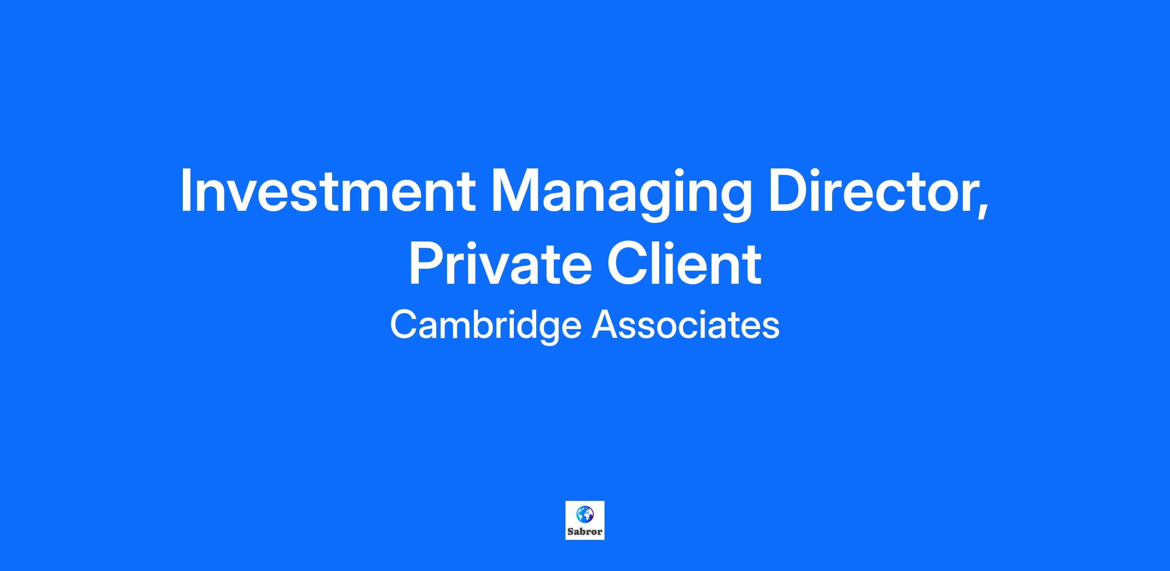 Firm Overview: Cambridge Associates (“CA”) is a leading global investment firm. CA’s goal is to help endowments & foundations, pension plans, and ultra-high net worth private clients implement and manage custom investment portfolios that generate outperformance so that they can maximize their impact on the world. Cambridge Associates delivers a range of services, including outsourced CIO, non-discretionary portfolio management, and investment consulting. Headquartered in Boston, Massachusetts, CA has offices in key markets in North America, the United Kingdom, Europe, Asia, and Oceania. Our worldwide teams ensure our clients benefit from decades of global presence, local expertise, and relationships with the top global investment managers across the world. For more information, please visit www.cambridgeassociates.com. Job Description Summary: We are seeking to hire an experienced investor at the Managing Director level who will work as part of an investment team to manage private client assets, constructing and managing client portfolios and communicating timely information to clients. Client portfolios range in size from €100 million to several billion Euros. Our investment teams function as the non-discretionary or discretionary investment manager for families in multiple jurisdictions throughout Europe. They are guided by these objectives: · Generate top decile/quartile investment performance · Maintain high client satisfaction · Develop the next generation of talent The Managing Director will serve as a senior investment leader on the team, responsible for day-to-day oversight of investment portfolios, team management, and client engagement. Focus areas include leading client relationships (both discretionary and non-discretionary) interacting directly with key decision makers (family members, Board or IC members, Family Office staff and outside advisors), driving investment strategy and asset allocation, investment manager selection and evaluation, risk management, and investment performance monitoring. The Managing Director is also responsible for the management and development of the broader investment team. In addition to their work with existing clients, the Managing Director will partner with Global Client Solutions to pursue new client relationships. Responsibilities regarding new business development include building referral networks through strong work with existing clients and related outside advisors, partnering with business development professionals to qualify prospective clients, and leading pitches in conjunction with other investment team members. Job Description: RESPONSIBILITIES Lead investment team in creating and developing diversified portfolios to meet customized client objectives Select and evaluate investment managers for all asset classes Work with and present directly to clients; develop robust relationships with sophisticated clients, GPs, and centers of influence Develop and implement investment objectives, policies, and asset allocations for complex portfolios and trust structures Represent Cambridge Associates externally through marketing presentations, conferences and other business development opportunities Provide mentorship and leadership of the investment team, fostering a culture of excellence, innovation, and continuous improvement QUALIFICATIONS BA/BS required. An MBA or CFA strongly preferred Minimum of 20 years of investment experience ideally at an investment firm, a large institutional investor, or family office Well-developed network in the family office community Exceptional communication and negotiation skills with clients – ability to break down complex concepts, strong presence, careful listening, ability to adapt in the moment to concerns expressed, conviction articulating a path forward Deep investment acumen and capital markets experience; skilled at identifying and evaluating managers and building resilient relationships Commercially successful in building and retaining books of business Must be based in London Proficiency in one or more European languages preferred Employees of Cambridge Associates Ltd. or an affiliated firm, are prohibited from employment or other association with any company, organization, business, or other entity that is involved in any way with the securities or financial services industry except for those entities that are directly affiliated with Cambridge Associates Ltd. Employees are prohibited from acting as a Trustee or Director of, or accepting a similar position of responsibility with, any entity that is a client of or directly affiliated with a client of Cambridge Associates Ltd. or any of its affiliated companies without prior written consent from the Chief Compliance Officer of Cambridge Associates Ltd. Employees are prohibited from serving on the investment or finance committee of any company or organization with investable funds, or likely to develop investable funds, without prior written consent from the Chief Compliance Officer of Cambridge Associates Ltd. If applying for the role, you need to inform the Recruiter if there are any potential conflicts with the above. The firm is committed to the concept and practice of equal employment opportunity and will not discriminate against any employee or applicant on the basis of race, color, religion, age, sex, national origin, sexual orientation, gender identity, disability, or veteran status. It is expected that all employees will follow a similar policy toward their co-workers. Since our founding in 1973, we have been a market leader in building diversified investment portfolios. With 13 offices around the globe and a world-class network of managers, we offer the scale, resources, and networks of a global firm, coupled with the trust, independence, and personal attention of a boutique firm. Introduce yourself to our recruiters and we'll get in touch if there's a role that seems like a good match. Wherever you are in your career journey