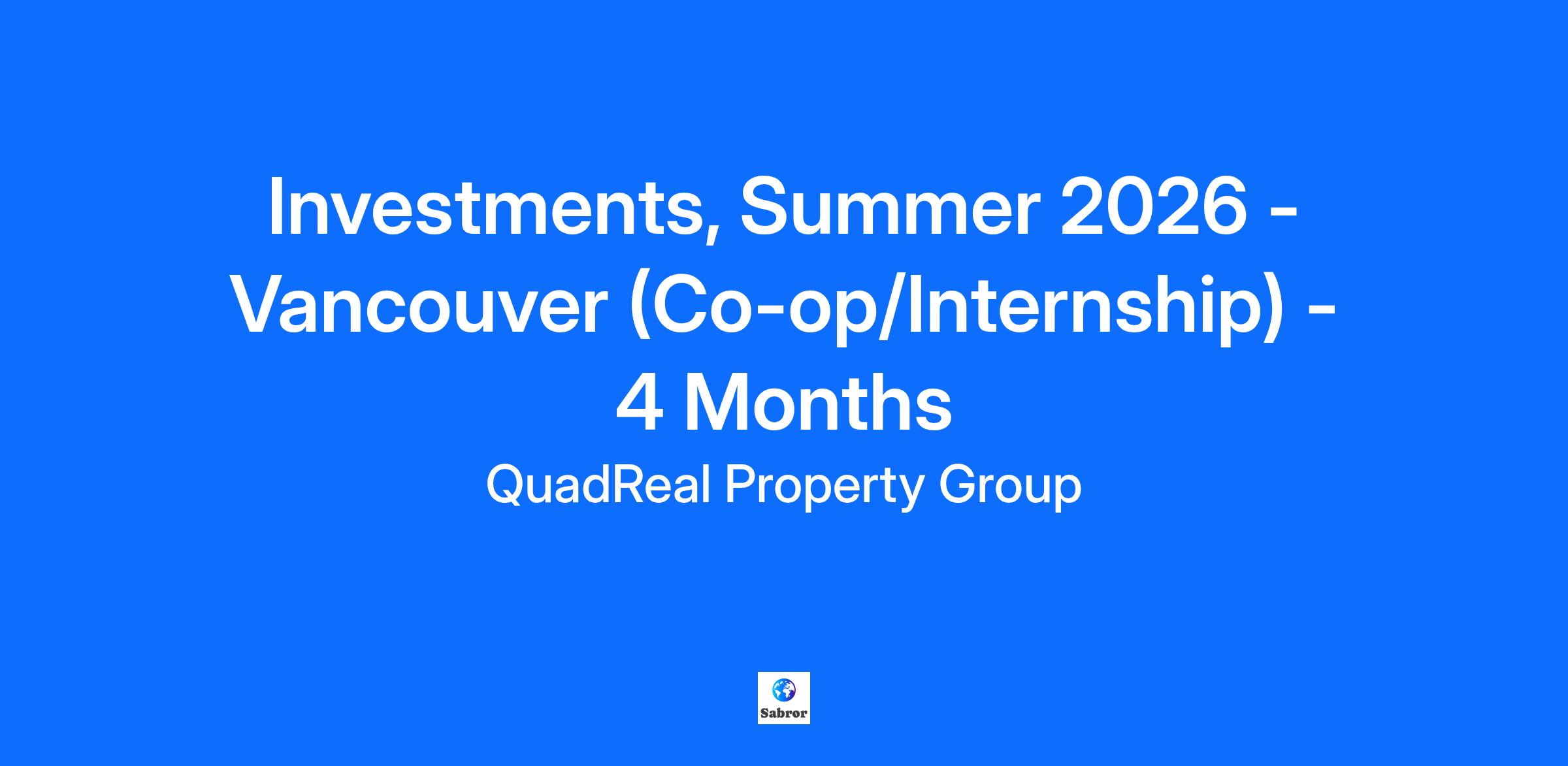 About QuadReal Property Group QuadReal Property Group is a global real estate investment, operating and development company headquartered in Vancouver, British Columbia. Its assets under management are $94 billion. From its foundation in Canada as a full-service real estate operating company, QuadReal has expanded its capabilities to invest in equity and debt in both the public and private markets. QuadReal invests directly, via programmatic partnerships and through operating platforms in which it holds an ownership interest. QuadReal seeks to deliver strong investment returns while creating sustainable environments that bring value to the people and communities it serves. Now and for generations to come. QuadReal: Excellence lives here. www.quadreal.com We are committed to providing our Co-ops/Interns with a student experience that provides a supportive and engaging learning environment while developing skills and business acumen. Students will have the opportunity to participate in a variety of experiences including our Corporate Speaker Series, Fireside Chats, Volunteer opportunities and Networking events. Eligibility Note: To qualify for a student (Co-op/Internship) opportunity, students must be enrolled in their academic studies at a post-secondary institution (university/college) and must be returning to school after completion of their work term with QuadReal. If you are a student registered in an official co-op program at your post-secondary institution and completion of a final work term is a mandatory component for you to graduate, you are eligible to apply with the understanding that you will leave QuadReal at the end of your work term or have the possibility to be considered for full-time opportunities. Based in Vancouver, the Co-op/ Intern, Investments, will report to the Director, Investments, and support QuadReal’s Development & Investment team. The intern will assist the team in evaluating and reporting the performance of the investment portfolio, conducting acquisition and disposition underwriting, managing transactions and joint venture relationships, executing strategies for the development pipeline and producing investment memorandums, letters of recommendation, research reports, brochures and studies to drive decision making. What We Offer: An organization and leaders that support your development through meaningful work experience A Student Mentorship Program designed to provide 1:1 support throughout your experience Opportunities to build your industry knowledge through Corporate Speaker Series & Fireside Chats Giving back to community with your peers and team members through volunteering events Opportunities to build long lasting industry and professional relationships What You Will Experience: Work with the investment teams to prepare return calculations and analysis for potential transactions, including the creation of cashflow models to anticipate future performance and the presentation of financial modelling outputs and conclusions Perform market research for investment opportunities, evaluate past investment financial performance, gather data on competitor – or other comparable – product, and help interpret the economic backdrop behind investments Track market data pertaining to real estate investments within the BC region, aiming to create a comprehensive database for use by the investment teams Assist in the creation of approval memorandums for the purposes of new acquisitions, development & construction of existing development assets within the development pipeline, and disposition of non-strategic assets both within the income producing and development portfolio Assist in periodic development updates, providing support to the development and portfolio management teams in creating new cashflow forecasts and budgetary inputs Analyze and review quarterly reports, financial statements and investment documents Partner with colleagues to prepare internal reporting using your strong writing and presentation acumen to summarize portfolio performance and deliver insight for key stakeholders, including QuadReal’s Board of Directors and senior management teams What You Will Bring: Currently enrolled in an academic program, preferably in Real Estate, Finance, Mathematics/Statistics or Economics. Strong quantitative and analytical skills; detail-oriented and proficient in building and handling complicated data sets Excellent communication and presentation skills; demonstrates an ability to effectively communicate and present results that articulate key themes and messages An ability to think critically and independently complete tasks without step-by-step instructions A very strong work ethic Strong interpersonal skills and an ability to professionally build relationships with peers and other team members Advanced knowledge of Excel, PowerPoint and Word; knowledge of Argus Enterprise a plus Previous experience working within a real estate company (investments, asset management or development), real estate brokerage or advisory firm, appraisal firm, or real estate lender is desirable. A strong interest in developing a career within real estate and learning how to invest in real estate assets is essential Don’t have all of the above skills? Don’t worry. We still want to hear from you! The expected hourly rate for this role is $28. #LI-DNP Note to Recruiters: QuadReal does not accept unsolicited resumes from any source other than directly from a candidate. Any unsolicited resumes sent to QuadReal, directly or indirectly, will be considered QuadReal property. QuadReal will not pay a fee for any placement resulting from the receipt of an unsolicited resume. A recruiting agency must first have a valid, written and fully executed agency agreement contract for engaged services to submit resumes. QuadReal will provide reasonable accommodation at any time throughout the hiring process for applicants with disabilities or for those needing job postings in an alternate
